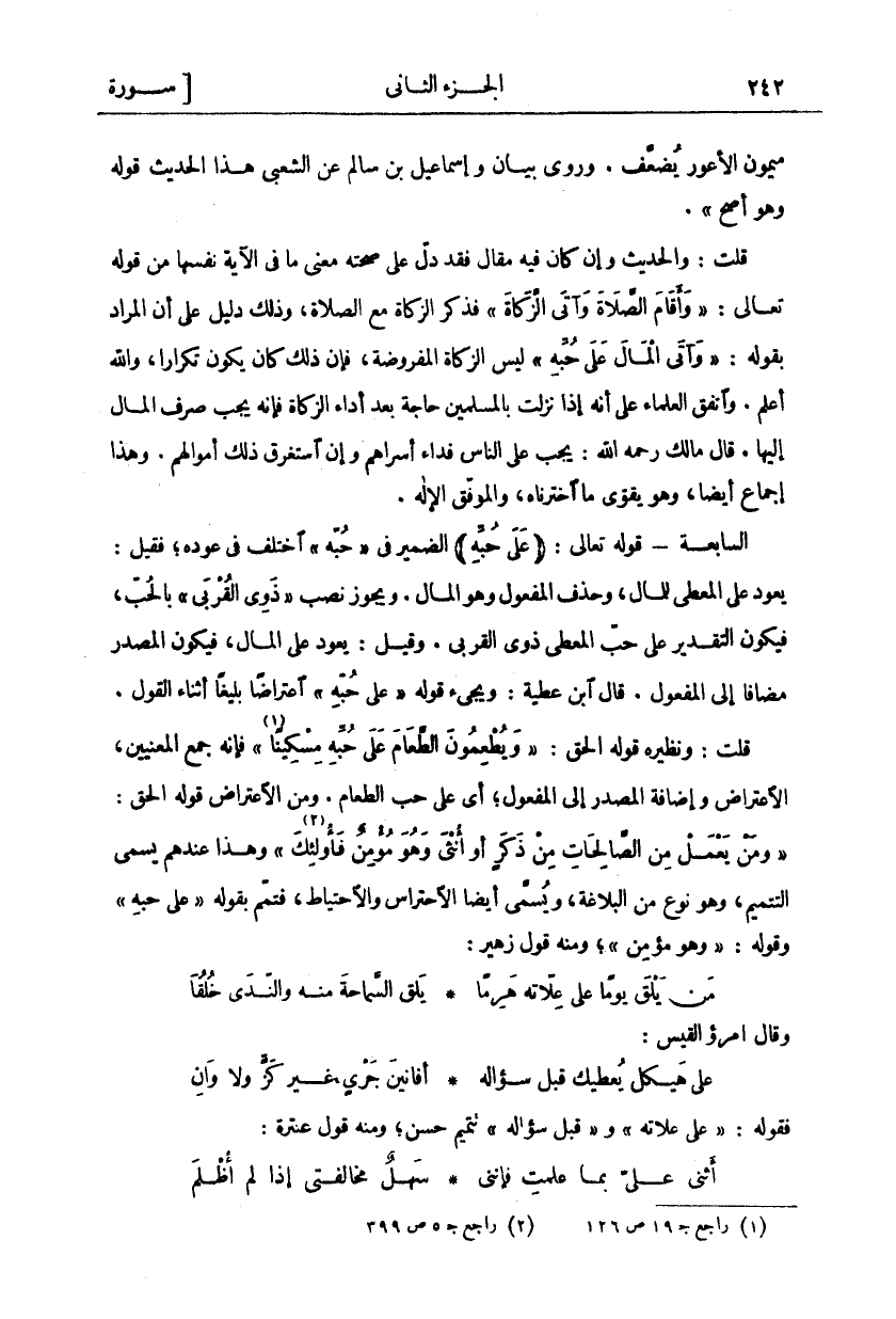 مَيْمُونٌ الْأَعْوَرُ يُضَعَّفُ. وَرَوَى بَيَانُ وَإِسْمَاعِيلُ بْنُ سَالِمٍ عَنِ الشَّعْبِيِّ هَذَا الْحَدِيثَ قَوْلَهُ وَهُوَ أَصَحُّ". قُلْتُ: وَالْحَدِيثُ وَإِنْ كَانَ فِيهِ مَقَالٌ فَقَدْ دَلَّ عَلَى صِحَّتِهِ مَعْنَى مَا فِي الْآيَةِ نَفْسِهَا مِنْ قَوْلِهِ تَعَالَى:" وَأَقامَ الصَّلاةَ وَآتَى الزَّكاةَ" فَذَكَرَ الزَّكَاةَ مَعَ الصَّلَاةِ، وَذَلِكَ دَلِيلٌ عَلَى أَنَّ الْمُرَادَ بِقَوْلِهِ:" وَآتَى الْمالَ عَلى حُبِّهِ" لَيْسَ الزَّكَاةَ الْمَفْرُوضَةَ، فَإِنَّ ذَلِكَ كَانَ يَكُونُ تَكْرَارًا، وَاللَّهُ أَعْلَمُ. وَاتَّفَقَ الْعُلَمَاءُ عَلَى أَنَّهُ إِذَا نَزَلَتْ بِالْمُسْلِمِينَ حَاجَةٌ بَعْدَ أَدَاءِ الزَّكَاةِ فَإِنَّهُ يَجِبُ صَرْفُ الْمَالِ إِلَيْهَا. قَالَ مَالِكٌ رَحِمَهُ اللَّهُ: يَجِبُ عَلَى النَّاسِ فِدَاءُ أَسْرَاهُمْ وَإِنِ اسْتَغْرَقَ ذَلِكَ أَمْوَالَهُمْ. وَهَذَا إِجْمَاعٌ أَيْضًا، وَهُوَ يُقَوِّي مَا اخْتَرْنَاهُ، وَالْمُوَفِّقُ الْإِلَهُ. السَّابِعَةُ- قَوْلُهُ تَعَالَى:" عَلى حُبِّهِ" الضَّمِيرُ فِي" حُبِّهِ" اخْتُلِفَ فِي عَوْدِهِ، فَقِيلَ: يَعُودُ عَلَى الْمُعْطِي لِلْمَالِ، وَحُذِفَ الْمَفْعُولُ وَهُوَ الْمَالُ. ويجوز نصب" ذَوِي الْقُرْبى " بالحلب، فَيَكُونُ التَّقْدِيرُ عَلَى حُبِّ الْمُعْطِي ذَوِي الْقُرْبَى. وَقِيلَ: يَعُودُ عَلَى الْمَالِ، فَيَكُونُ الْمَصْدَرُ مُضَافًا إِلَى الْمَفْعُولِ. قَالَ ابْنُ عَطِيَّةَ: وَيَجِيءُ قَوْلُهُ" عَلى حُبِّهِ" اعْتِرَاضًا بَلِيغًا أَثْنَاءَ الْقَوْلِ. قُلْتُ: ونطيره قَوْلُهُ الْحَقُّ:" وَيُطْعِمُونَ الطَّعامَ عَلى حُبِّهِ مِسْكِيناً