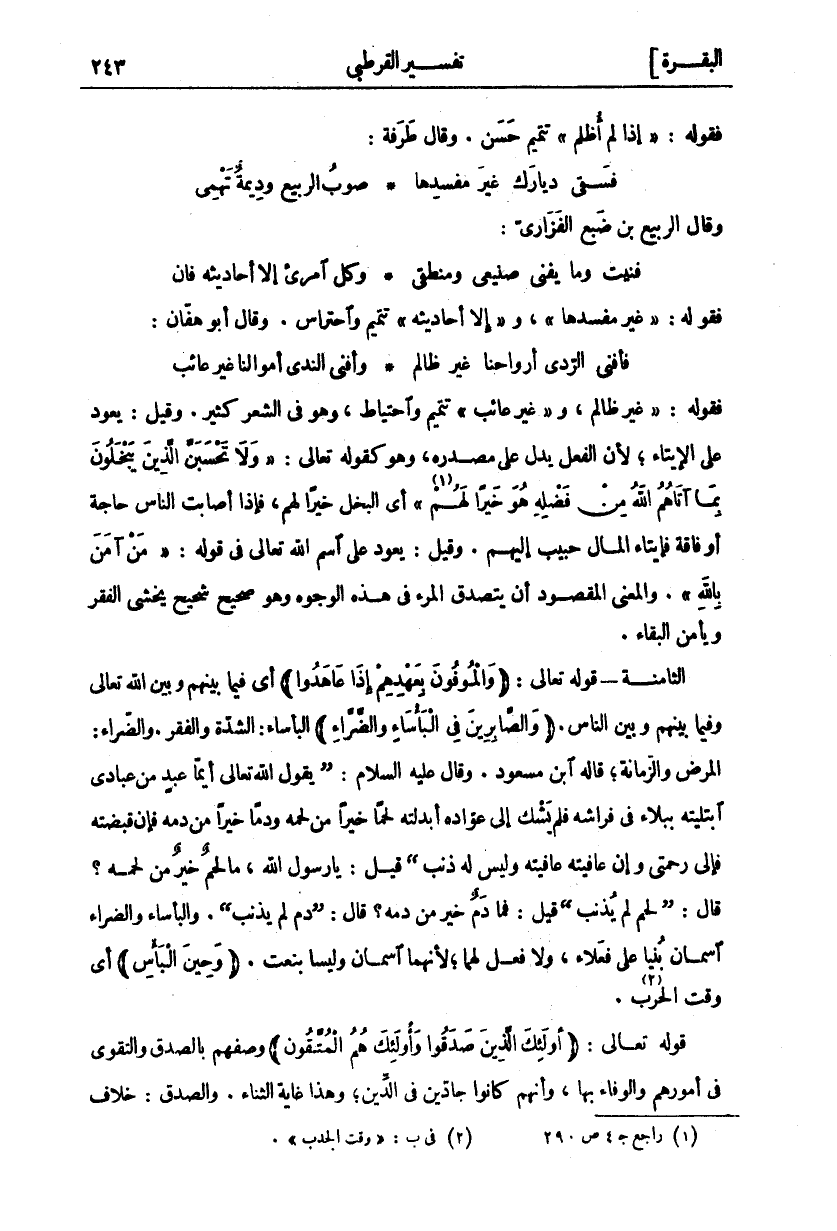 فَقَوْلُهُ:" غَيْرَ ظَالِمٍ، وَ" غَيْرَ عَائِبٍ" تَتْمِيمٌ وَاحْتِيَاطٌ، وَهُوَ فِي الشِّعْرِ كَثِيرٌ. وَقِيلَ: يَعُودُ عَلَى الْإِيتَاءِ، لِأَنَّ الْفِعْلَ يَدُلُّ عَلَى مَصْدَرِهِ، وَهُوَ كَقَوْلِهِ تَعَالَى:" وَلا يَحْسَبَنَّ الَّذِينَ يَبْخَلُونَ بِما آتاهُمُ اللَّهُ مِنْ فَضْلِهِ هُوَ خَيْراً لَهُمْ «١» " أَيِ الْبُخْلُ خَيْرًا لَهُمْ، فَإِذَا أَصَابَتِ النَّاسَ حَاجَةٌ أَوْ فَاقَةٌ فَإِيتَاءُ الْمَالِ حَبِيبٌ إِلَيْهِمْ. وَقِيلَ يَعُودُ عَلَى اسْمِ اللَّهِ تَعَالَى فِي قَوْلِهِ:" مَنْ آمَنَ بِاللَّهِ". وَالْمَعْنَى الْمَقْصُودَ أَنْ يَتَصَدَّقَ الْمَرْءُ فِي هَذِهِ الْوُجُوهِ وَهُوَ صَحِيحٌ شَحِيحٌ يَخْشَى الْفَقْرَ وَيَأْمَنُ الْبَقَاءَ. الثَّامِنَةُ- قَوْلُهُ تَعَالَى:" وَالْمُوفُونَ بِعَهْدِهِمْ إِذا عاهَدُوا" أَيْ فِيمَا بَيْنَهُمْ وَبَيْنَ اللَّهِ تَعَالَى وَفِيمَا بَيْنَهُمْ وَبَيْنَ النَّاسِ." وَالصَّابِرِينَ فِي الْبَأْساءِ وَالضَّرَّاءِ" الْبَأْسَاءُ: الشِّدَّةُ وَالْفَقْرُ. وَالضَّرَّاءُ: الْمَرَضُ وَالزَّمَانَةُ، قَالَهُ ابْنُ مَسْعُودٍ. وَقَالَ عَلَيْهِ السَّلَامُ: (يَقُولُ اللَّهَ تَعَالَى أَيُّمَا عَبْدٍ مِنْ عِبَادِي ابْتَلَيْتُهُ بِبَلَاءٍ فِي فِرَاشِهِ فَلَمْ يَشْكُ إِلَى عُوَّادِهِ أَبْدَلْتُهُ لَحْمًا خَيْرًا مِنْ لَحْمِهِ وَدَمًا خَيْرًا مِنْ دَمِهِ فَإِنْ قَبَضْتُهُ فَإِلَى رَحْمَتِي وَإِنْ عَافَيْتُهُ عَافَيْتُهُ وَلَيْسَ لَهُ ذَنْبٌ) قِيلَ: يَا رَسُولَ اللَّهِ، مَا لَحْمٌ خَيْرٌ مِنْ لَحْمِهِ؟ قَالَ: (لَحْمٌ لَمْ يُذْنِبْ) قِيلَ: فَمَا دَمٌ خَيْرٌ مِنْ دَمِهِ؟ قَالَ: (دَمٌ لَمْ يذنب) ووالبأساء وَالضَّرَّاءُ اسْمَانِ بُنِيَا عَلَى فَعْلَاءَ، وَلَا فِعْلَ لَهُمَا، لِأَنَّهُمَا اسْمَانِ وَلَيْسَا بِنَعْتٍ." وَحِينَ الْبَأْسِ" أي وقت الحزب «٢». قَوْلُهُ تَعَالَى:" أُولئِكَ الَّذِينَ صَدَقُوا وَأُولئِكَ هُمُ الْمُتَّقُونَ" وَصَفَهُمْ بِالصِّدْقِ وَالتَّقْوَى فِي أُمُورِهِمْ وَالْوَفَاءِ بِهَا، وَأَنَّهُمْ كَانُوا جَادِّينَ فِي الدِّينِ، وَهَذَا غاية الثناء. والصدق: خلاف