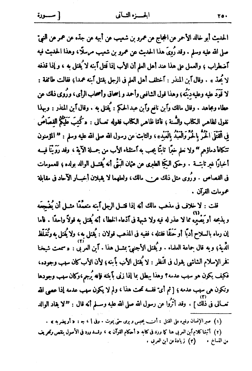 الْحَدِيثَ أَبُو خَالِدٍ الْأَحْمَرُ عَنِ الْحَجَّاجِ عَنْ عَمْرِو بْنِ شُعَيْبٍ عَنْ أَبِيهِ عَنْ جَدِّهِ عَنْ عُمَرَ عَنِ النَّبِيِّ صَلَّى اللَّهُ عَلَيْهِ وَسَلَّمَ. وَقَدْ رُوِيَ هَذَا الْحَدِيثُ عَنْ عَمْرِو بْنِ شُعَيْبٍ مُرْسَلًا، وَهَذَا الْحَدِيثُ فِيهِ اضْطِرَابٌ، وَالْعَمَلُ عَلَى هَذَا عِنْدَ أَهْلِ الْعِلْمِ أَنَّ الْأَبَ إِذَا قَتَلَ ابْنَهُ لَا يُقْتَلُ بِهِ، وَإِذَا قَذَفَهُ لَا يُحَدُّ". وَقَالَ ابْنُ الْمُنْذِرِ: اخْتَلَفَ أَهْلُ الْعِلْمِ فِي الرَّجُلِ يَقْتُلُ ابْنَهُ عَمْدًا، فَقَالَتْ طَائِفَةٌ: لَا قَوَدَ عَلَيْهِ وَعَلَيْهِ دِيَتُهُ، وَهَذَا قَوْلُ الشَّافِعِيِّ وَأَحْمَدَ وَإِسْحَاقَ وَأَصْحَابِ الرَّأْيِ، وَرُوِيَ ذَلِكَ عَنْ عَطَاءٍ وَمُجَاهِدٍ. وَقَالَ مَالِكٌ وَابْنُ نَافِعٍ وَابْنُ عَبْدِ الْحَكَمِ: يُقْتَلُ بِهِ. وَقَالَ ابْنُ الْمُنْذِرِ: وَبِهَذَا نَقُولُ لِظَاهِرِ الْكِتَابِ وَالسُّنَّةِ، فَأَمَّا ظَاهِرُ الْكِتَابِ فَقَوْلُهُ تَعَالَى:" كُتِبَ عَلَيْكُمُ الْقِصاصُ فِي الْقَتْلى الْحُرُّ بِالْحُرِّ وَالْعَبْدُ بِالْعَبْدِ"، وَالثَّابِتُ عَنْ رَسُولِ اللَّهِ صَلَّى اللَّهُ عَلَيْهِ وَسَلَّمَ: (الْمُؤْمِنُونَ تَتَكَافَأُ دِمَاؤُهُمْ) وَلَا نَعْلَمُ خَبَرًا ثَابِتًا يَجِبُ بِهِ اسْتِثْنَاءُ الْأَبِ مِنْ جُمْلَةِ الْآيَةِ، وَقَدْ رَوَيْنَا فِيهِ أَخْبَارًا غَيْرَ ثَابِتَةٍ. وَحَكَى إِلْكِيَا الطَّبَرِيُّ عَنْ عُثْمَانَ الْبَتِّيِّ أَنَّهُ يُقْتَلُ الْوَالِدُ بِوَلَدِهِ، لِلْعُمُومَاتِ فِي الْقِصَاصِ. وَرُوِيَ مِثْلُ ذَلِكَ عَنْ مَالِكٍ، وَلَعَلَّهُمَا لَا يَقْبَلَانِ أَخْبَارَ الْآحَادِ فِي مُقَابَلَةِ عُمُومَاتِ الْقُرْآنِ. قُلْتُ: لَا خِلَافَ فِي مَذْهَبِ مَالِكٍ أَنَّهُ إِذَا قَتَلَ الرَّجُلُ ابْنَهُ مُتَعَمِّدًا مِثْلَ أَنْ يُضْجِعَهُ وَيَذْبَحَهُ أَوْ يَصْبِرَهُ «١» مِمَّا لَا عُذْرَ لَهُ فِيهِ وَلَا شُبْهَةَ فِي ادِّعَاءِ الْخَطَأِ، أَنَّهُ يُقْتَلُ بِهِ قَوْلًا وَاحِدًا. فَأَمَّا إِنْ رَمَاهُ بِالسِّلَاحِ أَدَبًا أَوْ حَنَقًا فَقَتَلَهُ، فَفِيهِ فِي الْمَذْهَبِ قَوْلَانِ: يُقْتَلُ بِهِ، وَلَا يُقْتَلُ بِهِ وَتُغَلَّظُ الدِّيَةُ، وَبِهِ قَالَ جَمَاعَةُ العلماء. ويقتل الا جني بِمِثْلِ هَذَا. ابْنُ الْعَرَبِيِّ «٢»:" سَمِعْتُ شَيْخَنَا فَخْرَ الْإِسْلَامِ الشَّاشِيَّ يَقُولُ فِي النَّظَرِ: لَا يُقْتَلُ الْأَبُ بِابْنِهِ، لِأَنَّ الْأَبَ كَانَ سَبَبَ وُجُودِهِ، فَكَيْفَ يَكُونُ هُوَ سَبَبَ عَدَمِهِ؟ وَهَذَا يَبْطُلُ بِمَا إِذَا زَنَى بِابْنَتِهِ فَإِنَّهُ يُرْجَمُ، وَكَانَ سَبَبُ وُجُودِهَا وَتَكُونُ هِيَ سَبَبَ عَدَمِهِ، [ثُمَّ أَيُّ فِقْهٍ تَحْتَ هَذَا، وَلِمَ لَا يَكُونُ سَبَبَ عَدَمِهِ إِذَا عَصَى اللَّهَ تَعَالَى فِي ذَلِكَ «٣» [. وَقَدْ أَثَرُوا عَنْ رَسُولِ اللَّهِ صَلَّى اللَّهُ عَلَيْهِ وَسَلَّمَ أَنَّهُ قَالَ: (لَا يُقَادُ الوالد