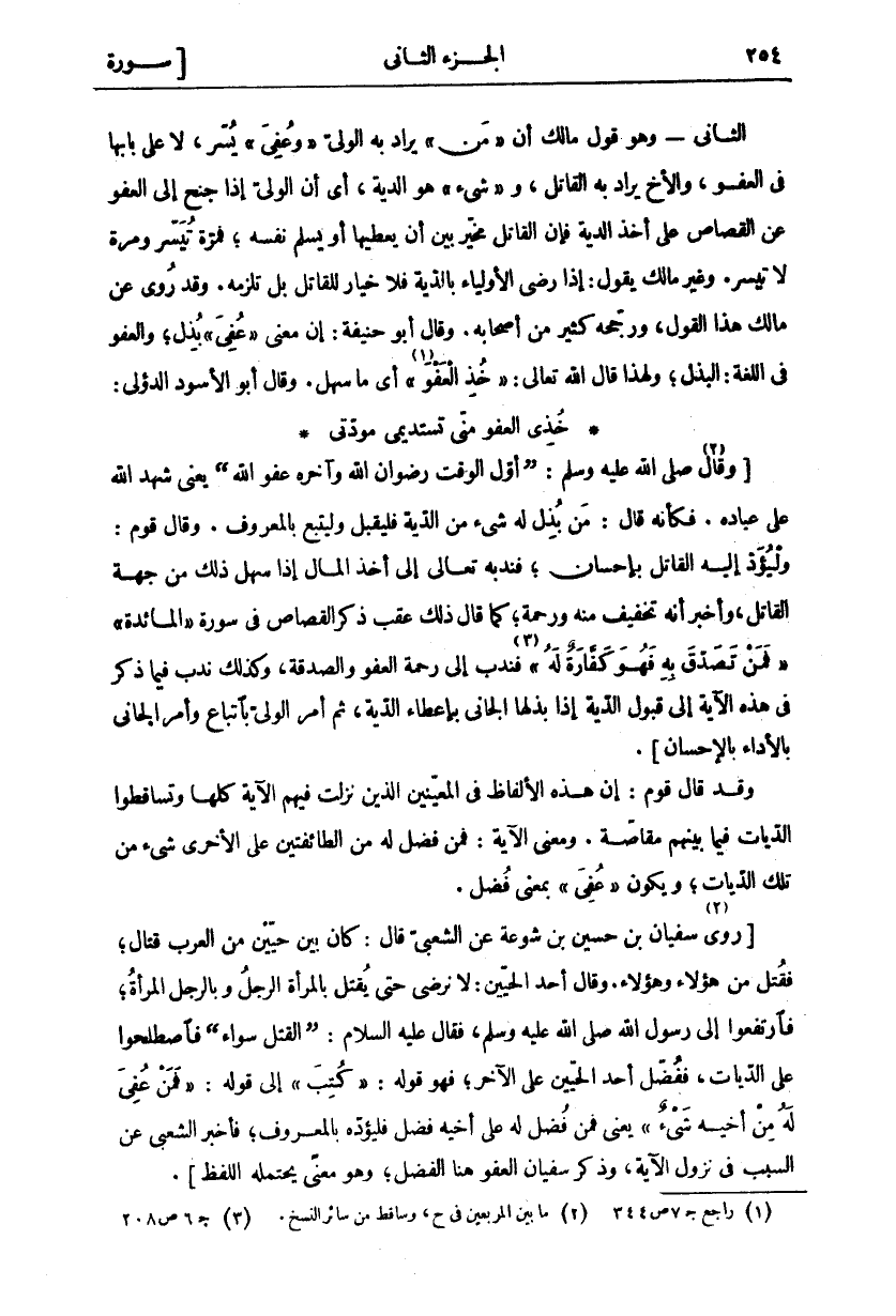 [وَقَالَ «٢» صَلَّى اللَّهُ عَلَيْهِ وَسَلَّمَ: (أَوَّلُ الْوَقْتِ رِضْوَانُ اللَّهِ وَآخِرُهُ عَفْوُ اللَّهِ) يَعْنِي شَهِدَ اللَّهُ عَلَى عباده. فكأنه قال: من بذل له شي مِنَ الدِّيَةِ فَلْيَقْبَلْ وَلْيَتَّبِعْ بِالْمَعْرُوفِ. وَقَالَ قَوْمٌ: وَلْيُؤَدِّ إِلَيْهِ الْقَاتِلُ بِإِحْسَانٍ، فَنَدَبَهُ تَعَالَى إِلَى أَخْذِ الْمَالِ إِذَا سُهِّلَ ذَلِكَ مِنْ جِهَةِ الْقَاتِلِ، وَأَخْبَرَ أَنَّهُ تَخْفِيفُ مِنْهُ وَرَحْمَةٌ، كَمَا قَالَ ذَلِكَ عَقِبَ ذِكْرِ الْقِصَاصِ فِي سُورَةِ الْمَائِدَةِ فَمَنْ تَصَدَّقَ بِهِ فَهُوَ كَفَّارَةٌ لَهُ «٣» " [المائدة: ٤٥] فَنَدَبَ إِلَى رَحْمَةِ الْعَفْوِ وَالصَّدَقَةِ، وَكَذَلِكَ نَدَبَ فِيمَا ذَكَرَ فِي هَذِهِ الْآيَةِ إِلَى قَبُولِ الدِّيَةِ إِذَا بَذَلَهَا الْجَانِي بِإِعْطَاءِ الدِّيَةِ، ثُمَّ أَمَرَ الْوَلِيَّ بِاتِّبَاعٍ وَأَمَرَ الْجَانِي بِالْأَدَاءِ بِالْإِحْسَانِ. وَقَدْ قَالَ قَوْمٌ: إِنَّ هَذِهِ الْأَلْفَاظَ فِي الْمُعَيَّنِينَ الَّذِينَ نَزَلَتْ فِيهِمُ الْآيَةُ كُلُّهَا وَتَسَاقَطُوا الدِّيَاتِ فِيمَا بَيْنَهُمْ مُقَاصَّةً. وَمَعْنَى الْآيَةِ: فَمَنْ فضل له من الطائفتين على الأخرى شي مِنْ تِلْكَ الدِّيَاتِ، وَيَكُونُ" عُفِيَ" بِمَعْنَى فُضِلَ. [رَوَى «٤» سُفْيَانُ بْنُ حُسَيْنِ بْنِ شُوعَةَ عَنِ الشَّعْبِيِّ قَالَ: كَانَ بَيْنَ حَيَّيْنِ مِنَ الْعَرَبِ قِتَالٌ، فَقُتِلَ مِنْ هَؤُلَاءِ وَهَؤُلَاءِ. وَقَالَ أَحَدُ الْحَيَّيْنِ: لَا نَرْضَى حَتَّى يُقْتَلَ بِالْمَرْأَةِ الرَّجُلُ وَبِالرَّجُلِ الْمَرْأَةُ، فَارْتَفَعُوا إِلَى رَسُولِ اللَّهِ صَلَّى اللَّهُ عَلَيْهِ وَسَلَّمَ، فَقَالَ عَلَيْهِ السَّلَامُ: (الْقَتْلُ سَوَاءٌ) فَاصْطَلَحُوا عَلَى الدِّيَاتِ، فَفَضَلَ أَحَدُ الْحَيَّيْنِ عَلَى الْآخَرِ، فَهُوَ قَوْلُهُ:" كُتِبَ" إِلَى قَوْلِهِ:" فَمَنْ عُفِيَ لَهُ مِنْ أَخِيهِ شَيْءٌ" يَعْنِي فَمَنْ فُضِلَ لَهُ عَلَى أَخِيهِ فَضْلٌ فَلْيُؤَدِّهِ بِالْمَعْرُوفِ، فَأَخْبَرَ الشَّعْبِيُّ عَنِ السَّبَبِ فِي نُزُولِ الْآيَةِ، وَذَكَرَ سُفْيَانُ الْعَفْوَ هُنَا الْفَضْلَ، وَهُوَ معنى يحتمله اللفظ].