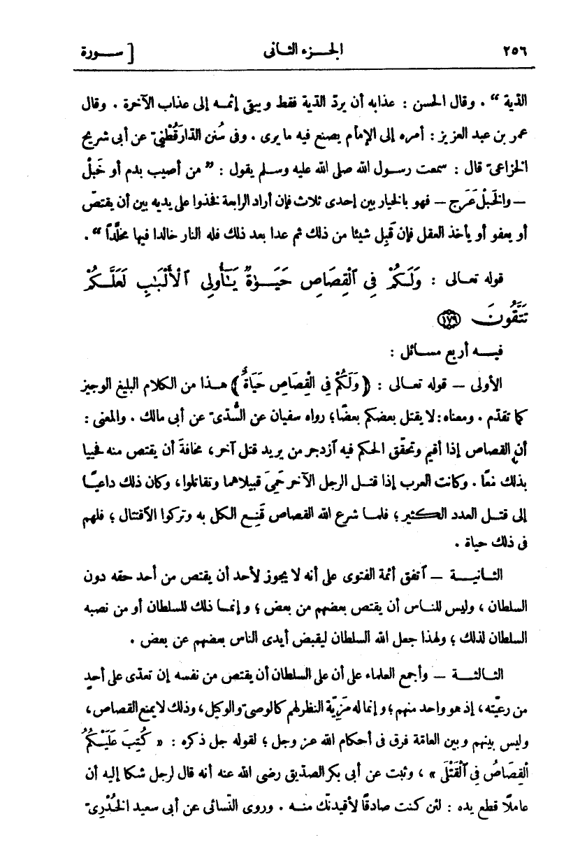 فِيهِ أَرْبَعُ مَسَائِلَ: الْأُولَى- قَوْلُهُ تَعَالَى:" وَلَكُمْ فِي الْقِصاصِ حَياةٌ" هَذَا مِنَ الْكَلَامِ الْبَلِيغِ الْوَجِيزِ كَمَا تَقَدَّمَ. وَمَعْنَاهُ: لَا يَقْتُلُ بَعْضُكُمْ بَعْضًا، رَوَاهُ سُفْيَانُ عَنِ السُّدِّيِّ عَنْ أَبِي مَالِكٍ. وَالْمَعْنَى: أَنَّ الْقِصَاصَ إِذَا أُقِيمَ وَتَحَقَّقَ الْحُكْمُ فِيهِ ازْدُجِرَ مَنْ يُرِيدُ قَتْلَ آخَرَ، مَخَافَةَ أَنْ يُقْتَصَّ مِنْهُ فَحَيِيَا بِذَلِكَ مَعًا. وَكَانَتِ الْعَرَبُ إِذَا قُتِلَ الرَّجُلُ الْآخَرُ حَمِيَ قَبِيلَاهُمَا وَتَقَاتَلُوا، وَكَانَ ذَلِكَ دَاعِيًا إِلَى قَتْلِ الْعَدَدِ الْكَثِيرِ، فَلَمَّا شَرَعَ اللَّهُ الْقِصَاصَ قَنَعَ الْكُلُّ بِهِ وَتَرَكُوا الِاقْتِتَالَ، فَلَهُمْ فِي ذَلِكَ حَيَاةٌ. الثَّانِيَةُ- اتَّفَقَ أَئِمَّةُ الْفَتْوَى عَلَى أَنَّهُ لَا يَجُوزُ لِأَحَدٍ أَنْ يَقْتَصَّ مِنْ أَحَدٍ حَقَّهُ دُونَ السُّلْطَانِ، وَلَيْسَ لِلنَّاسِ أَنْ يَقْتَصَّ بَعْضُهُمْ مِنْ بَعْضٍ، وَإِنَّمَا ذَلِكَ لِسُلْطَانٍ أَوْ مَنْ نَصَّبَهُ السُّلْطَانُ لِذَلِكَ، وَلِهَذَا جَعَلَ اللَّهُ السُّلْطَانَ لِيَقْبِضَ أَيْدِيَ النَّاسِ بَعْضُهُمْ عَنْ بَعْضٍ. الثَّالِثَةُ- وَأَجْمَعَ الْعُلَمَاءُ عَلَى أَنَّ عَلَى السُّلْطَانِ أَنْ يَقْتَصَّ مِنْ نَفْسِهِ إِنْ تَعَدَّى عَلَى أَحَدٍ مِنْ رَعِيَّتِهِ، إِذْ هُوَ وَاحِدٌ مِنْهُمْ، وَإِنَّمَا لَهُ مَزِيَّةُ النَّظَرِ لَهُمْ كَالْوَصِيِّ وَالْوَكِيلِ، وَذَلِكَ لَا يَمْنَعُ الْقِصَاصَ، وَلَيْسَ بَيْنَهُمْ وَبَيْنَ الْعَامَّةِ فَرْقٌ فِي أَحْكَامِ اللَّهِ عَزَّ وَجَلَّ، لِقَوْلِهِ جَلَّ ذِكْرُهُ:" كُتِبَ عَلَيْكُمُ الْقِصاصُ فِي الْقَتْلى "، وَثَبَتَ عَنْ أَبِي بَكْرٍ الصِّدِّيقِ رَضِيَ اللَّهُ عَنْهُ أَنَّهُ قَالَ لِرَجُلٍ شَكَا إِلَيْهِ أَنَّ عَامِلًا قَطَعَ يَدَهُ: لَئِنْ كُنْتَ صَادِقًا لَأُقِيدَنَّكُ مِنْهُ. وَرَوَى النَّسَائِيُّ عَنْ أَبِي سَعِيدٍ الْخُدْرِيِّ