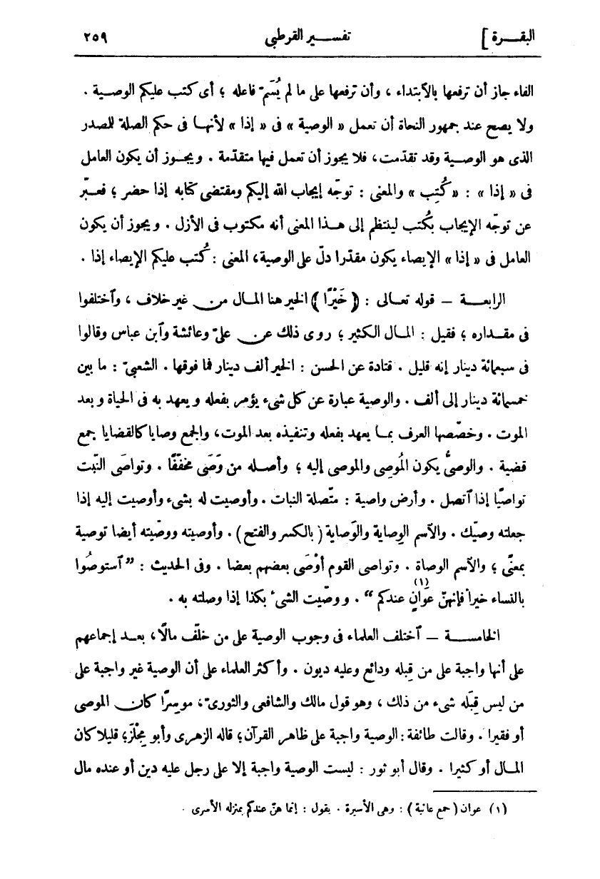 الْفَاءَ جَازَ أَنْ تَرْفَعَهَا بِالِابْتِدَاءِ، وَأَنْ تَرْفَعَهَا عَلَى مَا لَمْ يُسَمَّ فَاعِلُهُ، أَيْ كُتِبَ عَلَيْكُمُ الْوَصِيَّةُ. وَلَا يَصِحُّ عِنْدَ جُمْهُورِ النُّحَاةِ أَنْ تَعْمَلَ" الْوَصِيَّةُ" فِي" إِذا" لِأَنَّهَا فِي حُكْمِ الصِّلَةِ لِلْمَصْدَرِ الَّذِي هُوَ الْوَصِيَّةُ وَقَدْ تَقَدَّمَتْ، فَلَا يَجُوزُ أَنْ تَعْمَلَ فِيهَا مُتَقَدِّمَةً. وَيَجُوزَ أَنْ يَكُونَ الْعَامِلُ فِي" إِذا":" كُتِبَ" وَالْمَعْنَى: تَوَجَّهَ إِيجَابُ اللَّهِ إِلَيْكُمْ وَمُقْتَضَى كِتَابِهِ إِذَا حَضَرَ، فَعَبَّرَ عَنْ تَوَجُّهِ الْإِيجَابِ بِكُتِبَ لِيَنْتَظِمَ إِلَى هَذَا الْمَعْنَى أَنَّهُ مَكْتُوبٌ فِي الْأَزَلِ. وَيَجُوزُ أَنْ يَكُونَ الْعَامِلُ فِي" إِذا" الْإِيصَاءُ يَكُونَ مُقَدَّرًا دَلَّ عَلَى الْوَصِيَّةِ، الْمَعْنَى: كُتِبَ عَلَيْكُمُ الْإِيصَاءُ إِذًا. الرَّابِعَةُ- قَوْلُهُ تَعَالَى:" خَيْراً" الْخَيْرُ هُنَا الْمَالُ مِنْ غَيْرِ خِلَافٍ، وَاخْتَلَفُوا فِي مِقْدَارِهِ، فَقِيلَ: الْمَالُ الْكَثِيرُ، رُوِيَ ذَلِكَ عَنْ عَلِيٍّ وَعَائِشَةَ وَابْنِ عَبَّاسٍ وَقَالُوا سَبْعِمِائَةِ دِينَارٍ إِنَّهُ قَلِيلٌ. قَتَادَةُ عَنِ الْحَسَنِ: الْخَيْرُ أَلْفُ دِينَارٍ فَمَا فَوْقَهَا. الشَّعْبِيُّ مَا بَيْنَ خَمْسِمِائَةِ دِينَارٍ إِلَى أَلْفٍ. وَالْوَصِيَّةُ عِبَارَةٌ عن كل شي يُؤْمَرُ بِفِعْلِهِ وَيُعْهَدُ بِهِ فِي الْحَيَاةِ وَبَعْدَ الْمَوْتِ. وَخَصَّصَهَا الْعُرْفُ بِمَا يُعْهَدُ بِفِعْلِهِ وَتَنْفِيذِهِ بَعْدَ الْمَوْتِ، وَالْجَمْعُ وَصَايَا كَالْقَضَايَا جَمْعُ قَضِيَّةٍ. وَالْوَصِيُّ يَكُونُ الْمُوصِي وَالْمُوصَى إِلَيْهِ، وَأَصْلُهُ مِنْ وَصَى مُخَفَّفًا. وَتَوَاصَى النَّبْتُ تَوَاصِيًا إِذَا اتَّصَلَ. وَأَرْضٌ وَاصِيَةٌ: مُتَّصِلَةُ النَّبَاتِ. وَأَوْصَيْتُ لَهُ بِشَيْءٍ وَأَوْصَيْتُ إِلَيْهِ إِذَا جَعَلْتَهُ وَصِيَّكُ. وَالِاسْمُ الْوِصَايَةُ وَالْوِصَايَةُ (بِالْكَسْرِ وَالْفَتْحِ). وَأَوْصَيْتُهُ وَوَصَّيْتُهُ أَيْضًا تَوْصِيَةً بِمَعْنًى، وَالِاسْمُ الْوُصَاةُ. وَتَوَاصَى الْقَوْمُ أَوْصَى بَعْضُهُمْ بَعْضًا. وَفِي الْحَدِيثِ: (اسْتَوْصُوا بِالنِّسَاءِ خَيْرًا فَإِنَّهُنَّ عَوَانٍ «١» عِنْدَكُمْ). وَوَصَّيْتُ الشَّيْءَ بِكَذَا إِذَا وَصَلْتَهُ بِهِ. الْخَامِسَةُ- اخْتَلَفَ الْعُلَمَاءُ فِي وُجُوبِ الْوَصِيَّةِ عَلَى مَنْ خَلَّفَ مَالًا، بَعْدَ إِجْمَاعِهِمْ عَلَى أَنَّهَا وَاجِبَةٌ عَلَى مَنْ قِبَلَهُ وَدَائِعُ وَعَلَيْهِ دُيُونٌ. وَأَكْثَرُ الْعُلَمَاءِ عَلَى أَنَّ الْوَصِيَّةَ غَيْرُ واجبة على من ليس قبله شي مِنْ ذَلِكَ، وَهُوَ قَوْلُ مَالِكٍ وَالشَّافِعِيِّ وَالثَّوْرِيِّ، مُوسِرًا كَانَ الْمُوصِي أَوْ فَقِيرًا. وَقَالَتْ طَائِفَةٌ: الوصية واجبة على ظاهر القرآن، قال الزهدي وَأَبُو مِجْلَزٍ، قَلِيلًا كَانَ الْمَالُ أَوْ كَثِيرًا. وَقَالَ أَبُو ثَوْرٍ: لَيْسَتِ الْوَصِيَّةُ وَاجِبَةً إِلَّا عَلَى رَجُلٍ عَلَيْهِ دَيْنٌ أَوْ عِنْدَهُ مَالٌ