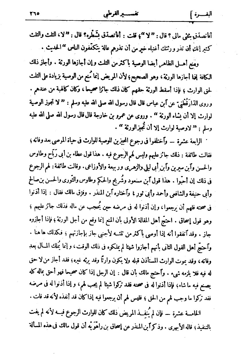 أَفَأَتَصَدَّقُ بِثُلُثَيْ مَالِي؟ قَالَ: (لَا)، قُلْتُ: أَفَأَتَصَدَّقُ بِشَطْرِهِ؟ قَالَ: (لَا، الثُّلُثُ وَالثُّلُثُ كَثِيرٌ إِنَّكَ أن تذر ورثتك أغنياء خير من أن تَذَرَهُمْ عَالَةً يَتَكَفَّفُونَ النَّاسَ) الْحَدِيثَ. وَمَنَعَ أَهْلُ الظَّاهِرِ أَيْضًا الْوَصِيَّةَ بِأَكْثَرِ مِنَ الثُّلُثِ وَإِنْ أجازها الورثة. وأجاز ذلك الكافة إذا أجازا الْوَرَثَةُ، وَهُوَ الصَّحِيحُ، لِأَنَّ الْمَرِيضَ إِنَّمَا مُنِعَ مِنَ الْوَصِيَّةِ بِزِيَادَةٍ عَلَى الثُّلُثِ لِحَقِ الْوَارِثِ، فَإِذَا أَسْقَطَ الْوَرَثَةُ حَقَّهُمْ كَانَ ذَلِكَ جَائِزًا صَحِيحًا، وَكَانَ كَالْهِبَةِ مِنْ عِنْدِهِمْ. وَرَوَى الدَّارَقُطْنِيُّ عَنِ ابْنِ عَبَّاسٍ، قَالَ قَالَ رَسُولُ اللَّهِ صَلَّى اللَّهُ عَلَيْهِ وَسَلَّمَ: (لَا تَجُوزُ الْوَصِيَّةُ لِوَارِثٍ إِلَّا أَنْ يَشَاءَ الْوَرَثَةُ). وَرُوِيَ عَنْ عَمْرِو بْنِ خَارِجَةَ قَالَ قَالَ رَسُولُ اللَّهِ صَلَّى اللَّهُ عَلَيْهِ وَسَلَّمَ: (لَا وَصِيَّةَ لِوَارِثٍ إِلَّا أَنْ تُجِيزَ الْوَرَثَةُ). الرَّابِعَةَ عَشْرَةَ- وَاخْتَلَفُوا فِي رُجُوعِ الْمُجِيزِينَ لِلْوَصِيَّةِ لِلْوَارِثِ فِي حَيَاةِ الْمُوصِي بَعْدَ وَفَاتِهِ، فَقَالَتْ طَائِفَةٌ: ذَلِكَ جَائِزٌ عَلَيْهِمْ وَلَيْسَ لَهُمُ الرُّجُوعُ فِيهِ. هَذَا قَوْلُ عَطَاءِ بْنِ أَبِي رَبَاحٍ وَطَاوُسٍ وَالْحَسَنِ وَابْنِ سِيرِينَ وَابْنِ أَبِي لَيْلَى وَالزُّهْرِيِّ وَرَبِيعَةَ وَالْأَوْزَاعِيِّ. وَقَالَتْ طَائِفَةٌ: لَهُمُ الرُّجُوعُ فِي ذَلِكَ إِنْ أَحَبُّوا. هَذَا قَوْلُ ابْنِ مَسْعُودٍ وَشُرَيْحٍ وَالْحَكَمِ وَطَاوُسٍ وَالثَّوْرِيِّ وَالْحَسَنِ بْنِ صَالِحٍ وَأَبِي حَنِيفَةَ وَالشَّافِعِيِّ وَأَحْمَدَ وَأَبِي ثَوْرٍ، وَاخْتَارَهُ ابْنُ الْمُنْذِرِ. وَفَرَّقَ مَالِكٌ فَقَالَ: إِذَا أَذِنُوا فِي صِحَّتِهِ فَلَهُمْ أَنْ يَرْجِعُوا، وَإِنْ أَذِنُوا لَهُ فِي مَرَضِهِ حِينَ يُحْجَبُ عَنْ مَالِهِ فَذَلِكَ جَائِزٌ عَلَيْهِمْ، وَهُوَ قَوْلُ إِسْحَاقَ. احْتَجَّ أَهْلُ الْمَقَالَةِ الاولى بأن المنع إنما وَقَعَ مِنْ أَجْلِ الْوَرَثَةِ، فَإِذَا أَجَازُوهُ جَازَ. وَقَدِ اتَّفَقُوا أَنَّهُ إِذَا أَوْصَى بِأَكْثَرِ مِنْ ثُلُثِهِ لِأَجْنَبِيٍّ جَازَ بِإِجَازَتِهِمْ، فَكَذَلِكَ هَا هُنَا. وَاحْتَجَّ أَهْلُ الْقَوْلِ الثَّانِي بِأَنَّهُمْ أَجَازُوا شَيْئًا لَمْ يَمْلِكُوهُ فِي ذَلِكَ الْوَقْتِ، وَإِنَّمَا يُمْلَكُ الْمَالُ بَعْدَ وَفَاتِهِ، وَقَدْ يَمُوتُ الْوَارِثُ الْمُسْتَأْذِنُ قَبْلَهُ وَلَا يَكُونُ وَارِثًا وَقَدْ يَرِثُهُ غَيْرُهُ، فَقَدْ أَجَازَ مَنْ لَا حَقَّ لَهُ فِيهِ فلا يلزمه شي. وَاحْتَجَّ مَالِكٌ بِأَنْ قَالَ: إِنَّ الرَّجُلَ إِذَا كَانَ صَحِيحًا فَهُوَ أَحَقُّ بِمَالِهِ كُلِّهِ يَصْنَعُ فِيهِ مَا شَاءَ، فَإِذَا أَذِنُوا لَهُ فِي صِحَّتِهِ فَقَدْ تَرَكُوا شَيْئًا لَمْ يَجِبْ لَهُمْ، وَإِذَا أَذِنُوا لَهُ فِي مَرَضِهِ فَقَدْ تَرَكُوا مَا وَجَبَ لَهُمْ مِنَ الْحَقِّ، فَلَيْسَ لَهُمْ أَنْ يَرْجِعُوا فِيهِ إِذَا كَانَ قَدْ أَنْفَذَهُ لِأَنَّهُ قَدْ فَاتَ. الْخَامِسَةَ عَشْرَةَ- فَإِنْ لَمْ يُنْفِذِ الْمَرِيضُ ذَلِكَ كَانَ لِلْوَارِثِ الرُّجُوعُ فِيهِ لِأَنَّهُ لَمْ يَفُتْ بِالتَّنْفِيذِ، قَالَهُ الْأَبْهَرِيُّ. وَذَكَرَ ابْنُ الْمُنْذِرِ عَنْ إِسْحَاقَ بْنِ رَاهْوَيْهِ أَنَّ قَوْلَ مَالِكٍ فِي هَذِهِ الْمَسْأَلَةِ