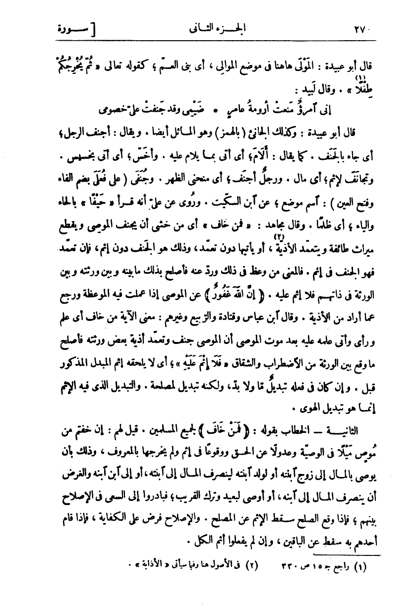 قَالَ أَبُو عُبَيْدَةَ: وَكَذَلِكَ الْجَانِئُ (بِالْهَمْزِ) وَهُوَ الْمَائِلُ أَيْضًا. وَيُقَالُ: أَجْنَفَ الرَّجُلُ، أَيْ جَاءَ بِالْجَنَفِ. كَمَا يُقَالُ: أَلَامَ، أَيْ أَتَى بِمَا يُلَامُ عَلَيْهِ. وَأَخَسَّ، أَيْ أَتَى بِخَسِيسٍ. وَتَجَانَفَ لِإِثْمٍ، أَيْ مَالَ. وَرَجُلٌ أَجْنَفُ، أَيْ مُنْحَنِي الظَّهْرِ. وَجُنَفَى (عَلَى فُعَلَى بِضَمِ الْفَاءِ وَفَتْحِ الْعَيْنِ": اسْمُ مَوْضِعٍ، عَنِ ابْنِ السِّكِّيتِ. وَرُوِيَ عَنْ عَلِيٍّ أَنَّهُ قَرَأَ" حَيْفًا" بِالْحَاءِ وَالْيَاءِ، أَيْ ظُلْمًا. وَقَالَ مُجَاهِدٌ:" فَمَنْ خافَ" أَيْ مَنْ خَشِيَ أَنْ يَجْنَفَ الْمُوصِي وَيَقْطَعَ مِيرَاثَ طَائِفَةٍ وَيَتَعَمَّدَ الْأَذِيَّةَ «٢»، أَوْ يَأْتِيَهَا دُونَ تَعَمُّدٍ، وَذَلِكَ هُوَ الْجَنَفُ دُونَ إِثْمٍ، فَإِنْ تَعَمَّدَ فَهُوَ الْجَنَفُ فِي إِثْمٍ. فَالْمَعْنَى مَنْ وُعِظَ فِي ذَلِكَ وَرُدَّ عَنْهُ فَأَصْلَحَ بِذَلِكَ مَا بَيْنَهُ وَبَيْنَ وَرَثَتِهِ وَبَيْنَ الْوَرَثَةِ فِي ذَاتِهِمْ فَلَا إِثْمَ عَلَيْهِ." إِنَّ اللَّهَ غَفُورٌ" عَنِ الْمُوصِي إِذَا عَمِلَتْ فِيهِ الْمَوْعِظَةُ وَرَجَعَ عَمَّا أَرَادَ مِنَ الْأَذِيَّةِ. وَقَالَ ابْنُ عَبَّاسٍ وَقَتَادَةُ وَالرَّبِيعُ وَغَيْرُهُمْ: مَعْنَى الْآيَةِ مَنْ خَافَ أي علم وراي وأتى علمه بَعْدَ مَوْتِ الْمُوصِي أَنَّ الْمُوصِيَ جَنَفَ وَتَعَمَّدَ أَذِيَّةَ بَعْضِ وَرَثَتِهِ فَأَصْلَحَ مَا وَقَعَ بَيْنَ الْوَرَثَةِ مِنَ الِاضْطِرَابِ وَالشِّقَاقِ" فَلا إِثْمَ عَلَيْهِ"، أَيْ لَا يَلْحَقُهُ إِثْمُ الْمُبَدِّلِ الْمَذْكُورُ قَبْلُ. وَإِنْ كَانَ فِي فِعْلِهِ تَبْدِيلٌ مَا وَلَا بُدَّ، وَلَكِنَّهُ تَبْدِيلٌ لِمَصْلَحَةٍ. وَالتَّبْدِيلُ الَّذِي فِيهِ الْإِثْمُ إِنَّمَا هُوَ تَبْدِيلُ الْهَوَى. الثَّانِيَةُ- الْخِطَابُ بِقَوْلِهِ: فَمَنْ خافَ" لِجَمِيعِ الْمُسْلِمِينَ. قِيلَ لَهُمْ: إِنْ خِفْتُمْ مِنْ مُوصٍ مَيْلًا فِي الْوَصِيَّةِ وَعُدُولًا عَنِ الْحَقِّ وَوُقُوعًا فِي إِثْمٍ وَلَمْ يُخْرِجْهَا بِالْمَعْرُوفِ، وَذَلِكَ بِأَنْ يُوصِيَ بِالْمَالِ إِلَى زَوْجِ ابْنَتِهِ أَوْ لِوَلَدِ ابْنَتِهِ لِيَنْصَرِفَ الْمَالُ إِلَى ابْنَتِهِ، أَوْ إِلَى ابْنِ ابْنِهِ وَالْغَرَضُ أَنْ يَنْصَرِفَ الْمَالُ إِلَى ابْنِهِ، أَوْ أَوْصَى لِبَعِيدٍ وَتَرَكَ الْقَرِيبَ، فَبَادِرُوا إِلَى السَّعْيِ فِي الْإِصْلَاحِ بَيْنَهُمْ، فَإِذَا وَقَعَ الصُّلْحُ سَقَطَ الْإِثْمُ عَنِ الْمُصْلِحِ. وَالْإِصْلَاحُ فَرْضٌ عَلَى الْكِفَايَةِ، فَإِذَا قام أحدهم به سقط عم الباقين، وإن لم يفعلوا أثم الكل.