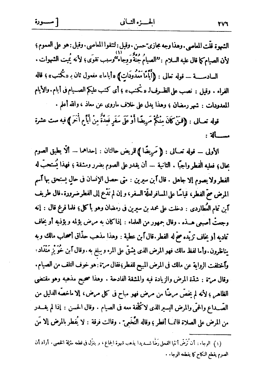 الشَّهْوَةُ قَلَّتِ الْمَعَاصِي. وَهَذَا وَجْهٌ مَجَازِيٌّ حَسَنٌ. وَقِيلَ: لِتَتَّقُوا الْمَعَاصِيَ. وَقِيلَ: هُوَ عَلَى الْعُمُومِ، لِأَنَّ الصِّيَامَ كَمَا قَالَ عَلَيْهِ السَّلَامُ: (الصِّيَامُ جُنَّةٌ وَوِجَاءٌ) «١» وَسَبَبُ تَقْوَى، لِأَنَّهُ يُمِيتُ الشَّهَوَاتِ. السَّادِسَةُ- قَوْلُهُ تَعَالَى:" أَيَّاماً مَعْدُوداتٍ"" أَيَّاماً" مَفْعُولٌ ثَانٍ بِ" كُتِبَ"، قَالَهُ الْفَرَّاءُ. وَقِيلَ: نُصِبَ عَلَى الظَّرْفِ لِ" كُتِبَ"، أَيْ كُتِبَ عَلَيْكُمُ الصِّيَامُ فِي أَيَّامٍ. وَالْأَيَّامُ الْمَعْدُودَاتُ: شَهْرُ رَمَضَانَ، وَهَذَا يَدُلُّ عَلَى خِلَافِ مَا رُوِيَ عَنْ مُعَاذٍ، وَاللَّهُ أَعْلَمُ. قَوْلُهُ تَعَالَى:" فَمَنْ كانَ مِنْكُمْ مَرِيضاً أَوْ عَلى سَفَرٍ فَعِدَّةٌ مِنْ أَيَّامٍ أُخَرَ" فِيهِ سِتَّ عَشْرَةَ مَسْأَلَةً: الْأُولَى- قَوْلُهُ تَعَالَى:" مَرِيضاً" لِلْمَرِيضِ حَالَتَانِ: إِحْدَاهُمَا أَلَّا يُطِيقَ الصَّوْمَ بِحَالٍ، فَعَلَيْهِ الْفِطْرُ وَاجِبًا. الثَّانِيَةُ- أَنْ يَقْدِرَ عَلَى الصَّوْمِ بِضَرَرٍ وَمَشَقَّةٍ، فَهَذَا يُسْتَحَبُّ لَهُ الْفِطْرُ وَلَا يَصُومُ إِلَّا جَاهِلٌ. قَالَ ابْنُ سِيرِينَ: مَتَى حَصَلَ الْإِنْسَانُ فِي حَالٍ يَسْتَحِقُّ بِهَا اسْمَ الْمَرَضِ صَحَّ الْفِطْرُ، قِيَاسًا عَلَى الْمُسَافِرِ لِعِلَّةِ السَّفَرِ، وَإِنْ لَمْ تَدْعُ إِلَى الْفِطْرِ ضرورة. قال طريف ابن تَمَّامٍ الْعُطَارِدِيُّ: دَخَلْتُ عَلَى مُحَمَّدِ بْنِ سِيرِينَ فِي رَمَضَانَ وَهُوَ يَأْكُلُ، فَلَمَّا فَرَغَ قَالَ: إِنَّهُ وَجِعَتْ أُصْبُعِي هَذِهِ. وَقَالَ جُمْهُورُ مِنَ الْعُلَمَاءِ: إِذَا كَانَ بِهِ مَرَضٌ يُؤْلِمُهُ وَيُؤْذِيهِ أَوْ يَخَافُ تَمَادِيَهُ أَوْ يَخَافُ تَزَيُّدَهُ صَحَّ لَهُ الْفِطْرُ. قَالَ ابْنُ عَطِيَّةَ: وَهَذَا مَذْهَبُ حُذَّاقِ أَصْحَابِ مَالِكٍ وَبِهِ يُنَاظِرُونَ. وَأَمَّا لَفْظُ مَالِكٍ فَهُوَ الْمَرَضُ الَّذِي يَشُقُّ عَلَى الْمَرْءِ وَيَبْلُغُ بِهِ. وَقَالَ ابْنُ خُوَيْزِ مَنْدَادُ: وَاخْتَلَفَتِ الرِّوَايَةُ عَنْ مَالِكٍ فِي الْمَرَضِ الْمُبِيحِ لِلْفِطْرِ، فَقَالَ مَرَّةً: هُوَ خَوْفُ التَّلَفِ مِنَ الصِّيَامِ. وَقَالَ مَرَّةً: شِدَّةُ الْمَرَضِ وَالزِّيَادَةِ فِيهِ وَالْمَشَقَّةُ الْفَادِحَةُ. وَهَذَا صَحِيحُ مَذْهَبِهِ وَهُوَ مُقْتَضَى الظَّاهِرِ، لِأَنَّهُ لَمْ يَخُصَّ مَرَضًا مِنْ مَرَضٍ فَهُوَ مُبَاحٌ فِي كُلِّ مَرَضٍ، إِلَّا مَا خَصَّهُ الدليل من الصداع والحمى والمرضى الْيَسِيرِ الَّذِي لَا كُلْفَةَ مَعَهُ فِي الصِّيَامِ. وَقَالَ الْحَسَنُ: إِذَا لَمْ يَقْدِرْ مِنَ الْمَرَضِ عَلَى الصَّلَاةِ قَائِمًا أَفْطَرَ، وَقَالَهُ النَّخَعِيُّ. وَقَالَتْ فرقة: لا يفطر بالمرض إلا من
