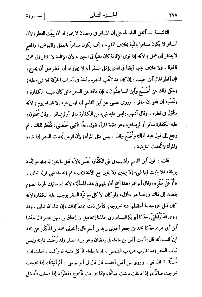 الثَّالِثَةُ- اتَّفَقَ الْعُلَمَاءُ عَلَى أَنَّ الْمُسَافِرَ فِي رَمَضَانَ لَا يَجُوزُ لَهُ أَنْ يُبَيِّتَ الْفِطْرَ، لِأَنَّ الْمُسَافِرَ لَا يَكُونُ مُسَافِرًا بِالنِّيَّةِ بِخِلَافِ الْمُقِيمِ، وَإِنَّمَا يَكُونُ مُسَافِرًا بِالْعَمَلِ وَالنُّهُوضِ، وَالْمُقِيمُ لَا يَفْتَقِرُ إِلَى عَمَلٍ، لِأَنَّهُ إِذَا نَوَى الْإِقَامَةَ كَانَ مُقِيمًا فِي الْحِينِ، لِأَنَّ الْإِقَامَةَ لَا تَفْتَقِرُ إِلَى عَمَلٍ فَافْتَرَقَا. وَلَا خِلَافَ بَيْنِهِمْ أَيْضًا فِي الَّذِي يُؤَمِّلُ السَّفَرَ أَنَّهُ لَا يَجُوزُ لَهُ أَنْ يُفْطِرَ قَبْلَ أَنْ يَخْرُجَ، فَإِنْ أَفْطَرَ فَقَالَ ابْنُ حَبِيبٍ: إِنْ كَانَ قَدْ تَأَهَّبَ لِسَفَرِهِ وَأَخَذَ فِي أَسْبَابِ الحركة فلا شي عَلَيْهِ، وَحُكِيَ ذَلِكَ عَنْ أَصْبَغَ وَابْنِ الْمَاجِشُونِ، فَإِنْ عَاقَهُ عَنِ السَّفَرِ عَائِقٌ كَانَ عَلَيْهِ الْكَفَّارَةُ، وَحَسْبُهُ أَنْ يَنْجُوَ إِنْ سَافَرَ؟. وَرَوَى عِيسَى عَنِ ابْنِ الْقَاسِمِ أَنَّهُ لَيْسَ عَلَيْهِ إِلَّا قَضَاءَ يَوْمٍ، لِأَنَّهُ مُتَأَوَّلٌ فِي فِطْرِهِ. وقال أشهب: ليس عليه شي مِنَ الْكَفَّارَةِ سَافَرَ أَوْ لَمْ يُسَافِرْ. وَقَالَ سَحْنُونُ: عَلَيْهِ الْكَفَّارَةُ سَافَرَ أَوْ لَمْ يُسَافِرْ، وَهُوَ بِمَنْزِلَةِ الْمَرْأَةِ تَقُولُ: غَدًا تَأْتِينِي حَيْضَتِي، فَتُفْطِرُ لِذَلِكَ، ثُمَّ رَجَعَ إِلَى قَوْلِ عَبْدِ الْمَلِكِ وَأَصْبَغَ وَقَالَ: لَيْسَ مِثْلَ الْمَرْأَةِ، لِأَنَّ الرَّجُلَ يُحْدِثُ السَّفَرَ إِذَا شَاءَ، وَالْمَرْأَةَ لَا تُحْدِثُ الْحَيْضَةَ. قُلْتُ: قَوْلُ ابْنِ الْقَاسِمِ وَأَشْهَبَ فِي نَفْيِ الْكَفَّارَةِ حَسَنٌ، لِأَنَّهُ فِعْلُ مَا يَجُوزُ لَهُ فِعْلُهُ، وَالذِّمَّةُ بَرِيئَةٌ، فَلَا يَثْبُتُ فيها شي إِلَّا بِيَقِينٍ وَلَا يَقِينَ مَعَ الِاخْتِلَافِ، ثُمَّ إِنَّهُ مُقْتَضَى قَوْلِهِ تَعَالَى:" أَوْ عَلى سَفَرٍ". وَقَالَ أَبُو عُمَرَ: هَذَا أَصَحُّ أَقَاوِيلِهِمْ فِي هَذِهِ الْمَسْأَلَةِ، لِأَنَّهُ غَيْرُ مُنْتَهِكٍ لِحُرْمَةِ الصَّوْمِ بِقَصْدٍ إِلَى ذَلِكَ وَإِنَّمَا هُوَ مُتَأَوِّلٌ، وَلَوْ كَانَ الْأَكْلُ مَعَ نِيَّةِ السَّفَرِ يُوجِبُ عَلَيْهِ الْكَفَّارَةَ لِأَنَّهُ كَانَ قَبْلَ خُرُوجِهِ مَا أَسْقَطَهَا عَنْهُ خُرُوجَهُ، فَتَأَمَّلْ ذَلِكَ تَجِدُهُ كَذَلِكَ، إِنْ شَاءَ اللَّهُ تَعَالَى. وَقَدْ رَوَى الدَّارَقُطْنِيُّ: حَدَّثَنَا أَبُو بَكْرٍ النَّيْسَابُورِيُّ حَدَّثَنَا إِسْمَاعِيلُ بْنُ إِسْحَاقَ بْنِ سَهْلٍ بِمِصْرَ قَالَ حَدَّثَنَا ابْنُ أَبِي مَرْيَمَ حَدَّثَنَا مُحَمَّدُ بْنُ جَعْفَرٍ أَخْبَرَنِي زَيْدُ بْنُ أَسْلَمَ قَالَ: أَخْبَرَنِي مُحَمَّدُ بْنُ الْمُنْكَدِرِ عن محمد ابن كَعْبٍ أَنَّهُ قَالَ: أَتَيْتُ أَنَسَ بْنَ مَالِكٍ فِي رَمَضَانَ وَهُوَ يُرِيدُ السَّفَرَ وَقَدْ رَحَلَتْ دَابَّتُهُ وَلَبِسَ ثِيَابَ السَّفَرِ وَقَدْ تَقَارَبَ غُرُوبُ الشَّمْسِ، فَدَعَا بِطَعَامٍ فَأَكَلَ مِنْهُ ثُمَّ رَكِبَ. فَقُلْتُ لَهُ: سُنَّةٌ؟ قَالَ نَعَمْ. وَرُوِيَ عَنْ أَنَسٍ أَيْضًا قَالَ قَالَ لِي أَبُو مُوسَى: أَلَمْ أُنْبِئَنَّكَ إِذَا خَرَجْتُ خَرَجْتُ صَائِمًا، وَإِذَا دَخَلْتَ دَخَلْتَ صَائِمًا، فَإِذَا خَرَجْتَ فَاخْرُجْ مُفْطِرًا، وَإِذَا دَخَلْتَ فَادْخُلْ