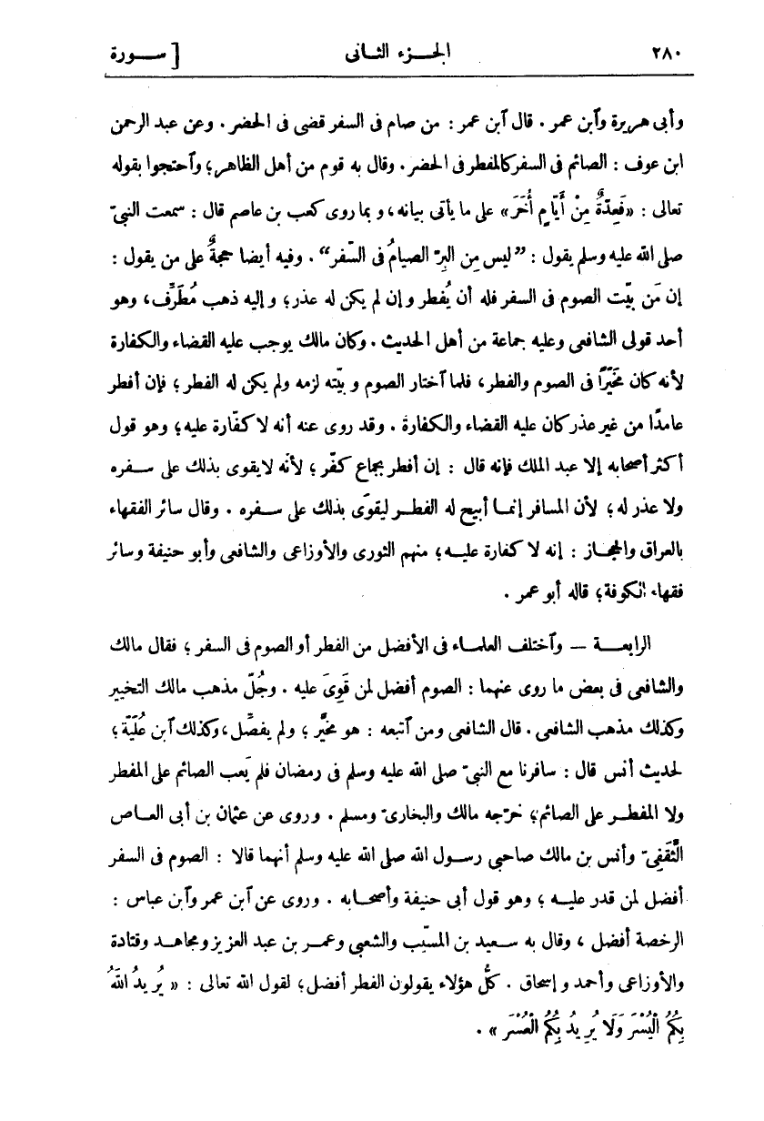 وَأَبِي هُرَيْرَةَ وَابْنِ عُمَرَ. قَالَ ابْنُ عُمَرَ: مَنْ صَامَ فِي السَّفَرِ قَضَى فِي الْحَضَرِ. وعن عبد الرحمن ابن عَوْفٍ: الصَّائِمُ فِي السَّفَرِ كَالْمُفْطِرِ فِي الْحَضَرِ. وَقَالَ بِهِ قَوْمٌ مِنْ أَهْلِ الظَّاهِرِ، وَاحْتَجُّوا بِقَوْلِهِ تَعَالَى:" فَعِدَّةٌ مِنْ أَيَّامٍ أُخَرَ" عَلَى مَا يَأْتِي بَيَانُهُ، وَبِمَا رَوَى كَعْبُ بْنُ عَاصِمٍ قَالَ: سَمِعْتُ النَّبِيَّ صَلَّى اللَّهُ عَلَيْهِ وَسَلَّمَ يَقُولُ: (لَيْسَ مِنَ الْبِرِّ الصِّيَامُ فِي السَّفَرِ). وَفِيهِ أَيْضًا حُجَّةٌ عَلَى مَنْ يَقُولُ: إِنَّ مَنْ بَيَّتَ الصَّوْمَ فِي السَّفَرِ فَلَهُ أَنْ يُفْطِرَ وَإِنْ لَمْ يَكُنْ لَهُ عُذْرٌ، وَإِلَيْهِ ذَهَبَ مُطَرِّفٌ، وَهُوَ أَحَدُ قَوْلَيِ الشَّافِعِيِّ وَعَلَيْهِ جَمَاعَةٌ مِنْ أَهْلِ الْحَدِيثِ. وَكَانَ مَالِكٌ يُوجِبُ عَلَيْهِ الْقَضَاءَ وَالْكَفَّارَةَ لِأَنَّهُ كَانَ مُخَيَّرًا فِي الصَّوْمِ وَالْفِطْرِ، فَلَمَّا اخْتَارَ الصَّوْمَ وَبَيَّتَهُ لَزِمَهُ وَلَمْ يَكُنْ لَهُ الْفِطْرُ، فَإِنْ أَفْطَرَ عَامِدًا مِنْ غَيْرِ عُذْرٍ كَانَ عَلَيْهِ الْقَضَاءُ وَالْكَفَّارَةُ. وَقَدْ رُوِيَ عَنْهُ أَنَّهُ لَا كَفَّارَةَ عَلَيْهِ، وَهُوَ قَوْلُ أَكْثَرِ أَصْحَابِهِ إِلَّا عَبْدَ الْمَلِكِ فَإِنَّهُ قَالَ: إِنْ أَفْطَرَ بِجِمَاعٍ كَفَرَ، لِأَنَّهُ لَا يَقْوَى بِذَلِكَ عَلَى سَفَرِهِ وَلَا عُذْرَ لَهُ، لِأَنَّ الْمُسَافِرَ إِنَّمَا أُبِيحَ لَهُ الْفِطْرُ لِيَقْوَى بِذَلِكَ عَلَى سَفَرِهِ. وَقَالَ سَائِرُ الْفُقَهَاءِ بِالْعِرَاقِ وَالْحِجَازِ: إِنَّهُ لَا كَفَّارَةَ عَلَيْهِ، مِنْهُمُ الثَّوْرِيُّ وَالْأَوْزَاعِيُّ وَالشَّافِعِيُّ وَأَبُو حَنِيفَةَ وَسَائِرُ فقهاء الكوفة، قال أَبُو عُمَرَ. الرَّابِعَةُ- وَاخْتَلَفَ الْعُلَمَاءُ فِي الْأَفْضَلِ مِنَ الْفِطْرِ أَوِ الصَّوْمِ فِي السَّفَرِ، فَقَالَ مَالِكٌ وَالشَّافِعِيُّ فِي بَعْضِ مَا رُوِيَ عَنْهُمَا: الصَّوْمُ أَفْضَلُ لِمَنْ قَوِيَ عَلَيْهِ. وَجُلُّ مَذْهَبِ مَالِكٍ التَّخْيِيرُ وَكَذَلِكَ مَذْهَبُ الشَّافِعِيِّ. قَالَ الشَّافِعِيُّ وَمَنِ اتَّبَعَهُ: هُوَ مُخَيَّرٌ، وَلَمْ يُفَصِّلْ، وَكَذَلِكَ ابْنُ عُلَيَّةَ، لِحَدِيثِ أَنَسٍ قَالَ: سَافَرْنَا مَعَ النَّبِيِّ صَلَّى اللَّهُ عَلَيْهِ وَسَلَّمَ فِي رَمَضَانَ فَلَمْ يَعِبِ الصَّائِمُ عَلَى الْمُفْطِرِ وَلَا الْمُفْطِرُ عَلَى الصَّائِمِ، خَرَّجَهُ مَالِكٌ وَالْبُخَارِيُّ وَمُسْلِمٌ. وَرُوِيَ عَنْ عُثْمَانَ بْنِ أَبِي الْعَاصِ الثَّقَفِيِّ وَأَنَسِ بْنِ مَالِكٍ صَاحِبَيْ رَسُولِ اللَّهِ صَلَّى اللَّهُ عَلَيْهِ وَسَلَّمَ أَنَّهُمَا قَالَا: الصَّوْمُ فِي السَّفَرِ أَفْضَلُ لِمَنْ قَدَرَ عَلَيْهِ، وَهُوَ قَوْلُ أَبِي حنيفة وأصحابه. وروي عن ابن عمرو ابن عَبَّاسٍ: الرُّخْصَةُ أَفْضَلُ، وَقَالَ بِهِ سَعِيدُ بْنُ الْمُسَيَّبِ وَالشَّعْبِيُّ وَعُمَرُ بْنُ عَبْدِ الْعَزِيزِ وَمُجَاهِدٌ وَقَتَادَةُ وَالْأَوْزَاعِيُّ وَأَحْمَدُ وَإِسْحَاقُ. كُلُّ هَؤُلَاءِ يَقُولُونَ الْفِطْرُ أَفْضَلُ، لِقَوْلِ اللَّهِ تَعَالَى:" يُرِيدُ اللَّهُ بِكُمُ الْيُسْرَ وَلا يُرِيدُ بِكُمُ الْعُسْرَ" [البقرة: ١٨٥].