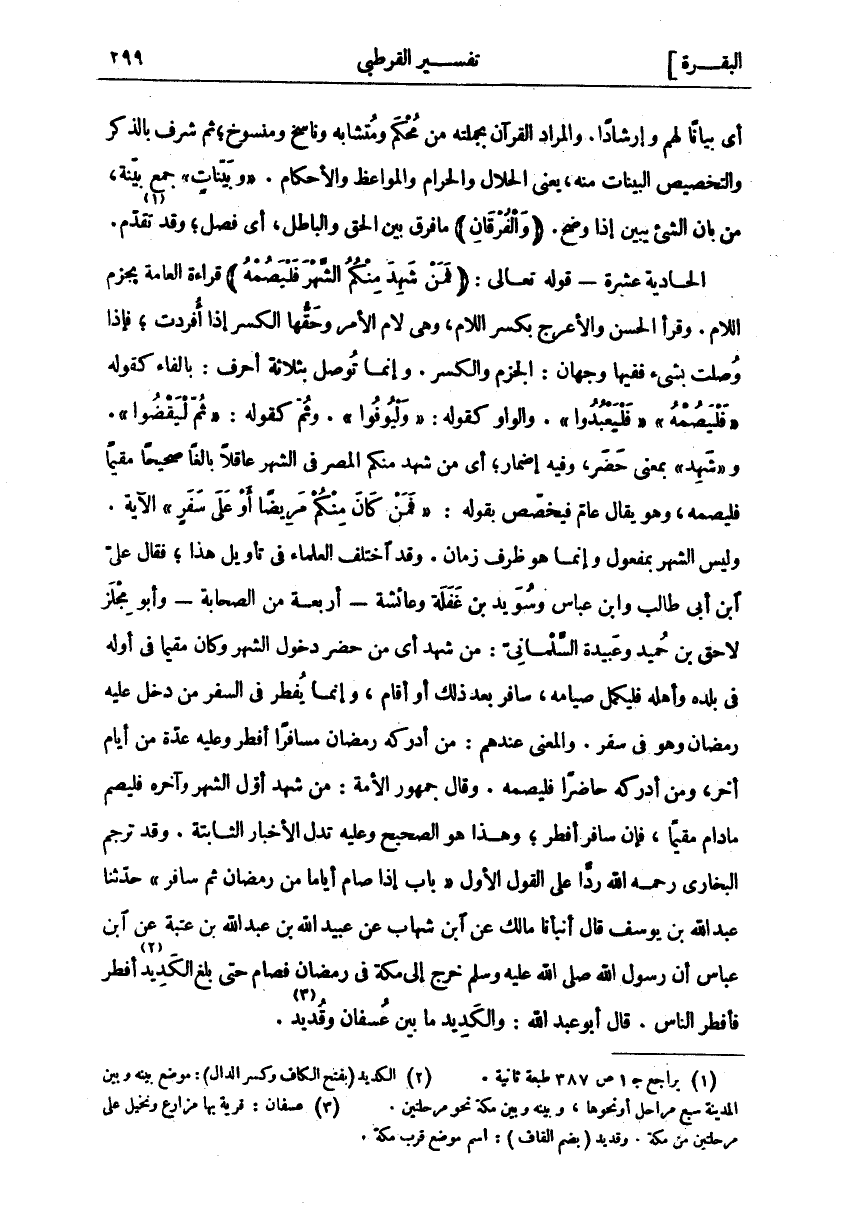 " [قريش: ٣]. والواو كقوله:" وَلْيُوفُوا" [الحج: ٢٩]. وثم كقوله:" ثُمَّ لْيَقْضُوا" [الحج: ٢٩] و" شَهِدَ" بِمَعْنَى حَضَرَ، وَفِيهِ إِضْمَارٌ، أَيْ مَنْ شَهِدَ مِنْكُمُ الْمِصْرَ فِي الشَّهْرِ عَاقِلًا بَالِغًا صَحِيحًا مُقِيمًا فَلْيَصُمْهُ، وَهُوَ يُقَالُ عَامٌّ فَيُخَصَّصُ بِقَوْلِهِ:" فَمَنْ كانَ مِنْكُمْ مَرِيضاً أَوْ عَلى سَفَرٍ" الْآيَةَ. وَلَيْسَ الشَّهْرَ بِمَفْعُولٍ وَإِنَّمَا هُوَ ظَرْفُ زَمَانٍ. وَقَدِ اخْتَلَفَ الْعُلَمَاءُ فِي تَأْوِيلِ هَذَا، فَقَالَ عَلِيُّ بْنُ أَبِي طَالِبٍ وَابْنُ عَبَّاسٍ وَسُوَيْدُ بْنُ غَفْلَةَ وَعَائِشَةُ- أَرْبَعَةٌ مِنَ الصَّحَابَةِ- وَأَبُو مِجْلَزٍ لَاحَقُ بْنُ حُمَيْدٍ وَعُبَيْدَةُ السَّلْمَانِيُّ: مَنْ شَهِدَ أَيْ مَنْ حَضَرَ دُخُولَ الشَّهْرِ وَكَانَ مُقِيمًا فِي أَوَّلِهِ فِي بَلَدِهِ وَأَهْلِهِ فَلْيُكْمِلْ صِيَامَهُ، سَافَرَ بَعْدَ ذَلِكَ أَوْ أَقَامَ، وَإِنَّمَا يُفْطِرُ فِي السَّفَرِ مَنْ دَخَلَ عَلَيْهِ رَمَضَانُ وَهُوَ فِي سَفَرٍ. وَالْمَعْنَى عِنْدَهُمْ: مَنْ أَدْرَكَهُ رَمَضَانُ مُسَافِرًا أَفْطَرَ وَعَلَيْهِ عِدَّةٌ مِنْ أَيَّامٍ أُخَرَ، وَمَنْ أَدْرَكَهُ حَاضِرًا فَلْيَصُمْهُ. وَقَالَ جُمْهُورُ الْأُمَّةِ: مَنْ شَهِدَ أَوَّلَ الشَّهْرِ وَآخِرَهُ فَلْيَصُمْ مَا دَامَ مُقِيمًا، فَإِنْ سَافَرَ أَفْطَرَ، وَهَذَا هُوَ الصَّحِيحُ وَعَلَيْهِ تَدُلُّ الْأَخْبَارُ الثَّابِتَةُ. وَقَدْ تَرْجَمَ الْبُخَارِيُّ رَحِمَهُ اللَّهُ رَدًّا عَلَى الْقَوْلِ الْأَوَّلِ" بَابُ إِذَا صَامَ أَيَّامًا مِنْ رَمَضَانَ ثُمَّ سَافَرَ" حَدَّثَنَا عَبْدُ اللَّهِ بْنُ يُوسُفَ قَالَ أَنْبَأَنَا مَالِكٌ عَنِ ابْنِ شِهَابٍ عَنْ عُبَيْدِ اللَّهِ بْنِ عَبْدِ اللَّهِ بْنِ عُتْبَةَ عَنِ ابْنِ عَبَّاسٍ أَنَّ رَسُولَ اللَّهِ صَلَّى اللَّهُ عَلَيْهِ وَسَلَّمَ خَرَجَ إِلَى مَكَّةَ فِي رَمَضَانَ فَصَامَ حَتَّى بَلَغَ الْكَدِيدَ «٢» أَفْطَرَ فَأَفْطَرَ النَّاسُ. قَالَ أَبُو عَبْدِ اللَّهِ: وَالْكَدِيدُ ما بين عسفان وقديد «٣».