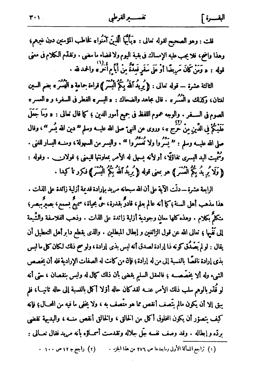 قُلْتُ: وَهُوَ الصَّحِيحُ لِقَوْلِهِ تَعَالَى:" يَا أَيُّهَا الَّذِينَ آمَنُوا" فَخَاطَبَ الْمُؤْمِنِينَ دُونَ غَيْرِهِمْ، وَهَذَا وَاضِحٌ، فَلَا يَجِبُ عَلَيْهِ الْإِمْسَاكُ فِي بَقِيَّةِ اليوم ولا قضاء ما مضى. وتقدم الكلام فِي مَعْنِيِّ قَوْلِهِ:" وَمَنْ كانَ مَرِيضاً أَوْ عَلى سَفَرٍ فَعِدَّةٌ مِنْ أَيَّامٍ أُخَرَ «١» " وَالْحَمْدُ للَّهِ. الثَّالِثَةَ عَشْرَةَ- قَوْلُهُ تَعَالَى:" يُرِيدُ اللَّهُ بِكُمُ الْيُسْرَ" قِرَاءَةُ جَمَاعَةٍ" الْيُسْرَ" بِضَمِ السِّينِ لُغَتَانِ، وَكَذَلِكَ" الْعُسْرَ". قَالَ مُجَاهِدٌ وَالضَّحَّاكُ:" الْيُسْرَ" الْفِطْرُ فِي السفر، و" الْعُسْرَ" الصوم فِي السَّفَرِ. وَالْوَجْهُ عُمُومُ اللَّفْظِ فِي جَمِيعِ أُمُورِ الدِّينِ، كَمَا قَالَ تَعَالَى:" وَما جَعَلَ عَلَيْكُمْ فِي الدِّينِ مِنْ حَرَجٍ" «٢» [الحج: ٧٨]، وَرُوِيَ عَنِ النَّبِيِّ صَلَّى اللَّهُ عَلَيْهِ وَسَلَّمَ (دِينُ اللَّهِ يُسْرٌ)، وَقَالَ صَلَّى اللَّهُ عَلَيْهِ وَسَلَّمَ: (يَسِّرُوا وَلَا تُعَسِّرُوا). وَالْيُسْرُ مِنَ السُّهُولَةِ، وَمِنْهُ الْيَسَارُ لِلْغِنَى. وَسُمِّيَتِ الْيَدُ الْيُسْرَى تَفَاؤُلًا، أَوْ لِأَنَّهُ يَسْهُلُ لَهُ الْأَمْرُ بِمُعَاوَنَتِهَا لِلْيُمْنَى، قَوْلَانِ. وَقَوْلُهُ:" وَلا يُرِيدُ بِكُمُ الْعُسْرَ" هُوَ بِمَعْنَى قَوْلِهِ" يُرِيدُ اللَّهُ بِكُمُ الْيُسْرَ" فَكَرَّرَ تَأْكِيدًا. الرَّابِعَةَ عَشْرَةَ- دَلَّتِ الْآيَةُ عَلَى أَنَّ اللَّهَ سُبْحَانَهُ مُرِيدٌ بِإِرَادَةٍ قَدِيمَةٍ أَزَلِيَّةٍ زَائِدَةٍ عَلَى الذَّاتِ. هَذَا مَذْهَبُ أَهْلِ السُّنَّةِ، كَمَا أَنَّهُ عَالِمٌ بِعِلْمٍ، قَادِرٌ بِقُدْرَةٍ، حَيٌّ بِحَيَاةٍ، سَمِيعٌ بِسَمْعٍ، بَصِيرٌ بِبَصَرٍ، مُتَكَلِّمٌ بِكَلَامٍ. وَهَذِهِ كُلُّهَا مَعَانٍ وُجُودِيَّةٌ أَزَلِيَّةٌ زَائِدَةٌ عَلَى الذَّاتِ. وَذَهَبَ الْفَلَاسِفَةُ وَالشِّيعَةُ إِلَى نَفْيِهَا، تَعَالَى اللَّهُ عَنْ قَوْلِ الزَّائِغِينَ وَإِبْطَالِ الْمُبْطِلِينَ. وَالَّذِي يَقْطَعُ دَابِرَ أَهْلِ التَّعْطِيلِ أَنْ يُقَالَ: لَوْ لَمْ يُصَدَّقْ كَوْنُهُ ذَا إِرَادَةٍ لَصُدِّقَ أَنَّهُ لَيْسَ بِذِي إِرَادَةٍ، وَلَوْ صَحَّ ذَلِكَ لَكَانَ كُلُّ مَا لَيْسَ بِذِي إِرَادَةٍ نَاقِصًا بِالنِّسْبَةِ إِلَى مَنْ لَهُ إِرَادَةٌ، فَإِنَّ مَنْ كَانَتْ لَهُ الصِّفَاتُ الْإِرَادِيَّةُ فَلَهُ أَنْ يُخَصِّصَ الشَّيْءَ وَلَهُ ألا يخصصه، فالعقل السليم يقضي بأن ذنك كَمَالٌ لَهُ وَلَيْسَ بِنُقْصَانٍ، حَتَّى إِنَّهُ لَوْ قَدَرَ بِالْوَهْمِ سُلِبَ ذَلِكَ الْأَمْرُ عَنْهُ لَقَدْ كان حاله أولا أكمل بالنسبة إلى حاله ثَانِيًا، فَلَمْ يَبْقَ إِلَّا أَنْ يَكُونَ مَا لَمْ يَتَّصِفْ أَنْقَصَ مِمَّا هُوَ مُتَّصِفٌ بِهِ، وَلَا يَخْفَى مَا فِيهِ مِنَ الْمُحَالِ، فَإِنَّهُ كَيْفَ يُتَصَوَّرُ أَنْ يَكُونَ الْمَخْلُوقُ أَكْمَلَ مِنَ الْخَالِقِ، وَالْخَالِقُ أَنْقَصَ مِنْهُ، وَالْبَدِيهَةُ تَقْضِي بِرَدِّهِ