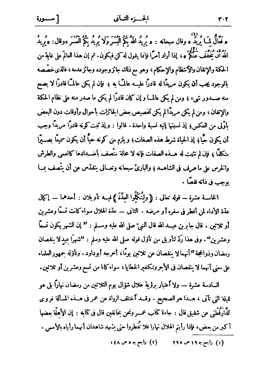 " فَعَّالٌ لِما يُرِيدُ «١» " [هود: ١٠٧] وَقَالَ سُبْحَانَهُ:" يُرِيدُ اللَّهُ بِكُمُ الْيُسْرَ وَلا يُرِيدُ بِكُمُ الْعُسْرَ" [البقرة: ١٨٥] وقال:" يُرِيدُ اللَّهُ أَنْ يُخَفِّفَ عَنْكُمْ «٢» " [النساء: ٢٨]، إذا أراد أمرا فإنما يقول له كُنْ فَيَكُونُ. ثُمَّ إِنَّ هَذَا الْعَالَمَ عَلَى غَايَةٍ مِنَ الْحِكْمَةِ وَالْإِتْقَانِ وَالِانْتِظَامِ وَالْإِحْكَامِ، وَهُوَ مَعَ ذَلِكَ جَائِزٌ وُجُودُهُ وَجَائِزٌ عَدَمُهُ، فَالَّذِي خَصَّصَهُ بِالْوُجُودِ يَجِبُ أَنْ يَكُونَ مُرِيدًا لَهُ قَادِرًا عَلَيْهِ عَالِمًا بِهِ، فَإِنْ لَمْ يَكُنْ عالما قادرا لا يصح منه صدور شي، وَمَنْ لَمْ يَكُنْ عَالِمًا وَإِنْ كَانَ قَادِرًا لَمْ يَكُنْ مَا صَدَرَ مِنْهُ عَلَى نِظَامِ الْحِكْمَةِ وَالْإِتْقَانِ، وَمَنْ لَمْ يَكُنْ مُرِيدًا لَمْ يَكُنْ تَخْصِيصُ بَعْضِ الْجَائِزَاتِ بِأَحْوَالٍ وَأَوْقَاتٍ دُونَ الْبَعْضِ بِأَوْلَى مِنَ الْعَكْسِ، إِذْ نِسْبَتُهَا إِلَيْهِ نِسْبَةٌ وَاحِدَةٌ. قَالُوا: وَإِذْ ثَبَتَ كَوْنُهُ قَادِرًا مُرِيدًا وَجَبَ أَنْ يَكُونَ حَيًّا، إِذِ الْحَيَاةُ شَرْطُ هَذِهِ الصِّفَاتِ، وَيَلْزَمُ مِنْ كَوْنِهِ حَيًّا أَنْ يَكُونَ سَمِيعًا بَصِيرًا مُتَكَلِّمًا، فَإِنْ لَمْ تَثْبُتْ لَهُ هَذِهِ الصِّفَاتُ فَإِنَّهُ لَا مَحَالَةَ مُتَّصِفٌ بِأَضْدَادِهَا كَالْعَمَى وَالطَّرَشِ وَالْخَرَسِ عَلَى مَا عُرِفَ فِي الشَّاهِدِ، وَالْبَارِئُ سُبْحَانَهُ وَتَعَالَى يَتَقَدَّسُ عَنْ أَنْ يَتَّصِفَ بِمَا يُوجِبُ فِي ذَاتِهِ نَقْصًا. الْخَامِسَةَ عَشْرَةَ- قَوْلُهُ تَعَالَى:" وَلِتُكْمِلُوا الْعِدَّةَ" فِيهِ تَأْوِيلَانِ: أَحَدُهُمَا- إِكْمَالُ عِدَّةِ الْأَدَاءِ لِمَنْ أَفْطَرَ فِي سَفَرِهِ أَوْ مَرَضِهِ. الثَّانِي- عِدَّةُ الْهِلَالِ سَوَاءً كَانَتْ تِسْعًا وَعِشْرِينَ أَوْ ثَلَاثِينَ. قَالَ جَابِرُ بْنُ عَبْدِ اللَّهِ قَالَ النَّبِيُّ صَلَّى اللَّهُ عَلَيْهِ وَسَلَّمَ: (إِنَّ الشَّهْرَ يَكُونُ تِسْعًا وَعِشْرِينَ). وَفِي هَذَا رَدٌّ لِتَأْوِيلِ مَنْ تَأَوَّلَ قَوْلَهُ صَلَّى اللَّهُ عَلَيْهِ وَسَلَّمَ: (شَهْرَا عِيدٍ لَا يَنْقُصَانِ رَمَضَانُ وَذُو الْحَجَّةِ) أَنَّهُمَا لَا يَنْقُصَانِ عَنْ ثَلَاثِينَ يَوْمًا، أَخْرَجَهُ أَبُو داود. وتأوله جُمْهُورُ الْعُلَمَاءِ عَلَى مَعْنَى أَنَّهُمَا لَا يَنْقُصَانِ فِي الْأَجْرِ وَتَكْفِيرِ الْخَطَايَا، سَوَاءً كَانَا مِنْ تِسْعٍ وَعِشْرِينَ أَوْ ثَلَاثِينَ. السَّادِسَةَ عَشْرَةَ- وَلَا اعْتِبَارَ بِرُؤْيَةِ هِلَالِ شَوَّالٍ يَوْمَ الثَّلَاثِينَ مِنْ رَمَضَانَ نَهَارًا بَلْ هُوَ لِلَّيْلَةِ الَّتِي تَأْتِي، هَذَا هُوَ الصَّحِيحُ. وَقَدِ اخْتَلَفَ الرُّوَاةُ عَنْ عُمَرَ فِي هَذِهِ الْمَسْأَلَةِ فَرَوَى الدَّارَقُطْنِيُّ عَنْ شَقِيقٍ قَالَ: جَاءَنَا كِتَابُ عُمَرَ وَنَحْنُ بِخَانِقِينَ قَالَ فِي كِتَابِهِ: (إِنَّ الْأَهِلَّةَ بَعْضُهَا أَكْبَرُ مِنْ بَعْضٍ، فَإِذَا رَأَيْتُمُ الْهِلَالَ نَهَارًا فَلَا تُفْطِرُوا حَتَّى يَشْهَدَ شَاهِدَانِ أَنَّهُمَا رَأَيَاهُ بِالْأَمْسِ.
