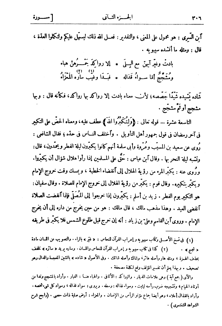 شَادَهُ يَشِيدُهُ شَيْدًا جَصَّصَهُ، لِأَنَّ مَعْنَاهُ بَادَتْ إِلَّا رَوَاكِدَ بِهَا رَوَاكِدُ، فَكَأَنَّهُ قَالَ: وَبِهَا مُشَجَّجٌ أَوْ ثَمَّ مُشَجَّجٌ. التَّاسِعَةَ عَشْرَةَ- قَوْلُهُ تَعَالَى:" وَلِتُكَبِّرُوا اللَّهَ" عَطْفُ عَلَيْهِ، وَمَعْنَاهُ الْحَضُّ عَلَى التَّكْبِيرِ فِي آخِرِ رَمَضَانَ فِي قَوْلِ جُمْهُورِ أَهْلِ التَّأْوِيلِ. وَاخْتَلَفَ النَّاسُ فِي حَدِّهِ، فقال الشافعي: روي عن سعيد بن الْمُسَيَّبِ وَعُرْوَةَ وَأَبِي سَلَمَةَ أَنَّهُمْ كَانُوا يُكَبِّرُونَ لَيْلَةَ الْفِطْرِ وَيَحْمَدُونَ، قَالَ: وَتُشْبِهُ لَيْلَةِ النَّحْرِ بِهَا. وَقَالَ ابْنُ عَبَّاسٍ: حَقٌّ عَلَى الْمُسْلِمِينَ إِذَا رَأَوْا هِلَالَ شَوَّالٍ أَنْ يُكَبِّرُوا وَرُوِيَ عَنْهُ: يُكَبِّرُ الْمَرْءُ مِنْ رُؤْيَةِ الْهِلَالِ إِلَى انْقِضَاءِ الْخُطْبَةِ، وَيُمْسِكُ وَقْتَ خُرُوجِ الْإِمَامِ وَيُكَبِّرُ بِتَكْبِيرِهِ. وَقَالَ قَوْمٌ: يُكَبِّرُ مِنْ رُؤْيَةِ الْهِلَالِ إِلَى خُرُوجِ الْإِمَامِ لِلصَّلَاةِ. وَقَالَ سُفْيَانُ: هُوَ التَّكْبِيرُ يَوْمَ الْفِطْرِ. زَيْدُ بْنُ أَسْلَمَ: يُكَبِّرُونَ إِذَا خَرَجُوا إِلَى الْمُصَلَّى فَإِذَا انْقَضَتِ الصَّلَاةُ انْقَضَى الْعِيدُ. وَهَذَا مَذْهَبُ مَالِكٍ، قَالَ مَالِكٌ: هُوَ مِنْ حِينِ يَخْرُجُ مِنْ دَارِهِ إِلَى أَنْ يَخْرُجَ الْإِمَامُ. وَرَوَى ابْنُ الْقَاسِمِ وَعَلِيُّ بْنُ زِيَادٍ: أَنَّهُ إِنْ خَرَجَ قَبْلَ طُلُوعِ الشمس فلا يكبر في طريقه