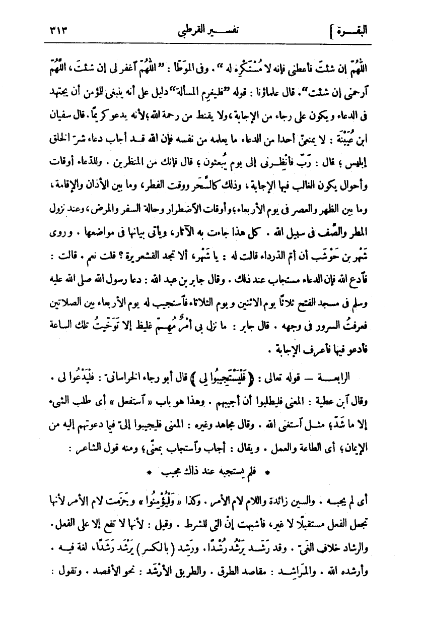 اللَّهُمَّ إِنْ شِئْتَ فَأَعْطِنِي فَإِنَّهُ لَا مُسْتَكْرِهَ لَهُ (. وَفِي الْمُوَطَّأِ:) اللَّهُمَّ اغْفِرْ لِي إِنْ شِئْتَ، اللَّهُمَّ ارْحَمْنِي إِنْ شِئْتَ (. قَالَ عُلَمَاؤُنَا: قَوْلُهُ (فَلْيَعْزِمِ الْمَسْأَلَةَ) دَلِيلٌ عَلَى أَنَّهُ يَنْبَغِي لِلْمُؤْمِنِ أَنْ يَجْتَهِدَ فِي، الدُّعَاءِ وَيَكُونُ عَلَى رَجَاءٍ مِنَ الْإِجَابَةِ، وَلَا يَقْنَطُ مِنْ رَحْمَةِ الله، لأنه يدعو كريما. قال سفيان ابن عُيَيْنَةَ: لَا يَمْنَعَنَّ أَحَدًا مِنَ الدُّعَاءِ مَا يَعْلَمُهُ مِنْ نَفْسِهِ فَإِنَّ اللَّهَ قَدْ أَجَابَ دُعَاءَ شَرِّ الْخَلْقِ إِبْلِيسَ، قَالَ: رَبِّ فَأَنْظِرْنِي إِلَى يَوْمِ يُبْعَثُونَ، قَالَ فَإِنَّكَ مِنَ الْمُنْظَرِينَ. وَلِلدُّعَاءِ أَوْقَاتٌ وَأَحْوَالٌ يَكُونُ الْغَالِبُ فِيهَا الْإِجَابَةُ، وَذَلِكَ كَالسَّحَرِ وَوَقْتِ الْفِطْرِ، وَمَا بَيْنَ الْأَذَانِ وَالْإِقَامَةِ، وَمَا بَيْنَ الظُّهْرِ وَالْعَصْرِ فِي يَوْمِ الْأَرْبِعَاءِ، وَأَوْقَاتِ الِاضْطِرَارِ وَحَالَةِ السَّفَرِ وَالْمَرَضِ، وَعِنْدَ نُزُولِ الْمَطَرِ وَالصَّفِّ فِي سَبِيلِ اللَّهِ. كُلُّ هَذَا جَاءَتْ بِهِ الْآثَارُ، وَيَأْتِي بَيَانُهَا فِي مَوَاضِعِهَا. وَرَوَى شَهْرُ بْنُ حَوْشَبٍ أَنَّ أُمَّ الدَّرْدَاءِ قَالَتْ لَهُ: يَا شَهْرُ، أَلَا تَجِدُ الْقُشَعْرِيرَةَ؟ قُلْتُ نَعَمْ. قَالَتْ: فَادْعُ اللَّهَ فَإِنَّ الدُّعَاءَ مُسْتَجَابٌ عِنْدَ ذَلِكَ. وَقَالَ جَابِرُ بْنُ عَبْدِ اللَّهِ: دَعَا رَسُولُ اللَّهِ صَلَّى اللَّهُ عَلَيْهِ وَسَلَّمَ فِي مَسْجِدِ الْفَتْحِ ثَلَاثًا يَوْمَ الِاثْنَيْنِ وَيَوْمَ الثُّلَاثَاءِ فَاسْتُجِيبَ لَهُ يَوْمَ الْأَرْبِعَاءِ بَيْنَ الصَّلَاتَيْنِ. فَعَرَفْتُ السُّرُورَ فِي وَجْهِهِ. قَالَ جَابِرٌ: مَا نَزَلَ بِي أَمْرٌ مُهِمٌّ غَلِيظٌ إِلَّا تَوَخَّيْتُ تِلْكَ السَّاعَةَ فَأَدْعُو فِيهَا فَأَعْرِفُ الْإِجَابَةَ. الرَّابِعَةُ- قَوْلُهُ تَعَالَى:" فَلْيَسْتَجِيبُوا لِي" قَالَ أَبُو رَجَاءٍ الْخُرَاسَانِيُّ: فَلْيَدْعُوَا لِي. وَقَالَ ابْنُ عَطِيَّةَ: الْمَعْنَى فَلْيَطْلُبُوا أَنْ أُجِيبَهُمْ. وَهَذَا هُوَ بَابُ" اسْتَفْعَلَ" أَيْ طَلَبُ الشَّيْءِ إِلَّا مَا شَذَّ، مِثْلُ اسْتَغْنَى اللَّهُ. وَقَالَ مُجَاهِدٌ وَغَيْرُهُ: الْمَعْنَى فَلْيُجِيبُوا إِلَيَّ فِيمَا دَعَوْتُهُمْ إِلَيْهِ مِنَ الْإِيمَانِ، أَيِ الطَّاعَةِ وَالْعَمَلِ. وَيُقَالُ: أَجَابَ وَاسْتَجَابَ بِمَعْنًى، وَمِنْهُ قَوْلُ الشَّاعِرِ: