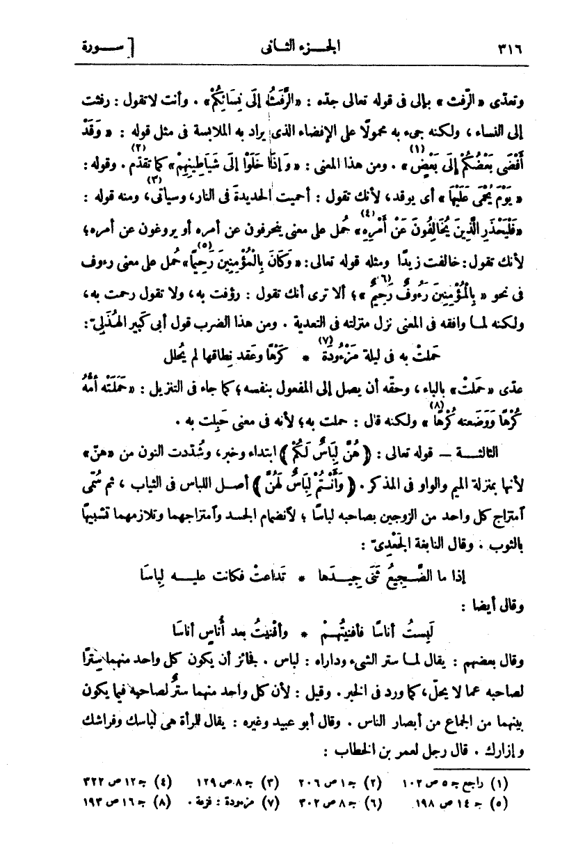 وَتَعَدَّى" الرَّفَثُ" بِإِلَى فِي قَوْلِهِ تَعَالَى جَدُّهُ:" الرَّفَثُ إِلى نِسائِكُمْ". وَأَنْتَ لَا تَقُولُ: رَفَثْتُ إلى النساء، ولكنه جئ بِهِ مَحْمُولًا عَلَى الْإِفْضَاءِ الَّذِي يُرَادُ بِهِ الْمُلَابَسَةُ فِي مِثْلِ قَوْلِهِ:" وَقَدْ أَفْضى بَعْضُكُمْ إِلى بَعْضٍ «١» ". [النساء: ٢١]. وَمِنْ هَذَا الْمَعْنَى:" وَإِذا خَلَوْا إِلى شَياطِينِهِمْ" [البقرة: ١٤] كما تقدم «٢». وقوله:" يَوْمَ يُحْمى عَلَيْها" [التوبة: ٣٥] أَيْ يُوقَدُ، لِأَنَّكَ تَقُولُ: أُحْمِيَتِ الْحَدِيدَةُ فِي النَّارِ، وَسَيَأْتِي «٣»، وَمِنْهُ قَوْلُهُ:" فَلْيَحْذَرِ الَّذِينَ يُخالِفُونَ عَنْ أَمْرِهِ «٤» " [النور: ٦٣] حُمِلَ عَلَى مَعْنَى يَنْحَرِفُونَ عَنْ أَمْرِهِ أَوْ يَرُوغُونَ عَنْ أَمْرِهِ، لِأَنَّكَ تَقُولُ: خَالَفْتُ زَيْدًا. ومثله قوله تعالى:" وَكانَ بِالْمُؤْمِنِينَ رَحِيماً «٥» " [الأحزاب: ٤٣] حمل على معنى رءوف في نحو" بِالْمُؤْمِنِينَ رَؤُفٌ رَحِيمٌ «٦» " [التوبة: ١٢٨]، أَلَا تَرَى أَنَّكَ تَقُولُ: رَؤُفْتُ بِهِ، وَلَا تَقُولُ رَحِمْتُ بِهِ، وَلَكِنَّهُ لَمَّا وَافَقَهُ فِي الْمَعْنَى نَزَلَ مَنْزِلَتَهُ فِي التَّعْدِيَةِ. وَمِنْ هَذَا الضَّرْبِ قَوْلُ أَبِي كَبِيرٍ الْهُذَلِيِّ: