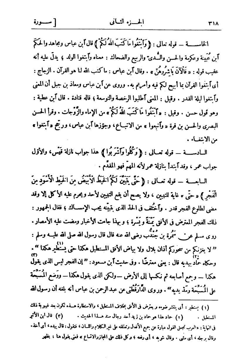 الْخَامِسَةُ- قَوْلُهُ تَعَالَى:" وَابْتَغُوا مَا كَتَبَ اللَّهُ لَكُمْ" قال ابن عباس ومجاهد والحكم ابن عُيَيْنَةَ وَعِكْرِمَةُ وَالْحَسَنُ وَالسُّدِّيُّ وَالرَّبِيعُ وَالضَّحَّاكُ: مَعْنَاهُ وَابْتَغُوا الْوَلَدَ، يَدُلُّ عَلَيْهِ أَنَّهُ عُقَيْبَ قَوْلِهِ:" فَالْآنَ بَاشِرُوهُنَّ". وَقَالَ ابْنُ عَبَّاسٍ: مَا كَتَبَ اللَّهُ لَنَا هُوَ الْقُرْآنُ. الزَّجَّاجُ: أَيِ ابْتَغُوا الْقُرْآنَ بِمَا أُبِيحَ لَكُمْ فِيهِ وَأُمِرْتُمْ بِهِ. وَرُوِيَ عَنِ ابْنِ عَبَّاسٍ وَمُعَاذِ بْنِ جَبَلٍ أَنَّ الْمَعْنَى وَابْتَغُوا لَيْلَةَ الْقَدْرِ. وَقِيلَ: الْمَعْنَى اطْلُبُوا الرُّخْصَةَ وَالتَّوْسِعَةَ، قَالَهُ قَتَادَةُ. قَالَ ابْنُ عطية: وهو قول حسن. وقيل:" ابْتَغُوا مَا كَتَبَ اللَّهُ لَكُمْ" مِنَ الْإِمَاءِ وَالزَّوْجَاتِ. وقرا الحسن البصري والحسن بن قُرَّةَ" وَاتَّبِعُوا" مِنَ الِاتِّبَاعِ، وَجَوَّزَهَا ابْنُ عَبَّاسٍ، ورجح" ابْتَغُوا" من الابتغاء. السادسة- قوله تعالى:" وَكُلُوا وَاشْرَبُوا" هَذَا جَوَابُ نَازِلَةٍ قَيْسٍ، وَالْأَوَّلُ جَوَابُ عُمَرَ، وَقَدِ ابْتَدَأَ بِنَازِلَةِ عُمَرَ لِأَنَّهُ الْمُهِمُّ فَهُوَ الْمُقَدَّمُ. السَّابِعَةُ- قَوْلُهُ تَعَالَى:" حَتَّى يَتَبَيَّنَ لَكُمُ الْخَيْطُ الْأَبْيَضُ مِنَ الْخَيْطِ الْأَسْوَدِ مِنَ الْفَجْرِ