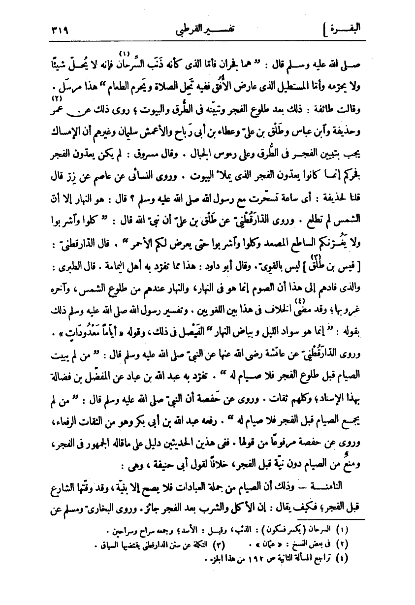 صَلَّى اللَّهُ عَلَيْهِ وَسَلَّمَ قَالَ: (هُمَا فَجْرَانِ فَأَمَّا الَّذِي كَأَنَّهُ ذَنَبُ السِّرْحَانِ «١» فَإِنَّهُ لَا يُحِلُّ شَيْئًا وَلَا يُحَرِّمُهُ وَأَمَّا الْمُسْتَطِيلُ الَّذِي عَارَضَ الْأُفُقَ فَفِيهِ تَحِلُّ الصَّلَاةُ وَيَحْرُمُ الطَّعَامُ) هَذَا مُرْسَلٌ. وَقَالَتْ طَائِفَةٌ: ذَلِكَ بَعْدَ طُلُوعِ الْفَجْرِ وَتَبَيُّنِهِ فِي الطُّرُقِ وَالْبُيُوتِ، رُوِيَ ذَلِكَ عَنْ عُمَرَ «٢» وَحُذَيْفَةَ وَابْنِ عَبَّاسٍ وَطَلْقِ بْنِ عَلِيٍّ وَعَطَاءِ بْنِ أَبِي رَبَاحٍ وَالْأَعْمَشِ سُلَيْمَانَ وَغَيْرِهِمْ أَنَّ الْإِمْسَاكَ يَجِبُ بِتَبْيِينِ الْفَجْرَ فِي الطُّرُقِ وَعَلَى رُءُوسِ الْجِبَالِ. وَقَالَ مَسْرُوقٌ: لَمْ يَكُنْ يَعُدُّونَ الْفَجْرَ فَجْرَكُمْ إِنَّمَا كَانُوا يَعُدُّونَ الْفَجْرَ الَّذِي يَمْلَأُ الْبُيُوتَ. وَرَوَى النَّسَائِيُّ عَنْ عَاصِمٍ عَنْ زِرٍّ قَالَ قُلْنَا لِحُذَيْفَةَ: أَيَّ سَاعَةٍ تَسَحَّرْتَ مَعَ رَسُولِ اللَّهِ صَلَّى اللَّهُ عَلَيْهِ وَسَلَّمَ؟ قَالَ: هُوَ النَّهَارُ إِلَّا أَنَّ الشَّمْسَ لَمْ تَطْلُعْ. وَرَوَى الدَّارَقُطْنِيُّ عَنْ طَلْقِ بْنِ عَلِيٍّ أَنَّ نَبِيَّ اللَّهِ قَالَ: (كُلُوا وَاشْرَبُوا وَلَا يَغُرَّنكُمُ السَّاطِعُ الْمُصْعِدُ وَكُلُوا وَاشْرَبُوا حَتَّى يَعْرِضَ لَكُمُ الْأَحْمَرُ). قَالَ الدَّارَقُطْنِيُّ: [قَيْسُ بْنُ طَلْقٍ «٣» [لَيْسَ بِالْقَوِيِّ. وَقَالَ أَبُو دَاوُدَ: هَذَا مِمَّا تَفَرَّدَ بِهِ أَهْلُ الْيَمَامَةِ. قَالَ الطَّبَرِيُّ: وَالَّذِي قَادَهُمْ إِلَى هَذَا أَنَّ الصَّوْمَ إِنَّمَا هُوَ فِي النَّهَارِ، وَالنَّهَارِ عِنْدَهُمْ مِنْ طُلُوعِ الشَّمْسِ، وَآخِرُهُ غُرُوبُهَا، وَقَدْ مَضَى «٤» الْخِلَافُ فِي هَذَا بَيْنَ اللُّغَوِيِّينَ. وَتَفْسِيرُ رَسُولِ اللَّهِ صَلَّى اللَّهُ عَلَيْهِ وَسَلَّمَ ذَلِكَ بِقَوْلِهِ: (إِنَّمَا هُوَ سَوَادُ اللَّيْلِ وَبَيَاضُ النَّهَارِ) الْفَيْصَلُ فِي ذلك، وقوله" أَيَّاماً مَعْدُوداتٍ" [البقرة: ١٨٤]. وَرَوَى الدَّارَقُطْنِيُّ عَنْ عَائِشَةَ رَضِيَ اللَّهُ عَنْهَا عَنِ النَّبِيِّ صَلَّى اللَّهُ عَلَيْهِ وَسَلَّمَ قَالَ: (مَنْ لَمْ يُبَيِّتِ الصِّيَامَ قَبْلَ طُلُوعِ الْفَجْرِ فَلَا صِيَامَ لَهُ). تَفَرَّدَ بِهِ عَبْدُ اللَّهِ بْنُ عَبَّادٍ عَنِ الْمُفَضَّلِ بْنِ فَضَالَةَ بِهَذَا الْإِسْنَادِ، وَكُلُّهُمْ ثِقَاتٌ. وَرُوِيَ عَنْ حَفْصَةَ أَنَّ النَّبِيَّ صَلَّى اللَّهُ عَلَيْهِ وَسَلَّمَ قَالَ: (من لَمْ يَجْمَعِ الصِّيَامَ قَبْلَ الْفَجْرِ فَلَا صِيَامَ لَهُ). رَفَعَهُ عَبْدُ اللَّهِ بْنُ أَبِي بَكْرٍ وَهُوَ مِنَ الثِّقَاتِ الرُّفَعَاءِ، وَرُوِيَ عَنْ حَفْصَةَ مَرْفُوعًا مِنْ قَوْلُهَا. فَفِي هَذَيْنَ الْحَدِيثَيْنِ دَلِيلٌ عَلَى مَا قَالَهُ الْجُمْهُورُ فِي الْفَجْرِ، وَمَنَعَ مِنَ الصِّيَامِ دُونَ نِيَّةٍ قَبْلَ الْفَجْرِ، خِلَافًا لِقَوْلِ أَبِي حَنِيفَةَ، وَهِيَ: الثَّامِنَةُ- وَذَلِكَ أَنَّ الصِّيَامَ مِنْ جُمْلَةِ الْعِبَادَاتِ فَلَا يَصِحُّ إِلَّا بِنِيَّةٍ، وَقَدْ وَقَّتَهَا الشَّارِعُ قَبْلَ الْفَجْرِ، فَكَيْفَ يُقَالُ: إِنَّ الْأَكْلَ وَالشُّرْبَ بَعْدَ الْفَجْرِ جَائِزٌ. وروى البخاري ومسلم عن