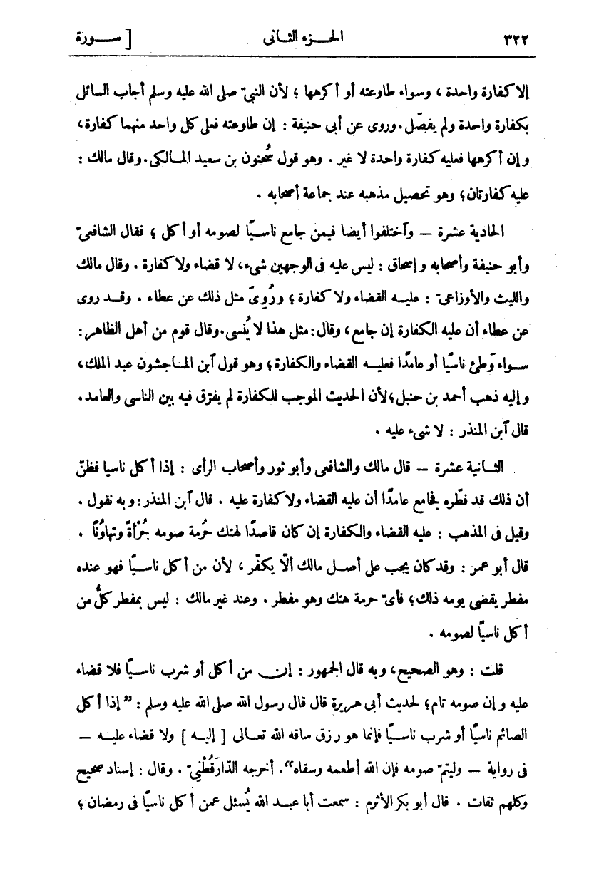 إِلَّا كَفَّارَةً وَاحِدَةً، وَسَوَاءً طَاوَعَتْهُ أَوْ أَكْرَهَهَا، لِأَنَّ النَّبِيَّ صَلَّى اللَّهُ عَلَيْهِ وَسَلَّمَ أَجَابَ السَّائِلَ بِكَفَّارَةٍ وَاحِدَةٍ وَلَمْ يُفَصِّلْ. وَرُوِيَ عَنْ أَبِي حَنِيفَةَ: إِنْ طَاوَعَتْهُ فَعَلَى كُلٍّ وَاحِدٍ مِنْهُمَا كَفَّارَةٌ، وَإِنْ أَكْرَهَهَا فَعَلَيْهِ كَفَّارَةٌ وَاحِدَةٌ لَا غَيْرَ. وَهُوَ قَوْلُ سَحْنُونِ بْنِ سَعِيدٍ الْمَالِكِيِّ. وَقَالَ مَالِكٌ: عَلَيْهِ كَفَّارَتَانِ، وَهُوَ تَحْصِيلُ مَذْهَبِهِ عِنْدَ جَمَاعَةِ أَصْحَابِهِ. الْحَادِيَةَ عَشْرَةَ- وَاخْتَلَفُوا أَيْضًا فِيمَنْ جَامَعَ نَاسِيًا لِصَوْمِهِ أَوْ أَكَلَ، فَقَالَ الشَّافِعِيُّ وَأَبُو حَنِيفَةَ وَأَصْحَابُهُ وَإِسْحَاقُ: لَيْسَ عليه في الوجهين شي، لَا قَضَاءَ وَلَا كَفَّارَةَ. وَقَالَ مَالِكٌ وَاللَّيْثُ وَالْأَوْزَاعِيُّ: عَلَيْهِ الْقَضَاءُ وَلَا كَفَّارَةَ، وَرُوِيَ مِثْلُ ذَلِكَ عَنْ عَطَاءٍ. وَقَدْ رُوِيَ عَنْ عَطَاءٍ أَنَّ عَلَيْهِ الْكَفَّارَةَ إِنْ جَامَعَ، وَقَالَ: مِثْلَ هَذَا لَا يُنْسَى. وَقَالَ قَوْمٌ مِنْ أَهْلِ الظَّاهِرِ: سَوَاءٌ وَطِئَ نَاسِيًا أَوْ عَامِدًا فَعَلَيْهِ الْقَضَاءُ وَالْكَفَّارَةُ، وَهُوَ قَوْلُ ابْنِ الْمَاجِشُونِ عَبْدِ الْمَلِكِ، وَإِلَيْهِ ذَهَبَ أَحْمَدُ بْنُ حَنْبَلٍ، لِأَنَّ الْحَدِيثَ الْمُوجِبَ لِلْكَفَّارَةِ لَمْ يُفَرَّقْ فِيهِ بَيْنَ الناسي والعامد. قال ابن المنذر: لا شي عَلَيْهِ. الثَّانِيَةَ عَشْرَةَ- قَالَ مَالِكٌ وَالشَّافِعِيُّ وَأَبُو ثَوْرٍ وَأَصْحَابُ الرَّأْيِ: إِذَا أَكَلَ نَاسِيًا فَظَنَّ أَنَّ ذَلِكَ قَدْ فَطَّرَهُ فَجَامَعَ عَامِدًا أَنَّ عَلَيْهِ الْقَضَاءَ وَلَا كَفَّارَةَ عَلَيْهِ. قَالَ ابْنُ الْمُنْذِرِ: وَبِهِ نَقُولُ. وَقِيلَ فِي الْمَذْهَبِ: عَلَيْهِ الْقَضَاءُ وَالْكَفَّارَةُ إِنْ كَانَ قَاصِدًا لِهَتْكِ حُرْمَةِ صَوْمِهِ جُرْأَةً وَتَهَاوُنًا. قَالَ أَبُو عُمَرَ: وَقَدْ كَانَ يَجِبُ عَلَى أَصْلِ مَالِكٍ أَلَّا يُكَفِّرَ، لِأَنَّ مَنْ أَكَلَ نَاسِيًا فَهُوَ عِنْدُهُ مُفْطِرٌ يَقْضِي يَوْمَهُ ذَلِكَ، فَأَيَّ حُرْمَةٍ هَتَكَ وَهُوَ مُفْطِرٌ. وَعِنْدَ غَيْرِ مَالِكٍ: لَيْسَ بِمُفْطِرٍ كُلُّ مَنْ أَكَلَ نَاسِيًا لِصَوْمِهِ. قُلْتُ: وَهُوَ الصَّحِيحُ، وبه قال الجمهور: إن مَنْ أَكَلَ أَوْ شَرِبَ نَاسِيًا فَلَا قَضَاءَ عَلَيْهِ وَإِنَّ صَوْمَهُ تَامٌّ، لِحَدِيثِ أَبِي هُرَيْرَةَ قَالَ قَالَ رَسُولُ اللَّهِ صَلَّى اللَّهُ عَلَيْهِ وَسَلَّمَ: (إِذَا أَكَلَ الصَّائِمُ نَاسِيًا أَوْ شَرِبَ نَاسِيًا فَإِنَّمَا هُوَ رِزْقٌ سَاقَهُ اللَّهُ تَعَالَى [إِلَيْهِ] وَلَا قَضَاءَ عَلَيْهِ- فِي رِوَايَةٍ- وَلْيُتِمَّ صَوْمَهُ فَإِنَّ اللَّهَ أَطْعَمَهُ وَسَقَاهُ (. أَخْرَجَهُ الدَّارَقُطْنِيُّ. وَقَالَ: إِسْنَادٌ صَحِيحٌ وَكُلُّهُمْ ثِقَاتٌ. قَالَ أَبُو بكر الأثرم: سمعت أبا عبد الله يسئل عَمَّنْ أَكَلَ نَاسِيًا فِي رَمَضَانَ،