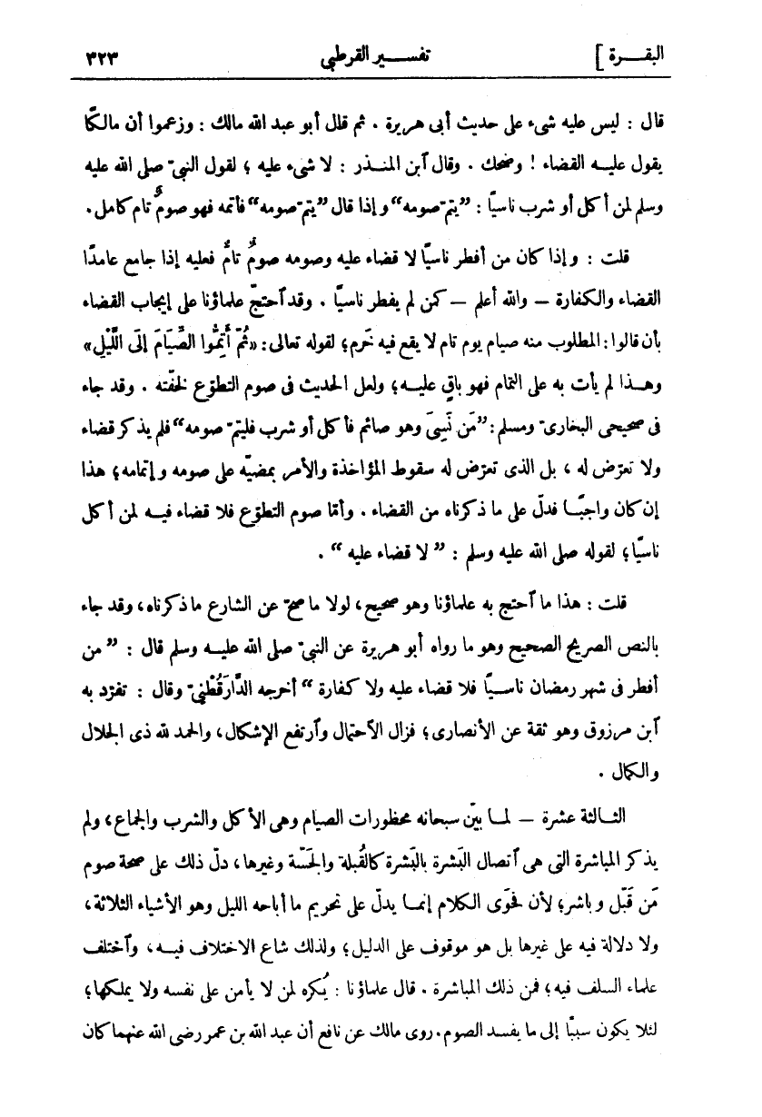 قال: ليس عليه شي على حديث أَبِي هُرَيْرَةَ. ثُمَّ قَالَ أَبُو عَبْدِ اللَّهِ مَالِكٌ: وَزَعَمُوا أَنَّ مَالِكًا يَقُولُ عَلَيْهِ الْقَضَاءُ! وضحك. وقال ابن المنذر: لا شي عَلَيْهِ، لِقَوْلِ النَّبِيِّ صَلَّى اللَّهُ عَلَيْهِ وَسَلَّمَ لِمَنْ أَكَلَ أَوْ شَرِبَ نَاسِيًا: (يَتِمُّ صَوْمَهُ) وَإِذَا قَالَ (يَتِمُّ صَوْمَهُ) فَأَتَمَّهُ فَهُوَ صَوْمٌ تَامٌّ كَامِلٌ. قُلْتُ: وَإِذَا كَانَ مَنْ أَفْطَرَ نَاسِيًا لَا قَضَاءَ عَلَيْهِ وَصَوْمَهُ صَوْمٌ تَامٌّ فَعَلَيْهِ إِذَا جَامَعَ عَامِدًا الْقَضَاءُ وَالْكَفَّارَةُ- وَاللَّهُ أَعْلَمُ- كَمَنْ لَمْ يُفْطِرْ نَاسِيًا. وَقَدِ احْتَجَّ عُلَمَاؤُنَا عَلَى إِيجَابِ الْقَضَاءِ بِأَنْ قَالُوا: الْمَطْلُوبُ منه صيام يوم تام لا يقع فيه خَرْمٌ، لِقَوْلِهِ تَعَالَى:" ثُمَّ أَتِمُّوا الصِّيامَ إِلَى اللَّيْلِ" وَهَذَا لَمْ يَأْتِ بِهِ عَلَى التَّمَامِ فَهُوَ بَاقٍ عَلَيْهِ، وَلَعَلَّ الْحَدِيثَ فِي صَوْمِ التَّطَوُّعِ لِخِفَّتِهِ. وَقَدْ جَاءَ فِي صَحِيحَيِ الْبُخَارِيِّ وَمُسْلِمٍ: (مَنْ نَسِيَ وَهُوَ صَائِمٌ فَأَكَلَ أَوْ شَرِبَ فَلْيُتِمَّ صَوْمَهُ) فَلَمْ يَذْكُرْ قَضَاءً وَلَا تَعَرَّضَ لَهُ، بَلِ الَّذِي تَعَرَّضَ لَهُ سُقُوطُ الْمُؤَاخَذَةِ وَالْأَمْرُ بِمُضِيِّهِ عَلَى صَوْمِهِ وَإِتْمَامِهِ، هَذَا إِنْ كَانَ وَاجِبًا فَدَلَّ عَلَى مَا ذَكَرْنَاهُ من القضاء. وأما صَوْمُ التَّطَوُّعِ فَلَا قَضَاءَ فِيهِ لِمَنْ أَكَلَ نَاسِيًا، لِقَوْلِهِ صَلَّى اللَّهُ عَلَيْهِ وَسَلَّمَ: (لَا قَضَاءَ عَلَيْهِ). قُلْتُ: هَذَا مَا احْتَجَّ بِهِ عُلَمَاؤُنَا وَهُوَ صَحِيحٌ، لَوْلَا مَا صَحَّ عَنِ الشَّارِعِ مَا ذَكَرْنَاهُ، وَقَدْ جَاءَ بِالنَّصِّ الصَّرِيحِ الصَّحِيحِ وَهُوَ مَا رَوَاهُ أَبُو هُرَيْرَةَ عَنِ النَّبِيِّ صَلَّى اللَّهُ عَلَيْهِ وَسَلَّمَ قال: (من أَفْطَرَ فِي شَهْرِ رَمَضَانَ نَاسِيًا فَلَا قَضَاءَ عَلَيْهِ وَلَا كَفَّارَةَ) أَخْرَجَهُ الدَّارَقُطْنِيُّ وَقَالَ: تَفَرَّدَ بِهِ ابْنُ مَرْزُوقٍ وَهُوَ ثِقَةٌ عَنِ الْأَنْصَارِيِّ، فَزَالَ الِاحْتِمَالُ وَارْتَفَعَ الْإِشْكَالُ، وَالْحَمْدُ لِلَّهِ ذِي الْجَلَالِ وَالْكَمَالِ. الثَّالِثَةَ عَشْرَةَ- لَمَّا بَيَّنَ سُبْحَانَهُ مَحْظُورَاتِ الصِّيَامِ وَهِيَ الْأَكْلُ وَالشُّرْبُ وَالْجِمَاعُ، وَلَمْ يَذْكُرِ الْمُبَاشَرَةَ الَّتِي هِيَ اتِّصَالُ الْبَشَرَةِ بِالْبَشَرَةِ كَالْقُبْلَةِ وَالْجَسَّةِ وَغَيْرِهَا، دَلَّ ذَلِكَ عَلَى صِحَّةِ صَوْمِ مَنْ قَبَّلَ وَبَاشَرَ، لِأَنَّ فَحْوَى الْكَلَامِ إِنَّمَا يَدُلُّ عَلَى تَحْرِيمِ مَا أَبَاحَهُ اللَّيْلُ وَهُوَ الْأَشْيَاءُ الثَّلَاثَةُ، وَلَا دَلَالَةَ فِيهِ عَلَى غَيْرِهَا بَلْ هُوَ مَوْقُوفٌ عَلَى الدَّلِيلِ، وَلِذَلِكَ شَاعَ الِاخْتِلَافُ فِيهِ، وَاخْتَلَفَ عُلَمَاءُ السَّلَفِ فِيهِ، فَمِنْ ذَلِكَ الْمُبَاشَرَةُ. قَالَ عُلَمَاؤُنَا: يُكْرَهُ لِمَنْ لَا يَأْمَنُ عَلَى نَفْسِهِ وَلَا يَمْلِكُهَا، لِئَلَّا يَكُونَ سَبَبًا إِلَى مَا يُفْسِدُ الصَّوْمَ. رَوَى مالك عَنْ نَافِعٍ أَنَّ عَبْدِ