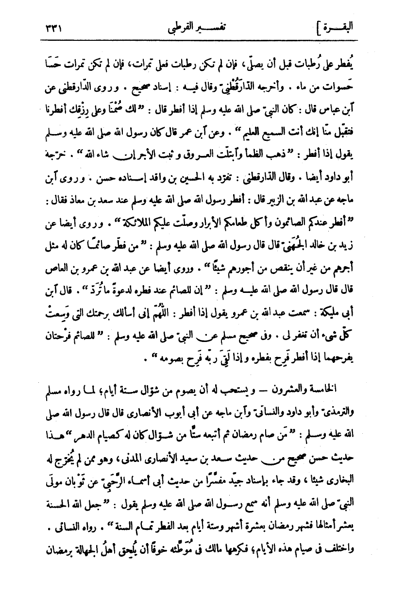 يُفْطِرُ عَلَى رُطَبَاتٍ قَبْلَ أَنْ يُصَلِّيَ، فَإِنْ لَمْ تَكُنْ رُطَبَاتٌ فَعَلَى تَمَرَاتٍ، فَإِنْ لَمْ تَكُنْ تَمَرَاتٌ حَسَا حُسُوَاتٍ مِنْ مَاءٍ. وَأَخْرَجَهُ الدَّارَقُطْنِيُّ وَقَالَ فِيهِ: إِسْنَادٌ صَحِيحٌ. وَرَوَى الدَّارَقُطْنِيُّ عَنِ ابْنِ عَبَّاسٍ قَالَ: كَانَ النَّبِيُّ صَلَّى اللَّهُ عَلَيْهِ وَسَلَّمَ إِذَا أَفْطَرَ قَالَ: (لَكَ صُمْنَا وَعَلَى رِزْقِكَ أَفْطَرْنَا فَتَقَبَّلْ مِنَّا إِنَّكَ أَنْتَ السَّمِيعُ الْعَلِيمُ). وَعَنِ ابْنِ عُمَرَ قَالَ كَانَ رَسُولُ اللَّهِ صَلَّى اللَّهُ عَلَيْهِ وَسَلَّمَ يَقُولُ إِذَا أَفْطَرَ: (ذَهَبَ الظَّمَأُ وَابْتَلَّتِ الْعُرُوقُ وَثَبَتَ الْأَجْرُ إِنْ شَاءَ اللَّهُ). خَرَّجَهُ أَبُو دَاوُدَ أَيْضًا. وَقَالَ الدَّارَقُطْنِيُّ: تَفَرَّدَ بِهِ الْحُسَيْنُ بْنُ وَاقِدٍ إِسْنَادُهُ حَسَنٌ. وَرَوَى ابْنُ مَاجَهْ عَنْ عَبْدِ اللَّهِ بْنِ الزُّبَيْرِ قَالَ: أَفْطَرَ رَسُولُ اللَّهِ صَلَّى اللَّهُ عَلَيْهِ وَسَلَّمَ عِنْدَ سَعْدِ بْنِ مُعَاذٍ فَقَالَ: (أَفْطَرَ عِنْدَكُمُ الصَّائِمُونَ وَأَكَلَ طَعَامَكُمُ الْأَبْرَارُ وَصَلَّتْ عَلَيْكُمُ الْمَلَائِكَةُ). وَرُوِيَ أَيْضًا عَنْ زَيْدِ بْنِ خَالِدٍ الْجُهَنِيِّ قَالَ قَالَ رَسُولُ اللَّهِ صَلَّى اللَّهُ عَلَيْهِ وَسَلَّمَ: (مَنْ فَطَّرَ صَائِمًا كَانَ لَهُ مِثْلُ أَجْرِهِمْ مِنْ غَيْرِ أَنْ يَنْقُصَ مِنْ أُجُورِهِمْ شَيْئًا). وَرُوِيَ أَيْضًا عَنْ عَبْدِ اللَّهِ بْنِ عَمْرِو بْنِ الْعَاصِ قَالَ قَالَ رَسُولُ اللَّهِ صَلَّى اللَّهُ عَلَيْهِ وَسَلَّمَ: (إِنَّ لِلصَّائِمِ عِنْدَ فِطْرِهِ لَدَعْوَةِ مَا تُرَدُّ). قَالَ ابْنُ أَبِي مُلَيْكَةَ: سَمِعْتُ عَبْدَ اللَّهِ بْنِ عَمْرٍو يَقُولُ إِذَا أَفْطَرَ: اللَّهُمَّ إِنِّي أَسْأَلُكَ بِرَحْمَتِكَ الَّتِي وَسِعَتْ كل شي أَنْ تَغْفِرَ لِي. وَفِي صَحِيحِ مُسْلِمٍ عَنِ النَّبِيِّ صَلَّى اللَّهُ عَلَيْهِ وَسَلَّمَ:" لِلصَّائِمِ فَرْحَتَانِ يَفْرَحُهُمَا إِذَا أَفْطَرَ فَرِحَ بِفِطْرِهِ وَإِذَا لَقِيَ رَبَّهُ فَرِحَ بِصَوْمِهِ". الْخَامِسَةُ وَالْعِشْرُونَ- وَيُسْتَحَبُّ لَهُ أَنْ يَصُومَ مِنْ شَوَّالٍ سِتَّةَ أَيَّامٍ، لِمَا رَوَاهُ مُسْلِمٌ وَالتِّرْمِذِيُّ وَأَبُو دَاوُدَ وَالنَّسَائِيُّ وَابْنُ مَاجَهْ عَنْ أَبِي أَيُّوبَ الْأَنْصَارِيِّ قَالَ قَالَ رَسُولُ اللَّهِ صَلَّى اللَّهُ عَلَيْهِ وَسَلَّمَ:" من صَامَ رَمَضَانَ ثُمَّ أَتْبَعَهُ سِتًّا مِنْ شَوَّالٍ كان له كصيام الدهر" هذا حديث صَحِيحٌ مِنْ حَدِيثِ سَعْدِ بْنِ سَعِيدٍ الْأَنْصَارِيِّ الْمَدَنِيِّ، وَهُوَ مِمَّنْ لَمْ يُخَرِّجْ لَهُ الْبُخَارِيُّ شَيْئًا، وَقَدْ جَاءَ بِإِسْنَادٍ جَيِّدٍ مُفَسَّرًا مِنْ حَدِيثِ أَبِي أَسْمَاءَ الرَّحَبِيِّ عَنْ ثَوْبَانَ مَوْلَى النبي صلى الله عليه