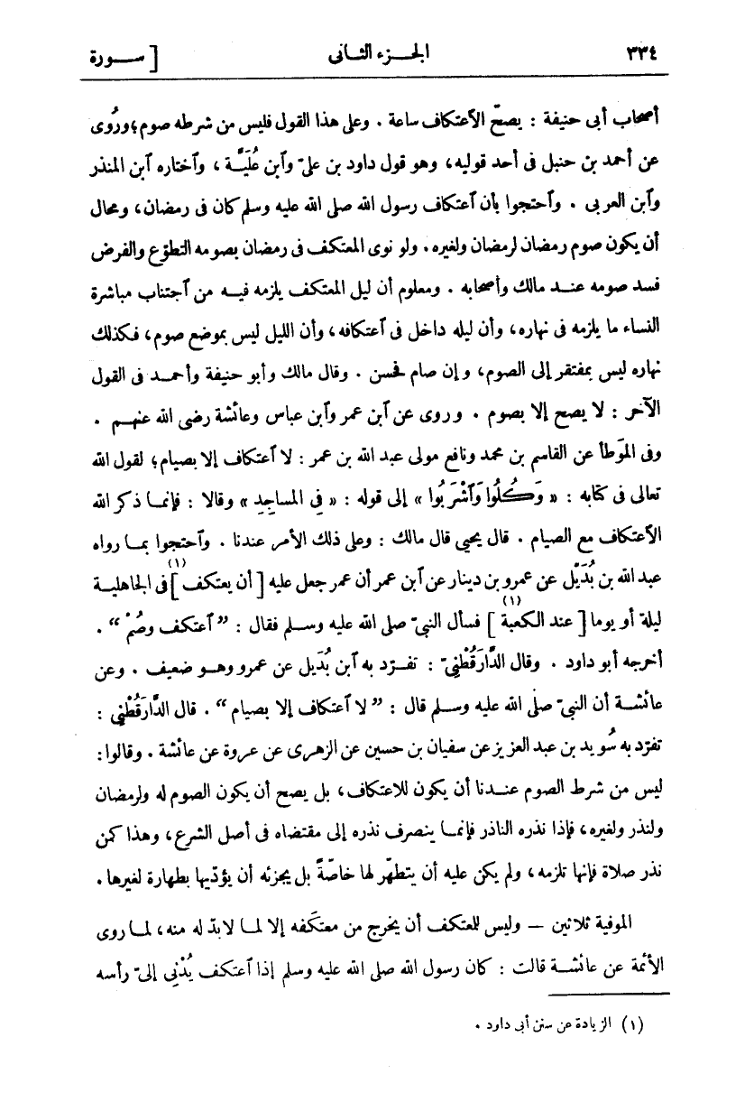 أَصْحَابِ أَبِي حَنِيفَةَ: يَصِحُّ الِاعْتِكَافُ سَاعَةً. وَعَلَى هَذَا الْقَوْلِ فَلَيْسَ مِنْ شَرْطِهِ صَوْمٌ، وَرُوِيَ عَنْ أَحْمَدَ بْنِ حَنْبَلٍ فِي أَحَدِ قَوْلَيْهِ، وَهُوَ قَوْلُ دَاوُدَ بْنِ عَلِيٍّ وَابْنِ عُلَيَّةَ، وَاخْتَارَهُ ابْنُ الْمُنْذِرِ وَابْنُ الْعَرَبِيِّ. وَاحْتَجُّوا بِأَنَّ اعْتِكَافَ رَسُولِ اللَّهِ صَلَّى اللَّهُ عَلَيْهِ وَسَلَّمَ كَانَ فِي رَمَضَانَ، وَمُحَالٌ أَنْ يَكُونَ صَوْمُ رَمَضَانَ لِرَمَضَانَ وَلِغَيْرِهِ. وَلَوْ نَوَى الْمُعْتَكِفُ فِي رَمَضَانَ بِصَوْمِهِ التَّطَوُّعُ وَالْفَرْضُ فَسَدَ صَوْمُهُ عِنْدَ مَالِكٍ وَأَصْحَابِهِ. وَمَعْلُومٌ أَنَّ لَيْلَ الْمُعْتَكِفِ يَلْزَمُهُ فِيهِ مِنَ اجْتِنَابٍ مُبَاشَرَةِ النِّسَاءِ مَا يَلْزَمُهُ في نهاره، وأن ليله داخل أفي اعْتِكَافِهِ، وَأَنَّ اللَّيْلَ لَيْسَ بِمَوْضِعِ صَوْمٍ، فَكَذَلِكَ نَهَارُهُ لَيْسَ بِمُفْتَقِرٍ إِلَى الصَّوْمِ، وَإِنْ صَامَ فَحَسَنٌ، وَقَالَ مَالِكٌ وَأَبُو حَنِيفَةَ وَأَحْمَدُ فِي الْقَوْلِ الْآخَرِ: لَا يَصِحُّ إِلَّا بِصَوْمٍ. وَرُوِيَ عَنِ ابْنِ عُمَرَ وَابْنِ عَبَّاسٍ وَعَائِشَةَ رَضِيَ اللَّهُ عَنْهُمْ. وَفِي الْمُوَطَّأِ عَنِ الْقَاسِمِ بْنِ مُحَمَّدٍ وَنَافِعٍ مَوْلَى عَبْدِ اللَّهِ بْنِ عُمَرَ: لَا اعْتِكَافَ إِلَّا بِصِيَامٍ، لِقَوْلِ اللَّهِ تَعَالَى فِي كِتَابِهِ:" وَكُلُوا وَاشْرَبُوا" إِلَى قَوْلِهِ:" فِي الْمَساجِدِ" وَقَالَا: فَإِنَّمَا ذَكَرَ اللَّهُ الِاعْتِكَافَ مَعَ الصِّيَامِ. قَالَ يَحْيَى قَالَ مَالِكٌ: وَعَلَى ذَلِكَ الْأَمْرُ عِنْدَنَا. وَاحْتَجُّوا بِمَا رَوَاهُ عَبْدُ اللَّهِ بن بديل عن عمر بْنِ دِينَارٍ عَنِ ابْنِ عُمَرَ أَنَّ عُمَرَ جَعَلَ عَلَيْهِ [أَنْ يَعْتَكِفَ «١»] فِي الْجَاهِلِيَّةِ لَيْلَةً أَوْ يَوْمًا [عِنْدَ الْكَعْبَةِ «٢»] فَسَأَلَ النَّبِيُّ صَلَّى اللَّهُ عَلَيْهِ وَسَلَّمَ فَقَالَ:" اعْتَكِفْ وَصُمْ". أَخْرَجَهُ أَبُو دَاوُدَ. وَقَالَ الدَّارَقُطْنِيُّ: تَفَرَّدَ بِهِ ابْنُ بُدَيْلٍ عَنْ عَمْرٍو وَهُوَ ضَعِيفٌ. وَعَنْ عَائِشَةَ أَنَّ النَّبِيَّ صَلَّى اللَّهُ عَلَيْهِ وَسَلَّمَ قَالَ:" لَا اعْتِكَافَ إِلَّا بِصِيَامٍ". قَالَ الدَّارَقُطْنِيُّ: تَفَرَّدَ بِهِ سُوَيْدُ بْنُ عَبْدِ الْعَزِيزِ عَنْ سُفْيَانَ بْنِ حُسَيْنٍ عَنِ الزُّهْرِيِّ عَنْ عُرْوَةَ عَنْ عَائِشَةَ. وَقَالُوا: لَيْسَ مِنْ شَرْطِ الصَّوْمِ عِنْدَنَا أَنْ يَكُونَ لِلِاعْتِكَافُ، بَلْ يَصِحُّ أَنْ يَكُونَ الصَّوْمُ لَهُ وَلِرَمَضَانَ وَلِنَذْرٍ وَلِغَيْرِهِ، فَإِذَا نَذَرَهُ الناذر فإنما ينصرف نذره إِلَى مُقْتَضَاهُ فِي أَصْلِ الشَّرْعِ، وَهَذَا كَمَنْ نذر صلاة فإنما تَلْزَمُهُ، وَلَمْ يَكُنْ عَلَيْهِ أَنْ يَتَطَهَّرَ لَهَا خَاصَّةً بَلْ يُجْزِئُهُ أَنْ يُؤَدِّيَهَا بِطَهَارَةٍ لِغَيْرِهَا. الْمُوَفِّيَةُ ثَلَاثِينَ- وَلَيْسَ لِلْمُعْتَكِفِ أَنْ يَخْرُجَ مِنْ معتكفة إلا لما لأبد لَهُ مِنْهُ، لِمَا رَوَى الْأَئِمَّةُ عَنْ عَائِشَةَ قَالَتْ: كَانَ رَسُولُ اللَّهِ صَلَّى اللَّهُ عَلَيْهِ وَسَلَّمَ إذا اعتكف يدنى إلى رأسه