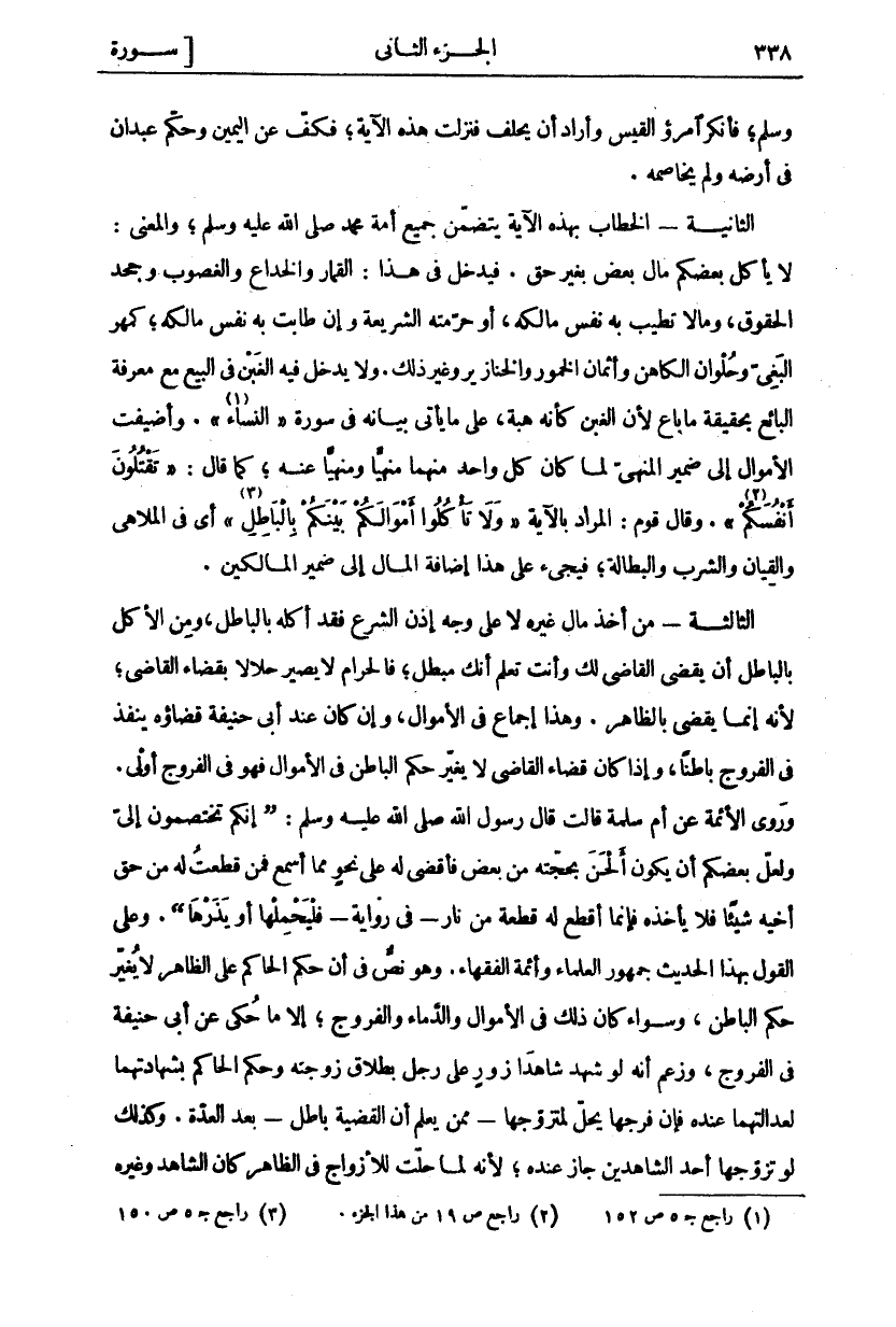وَسَلَّمَ، فَأَنْكَرَ امْرُؤُ الْقَيْسِ وَأَرَادَ أَنْ يَحْلِفَ فنزلت الْآيَةُ، فَكَفَّ عَنِ الْيَمِينِ وَحَكَّمَ عَبْدَانَ فِي أَرْضِهِ وَلَمْ يُخَاصِمْهُ. الثَّانِيَةُ- الْخِطَابُ بِهَذِهِ الْآيَةِ يَتَضَمَّنُ جَمِيعَ أُمَّةِ مُحَمَّدٍ صَلَّى اللَّهُ عَلَيْهِ وَسَلَّمَ، وَالْمَعْنَى: لَا يَأْكُلُ بَعْضكُمْ مَالَ بَعْضٍ بِغَيْرِ حَقٍّ. فَيَدْخُلُ فِي هَذَا: الْقِمَارُ وَالْخِدَاعُ وَالْغُصُوبُ وَجَحْدُ الْحُقُوقِ، وَمَا لَا تَطِيبُ بِهِ نَفْسُ مَالِكِهِ، أَوْ حَرَّمَتْهُ الشَّرِيعَةُ وَإِنْ طَابَتْ به نفس مالكه، كهر الْبَغِيِّ وَحُلْوَانِ الْكَاهِنِ وَأَثْمَانِ الْخُمُورِ وَالْخَنَازِيرِ وَغَيْرِ ذَلِكَ. وَلَا يَدْخُلُ فِيهِ الْغَبْنُ فِي الْبَيْعِ مَعَ مَعْرِفَةِ الْبَائِعِ بِحَقِيقَةِ مَا بَاعَ لِأَنَّ الْغَبْنَ كَأَنَّهُ هِبَةٌ، عَلَى مَا يَأْتِي بَيَانُهُ فِي سُورَةِ" النِّسَاءِ «١» ". وَأُضِيفَتِ الْأَمْوَالُ إِلَى ضَمِيرِ المنتهى لَمَّا كَانَ كُلُّ وَاحِدٌ مِنْهُمَا مَنْهِيًّا وَمَنْهِيًّا عنه، كما قال:" تَقْتُلُونَ أَنْفُسَكُمْ «٢» ". وَقَالَ قَوْمٌ: الْمُرَادُ بِالْآيَةِ" وَلا تَأْكُلُوا أَمْوالَكُمْ بَيْنَكُمْ بِالْباطِلِ «٣» " أَيْ فِي الْمَلَاهِي وَالْقِيَانُ وَالشُّرْبُ وَالْبَطَالَةُ، فَيَجِيءُ عَلَى هَذَا إِضَافَةُ الْمَالِ إِلَى ضَمِيرِ الْمَالِكِينَ. الثَّالِثَةُ- مَنْ أَخَذَ مَالَ غَيْرِهِ لَا عَلَى وَجْهِ إِذْنِ الشَّرْعِ فَقَدْ أكله بالباطل، ومن الأكل بالباطل أن يقتضى الْقَاضِي لَكَ وَأَنْتَ تَعْلَمُ أَنَّكَ مُبْطِلٌ، فَالْحَرَامُ لَا يَصِيرُ حَلَالًا بِقَضَاءِ الْقَاضِي، لِأَنَّهُ إِنَّمَا يَقْضِي بِالظَّاهِرِ. وَهَذَا إِجْمَاعٌ فِي الْأَمْوَالِ، وَإِنْ كَانَ عِنْدَ أَبِي حَنِيفَةَ قَضَاؤُهُ يَنْفُذُ فِي الْفُرُوجِ بَاطِنًا، وَإِذَا كَانَ قَضَاءُ الْقَاضِي لَا يُغَيِّرُ حُكْمَ الْبَاطِنِ فِي الْأَمْوَالِ فَهُوَ فِي الْفُرُوجِ أَوْلَى. وَرَوَى الْأَئِمَّةُ عَنْ أُمِّ سَلَمَةَ قَالَتْ قَالَ رَسُولُ اللَّهِ صَلَّى اللَّهُ عَلَيْهِ وَسَلَّمَ:" إِنَّكُمْ تَخْتَصِمُونَ إِلَيَّ وَلَعَلَّ بَعْضَكُمْ أَنْ يَكُونَ أَلْحَنَ بِحُجَّتِهِ مِنْ بَعْضٍ فَأَقْضِي لَهُ عَلَى نَحْوٍ مِمَّا أَسْمَعُ فَمَنْ قَطَعْتُ لَهُ مِنْ حَقِّ أَخِيهِ شَيْئًا فَلَا يَأْخُذُهُ فَإِنَّمَا أَقْطَعُ لَهُ قِطْعَةً مِنْ نَارٍ- فِي رِوَايَةٍ- فَلْيَحْمِلْهَا أَوْ يَذَرْهَا". وَعَلَى الْقَوْلِ بِهَذَا الْحَدِيثِ جُمْهُورُ الْعُلَمَاءِ وَأَئِمَّةُ الْفُقَهَاءِ. وَهُوَ نَصٌّ فِي أَنَّ حُكْمَ الْحَاكِمِ عَلَى الظَّاهِرِ لَا يُغَيِّرُ حُكْمُ الْبَاطِنِ، وَسَوَاءٌ كَانَ ذَلِكَ فِي الْأَمْوَالِ وَالدِّمَاءِ وَالْفُرُوجِ، إِلَّا مَا حُكِيَ عَنْ أَبِي حَنِيفَةَ فِي الْفُرُوجِ، وَزَعَمَ أَنَّهُ لَوْ شَهِدَ شَاهِدَا زُورٍ عَلَى رَجُلٍ بِطَلَاقِ زَوْجَتِهِ وَحَكَمَ الْحَاكِمُ بِشَهَادَتِهِمَا لِعَدَالَتِهِمَا عِنْدَهُ فَإِنَّ فَرْجَهَا يَحِلُّ لِمُتَزَوِّجِهَا- مِمَّنْ يَعْلَمُ أَنَّ الْقَضِيَّةَ بَاطِلٌ- بَعْدَ الْعِدَّةِ. وَكَذَلِكَ لَوْ تَزَوَّجَهَا أَحَدُ الشَّاهِدَيْنِ جَازَ عِنْدَهُ، لِأَنَّهُ لَمَّا حَلَّتْ لِلْأَزْوَاجِ فِي الظَّاهِرِ كان الشاهد وغيره