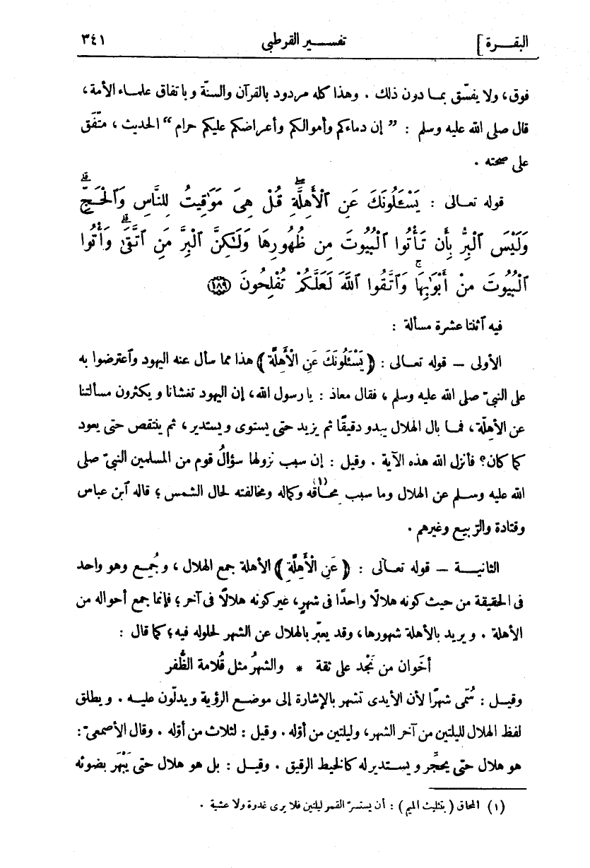 فِيهِ اثْنَتَا عَشْرَةَ مَسْأَلَةً: الْأُولَى- قَوْلُهُ تَعَالَى:" يَسْئَلُونَكَ عَنِ الْأَهِلَّةِ" هَذَا مِمَّا سَأَلَ عَنْهُ الْيَهُودُ وَاعْتَرَضُوا بِهِ عَلَى النَّبِيِّ صَلَّى اللَّهُ عَلَيْهِ وَسَلَّمَ، فَقَالَ مُعَاذٌ: يَا رَسُولَ اللَّهِ، إِنَّ الْيَهُودَ تَغْشَانَا وَيُكْثِرُونَ مَسْأَلَتَنَا عَنِ الْأَهِلَّةِ، فَمَا بَالُ الْهِلَالِ يَبْدُو دَقِيقًا ثُمَّ يَزِيدُ حَتَّى يَسْتَوِيَ وَيَسْتَدِيرَ، ثُمَّ يُنْتَقَصُ حَتَّى يَعُودَ كَمَا كَانَ؟ فَأَنْزَلَ اللَّهُ هَذِهِ الْآيَةَ. وَقِيلَ: إِنَّ سَبَبَ نُزُولِهَا سُؤَالُ قَوْمٍ مِنَ الْمُسْلِمِينَ النَّبِيَّ صَلَّى اللَّهُ عَلَيْهِ وَسَلَّمَ عَنِ الْهِلَالِ وَمَا سَبَبُ مِحَاقِهِ «١» وَكَمَالِهِ وَمُخَالَفَتِهِ لِحَالِ الشَّمْسِ، قَالَهُ ابْنُ عَبَّاسٍ وَقَتَادَةُ وَالرَّبِيعُ وَغَيْرُهُمْ. الثَّانِيَةُ- قَوْلُهُ تَعَالَى:" عَنِ الْأَهِلَّةِ" الْأَهِلَّةُ جَمْعُ الْهِلَالِ، وَجُمِعَ وَهُوَ وَاحِدٌ فِي الْحَقِيقَةِ مِنْ حَيْثُ كَوْنِهِ هِلَالًا وَاحِدًا فِي شَهْرٍ، غَيْرَ كَوْنِهِ هِلَالًا فِي آخَرَ، فَإِنَّمَا جُمِعَ أَحْوَالُهُ مِنَ الْأَهِلَّةِ. وَيُرِيدُ بِالْأَهِلَّةِ شُهُورَهَا، وَقَدْ يُعَبَّرُ بِالْهِلَالِ عَنِ الشَّهْرِ لِحُلُولٍ فِيهِ، كَمَا قَالَ: