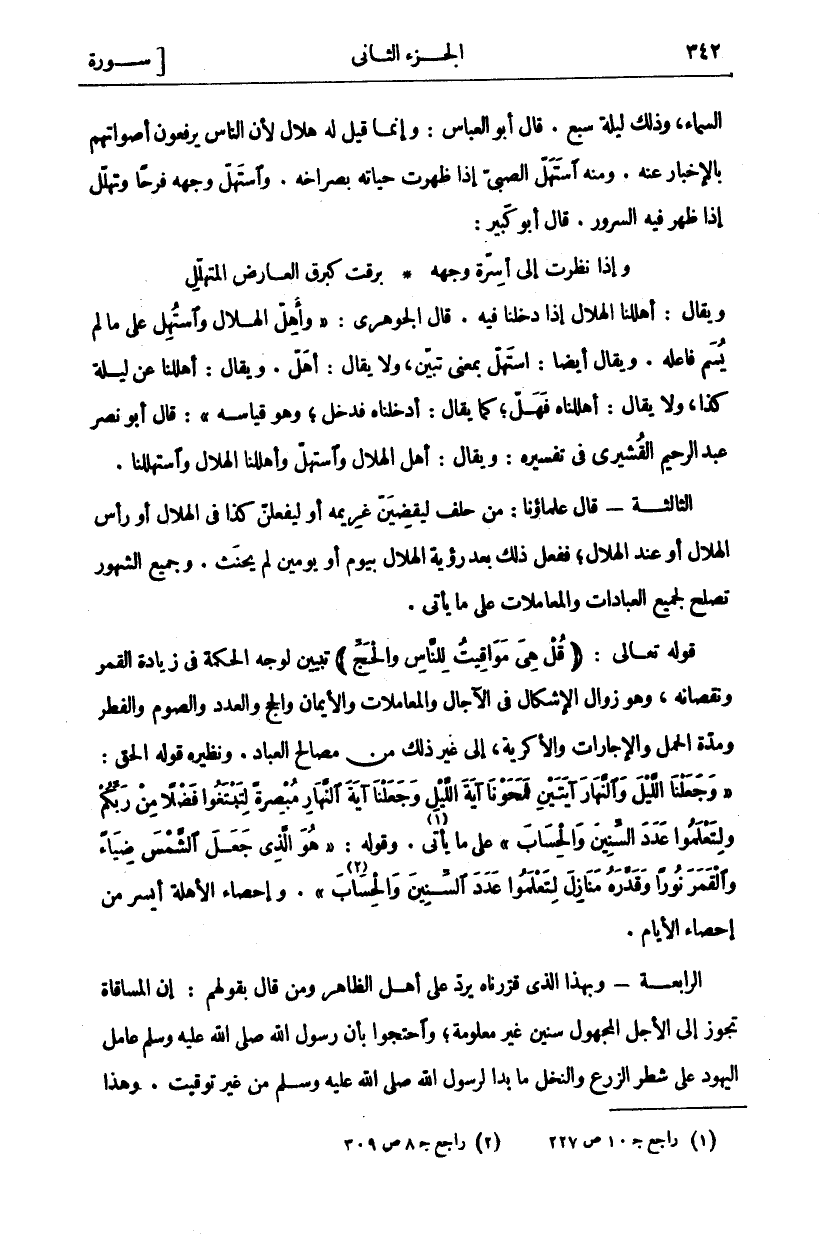 وَيُقَالُ: أَهْلَلْنَا الْهِلَالَ إِذَا دَخَلْنَا فِيهِ. قَالَ الْجَوْهَرِيُّ:" وَأَهَلَّ الْهِلَالُ وَاسْتَهَلَّ عَلَى مَا لَمْ يُسَمَّ فَاعِلُهُ. وَيُقَالُ أَيْضًا: اسْتَهَلَّ بِمَعْنَى تَبَيَّنَ، وَلَا يُقَالُ: أَهَلَّ وَيُقَالُ: أَهْلَلْنَا عَنْ لَيْلَةِ كَذَا، وَلَا يُقَالُ: أَهْلَلْنَاهُ فَهَلَّ، كَمَا يُقَالُ: أَدْخَلْنَاهُ فَدَخَلَ، وَهُوَ قِيَاسُهُ": قَالَ أَبُو نَصْرٍ عَبْدُ الرَّحِيمِ الْقُشَيْرِيُّ فِي تَفْسِيرِهِ: وَيُقَالُ: أَهَلَّ الْهِلَالُ وَاسْتَهَلَّ وَأَهْلَلْنَا الْهِلَالَ وَاسْتَهْلَلْنَا. الثَّالِثَةُ- قَالَ عُلَمَاؤُنَا: مَنْ حَلَفَ لَيَقْضِيَنَّ غَرِيمُهُ أَوْ لَيَفْعَلَنَّ كَذَا فِي الْهِلَالِ أَوْ رَأْسِ الْهِلَالِ أَوْ عِنْدَ الْهِلَالِ، فَفَعَلَ ذَلِكَ بَعْدَ رُؤْيَةِ الْهِلَالِ بِيَوْمٍ أَوْ يَوْمَيْنِ لَمْ يَحْنَثْ. وَجَمِيعُ الشُّهُورِ تَصْلُحُ لِجَمِيعِ الْعِبَادَاتِ وَالْمُعَامَلَاتِ عَلَى مَا يَأْتِي. قَوْلُهُ تَعَالَى:" قُلْ هِيَ مَواقِيتُ لِلنَّاسِ وَالْحَجِّ" تَبْيِينٌ لِوَجْهِ الْحِكْمَةِ فِي زِيَادَةِ الْقَمَرِ وَنُقْصَانِهِ، وَهُوَ زَوَالُ الْإِشْكَالِ فِي الْآجَالِ وَالْمُعَامَلَاتِ وَالْإِيمَانِ وَالْحَجِّ وَالْعَدَدِ وَالصَّوْمِ وَالْفِطْرِ وَمُدَّةِ الْحَمْلِ وَالْإِجَارَاتِ وَالْأَكْرِيَةِ، إِلَى غَيْرِ ذَلِكَ مِنْ مَصَالِحِ الْعِبَادِ. وَنَظِيرُهُ قَوْلُهُ الْحَقُّ:" وَجَعَلْنَا اللَّيْلَ وَالنَّهارَ آيَتَيْنِ فَمَحَوْنا آيَةَ اللَّيْلِ وَجَعَلْنا آيَةَ النَّهارِ مُبْصِرَةً لِتَبْتَغُوا فَضْلًا مِنْ رَبِّكُمْ وَلِتَعْلَمُوا عَدَدَ السِّنِينَ وَالْحِسابَ" [الاسراء: ١٢] عَلَى مَا يَأْتِي «١». وَقَوْلُهُ:" هُوَ الَّذِي جَعَلَ الشَّمْسَ ضِياءً وَالْقَمَرَ نُوراً وَقَدَّرَهُ مَنازِلَ لِتَعْلَمُوا عَدَدَ السِّنِينَ وَالْحِسابَ «٢» " [يونس: ٥]. وَإِحْصَاءُ الْأَهِلَّةِ أَيْسَرُ مِنْ إِحْصَاءِ الْأَيَّامِ. الرَّابِعَةُ- وَبِهَذَا الَّذِي قَرَّرْنَاهُ يَرُدُّ عَلَى أَهْلِ الظَّاهِرِ وَمَنْ قَالَ بِقَوْلِهِمْ: إِنَّ الْمُسَاقَاةَ تَجُوزُ إِلَى الْأَجَلِ الْمَجْهُولِ سِنِينَ غَيْرَ مَعْلُومَةٍ، وَاحْتَجُّوا بِأَنَّ رَسُولَ اللَّهِ صَلَّى اللَّهُ عَلَيْهِ وَسَلَّمَ عَامَلَ الْيَهُودَ عَلَى شَطْرِ الزَّرْعِ وَالنَّخْلِ مَا بَدَا لِرَسُولِ اللَّهِ صَلَّى اللَّهُ عَلَيْهِ وَسَلَّمَ مِنْ غير توقيت. وهذا