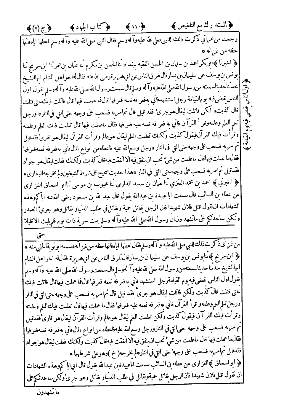 2524- أَخْبَرَنَا أَبُو بَكْرٍ أَحْمَدُ بْنُ سَلْمَانَ بْنِ الْحَسَنِ الْفَقِيهُ بِبَغْدَادَ ، حَدَّثَنَا الْحَسَنُ بْنُ مُكْرَمٍ ، حَدَّثَنَا عُثْمَانُ بْنُ عُمَرَ ، حَدَّثَنَا ابْنُ جُرَيْجٍ ، حَدَّثَنَا يُونُسُ بْنُ يُوسُفَ ، عَنْ سُلَيْمَانَ بْنِ يَسَارٍ ، قَالَ : تَفَرَّقَ النَّاسُ عَنْ أَبِي هُرَيْرَةَ رَضِيَ اللَّهُ عَنْهُ ، فَقَالَ لَهُ أَخُو أَهْلِ الشَّامِ : أَيُّهَا الشَّيْخُ حَدِّثَنَا حَدِيثًا سَمِعْتَهُ مِنْ رَسُولِ اللهِ صَلَّى اللَّهُ عَلَيْهِ وَسَلَّمَ ؟ قَالَ : سَمِعْتُ رَسُولَ اللهِ صَلَّى اللَّهُ عَلَيْهِ وَسَلَّمَ ، يَقُولُ : أَوَّلُ النَّاسِ يُقْضَى فِيهِ يَوْمَ الْقِيَامَةِ ، رَجُلٌ اسْتُشْهِدَ فَأُتِيَ بِهِ ، فَعَرَّفَهُ نِعَمَهُ فَعَرَفَهَا قَالَ : فَمَا عَمِلْتَ فِيهِ ؟ قَالَ : قَاتَلْتُ فِيكَ حَتَّى قُتِلْتُ قَالَ : كَذَبْتَ ، وَلَكِنْ قَاتَلْتَ لِيُقَالَ هُوَ جَرِيءٌ ، فَقَدْ قِيلَ ، قَالَ : ثُمَّ أُمِرَ بِهِ فَسُحِبَ عَلَى وَجْهِهِ ، حَتَّى أُلْقِيَ فِي النَّارِ ، وَرَجُلٌ تَعَلَّمَ الْعِلْمَ ، وَعَلَّمَهُ ، وَقَرَأَ الْقُرْآنَ فَأُتِيَ بِهِ فَعَرَّفَهُ نِعَمَهُ عَلَيْهِ فَعَرَفَهَا ، فَقَالَ : مَا عَمِلْتَ فِيهَا ؟ قَالَ : تَعَلَّمْتُ فِيكَ الْعِلْمَ وَعَلَّمْتُهُ وَقَرَأْتُ فِيكَ الْقُرْآنَ . فَيَقُولُ : كَذَبْتَ وَلَكِنَّكَ تَعَلَّمْتَ الْعِلْمَ لِيُقَالَ هُوَ عَالِمٌ ، وَقَرَأْتَ الْقُرْآنَ ، لِيُقَالَ : هُوَ قَارِئٌ فَقَدْ قِيلَ ، ثُمَّ أُمِرَ بِهِ فَسُحِبَ عَلَى وَجْهِهِ حَتَّى أُلْقِيَ فِي النَّارِ ، وَرَجُلٌ وَسَّعَ اللَّهُ عَلَيْهِ فَأَعْطَاهُ مِنْ أَنْوَاعِ الْمَالِ ، فَأُتِيَ بِهِ فَعَرَّفَهُ نِعَمَهُ فَعَرَفَهَا فَقَالَ : مَا عَمِلْتَ فِيهَا ؟ قَالَ : مَا عَلِمْتُ مِنْ شَيْءٍ تُحِبُّ أَنْ يُنْفِقَ فِيهِ إِلاَّ أَنْفَقْتُ فِيهِ . قَالَ : كَذَبْتَ ، وَلَكِنَّكَ فَعَلْتَ ، لِيُقَالَ هُوَ جَوَادٌ ، فَقَدْ قِيلَ ثُمَّ أُمِرَ بِهِ ، فَسُحِبَ عَلَى وَجْهِهِ ، حَتَّى أُلْقِيَ فِي النَّارِ.