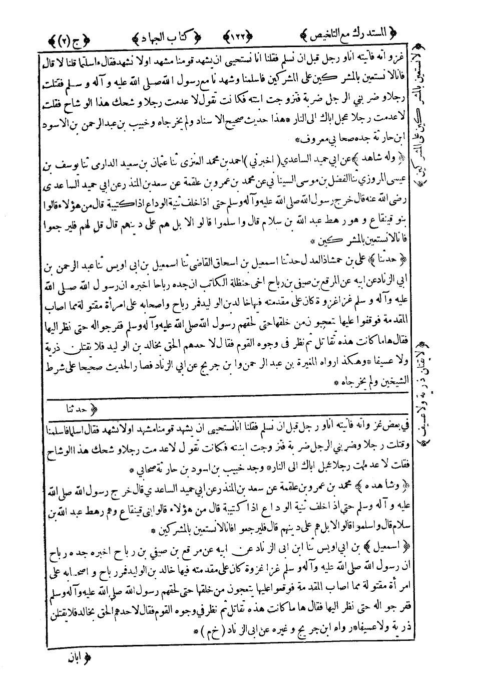 2565- حَدَّثَنَا عَلِيُّ بْنُ حَمْشَاذٍ الْعَدْلُ ، نا إِسْمَاعِيلُ بْنُ إِسْحَاقَ الْقَاضِي ، نا إِسْمَاعِيلُ بْنُ أَبِي أُوَيْسٍ ، نا عَبْدُ الرَّحْمَنِ بْنُ أَبِي الزِّنَادِ ، عَنْ أَبِيهِ ، عَنِ الْمُرَقَّعِ بْنِ صَيْفِيِّ بْنِ رَبَاحٍ ، أَخِي حَنْظَلَةَ الْكَاتِبِ أَنَّ جَدَّهُ رَبَاحًا أَخْبَرَهُ ، أَنَّ رَسُولَ اللهِ صَلَّى اللَّهُ عَلَيْهِ وَسَلَّمَ غَزَا غَزْوَةً كَانَ عَلَى مُقَدِّمَتِهِ ، فِيهَا خَالِدُ بْنُ الْوَلِيدِ فَمَرَّ رَبَاحٌ وَأَصْحَابُهُ عَلَى امْرَأَةٍ مَقْتُولَةٍ ، مِمَّا أَصَابَ الْمُقَدِّمَةُ ، فَوَقَفُوا عَلَيْهَا يَتَعَجَّبُونَ مِنْ خَلْقِهَا ، حَتَّى لَحِقَهُمْ رَسُولُ اللهِ صَلَّى اللَّهُ عَلَيْهِ وَسَلَّمَ فَفَرَّجُوا لَهُ ، حَتَّى نَظَرَ إِلَيْهَا ، فَقَالَ : هَا ، مَا كَانَتْ هَذِهِ تُقَاتِلُ ثُمَّ نَظَرَ فِي وُجُوهِ الْقَوْمِ ، فَقَالَ لأَحَدِهِمْ : الْحَقْ بِخَالِدِ بْنِ الْوَلِيدِ فَلاَ يُقْتُلَنَّ ذُرِّيَّةً ، وَلاَ عَسِيفًا .
