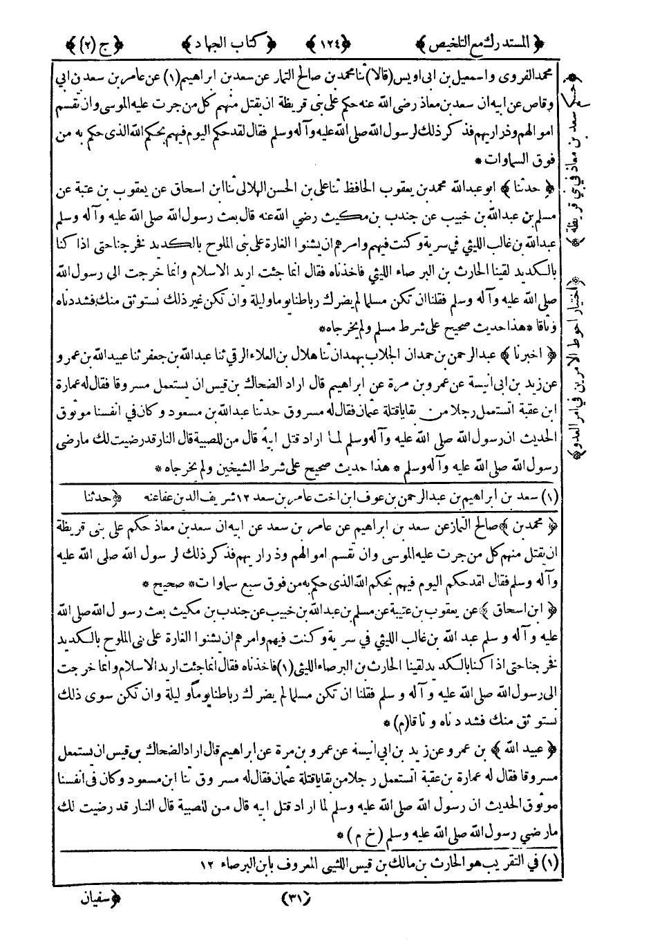 2571- حَدَّثَنَا أَبُو عَبْدِ اللهِ مُحَمَّدُ بْنُ يَعْقُوبَ الْحَافِظُ ، حَدَّثَنَا عَلِيُّ بْنُ الْحَسَنِ الْهِلاَلِيُّ ، حَدَّثَنَا ابْنُ إِسْحَاقَ ، عَنْ يَعْقُوبَ بْنِ عُتْبَةَ ، عَنْ مُسْلِمِ بْنِ عَبْدِ اللهِ بْنِ خُبَيْبٍ ، عَنْ جُنْدَبِ بْنِ مَكِيثٍ رَضِيَ اللَّهُ عَنْهُ ، قَالَ : بَعَثَ رَسُولُ اللهِ صَلَّى اللَّهُ عَلَيْهِ وَسَلَّمَ عَبْدَ اللهِ بْنَ غَالِبٍ اللَّيْثِيَّ فِي سَرِيَّةٍ وَكُنْتُ فِيهِمْ ، وَأَمَرَهُمْ أَنْ يَشُنُّوا الْغَارَةَ عَلَى بَنِي الْمُلَوِّحِ بِالْكَدِيدِ ، فَخَرَجْنَا حَتَّى إِذَا كُنَّا بِالْكَدِيدِ لَقِينَا الْحَارِثَ بْنَ الْبَرْصَاءِ اللَّيْثِيُّ فَأَخَذْنَاهُ فَقَالَ : إِنَّمَا جِئْتُ أُرِيدُ الإِسْلاَمَ ، وَإِنَّمَا خَرَجْتُ إِلَى رَسُولِ اللهِ صَلَّى اللَّهُ عَلَيْهِ وَسَلَّمَ . فَقُلْنَا : إِنْ تَكُنْ مُسْلِمًا لَمْ يَضُرَّكْ رِبَاطُنَا يَوْمًا وَلَيْلَةً ، وَإِنْ تَكُنْ غَيْرَ ذَلِكَ نَسْتَوْثِقُ مِنْكَ ، فَشَدَدْنَاهُ وِثَاقًا.