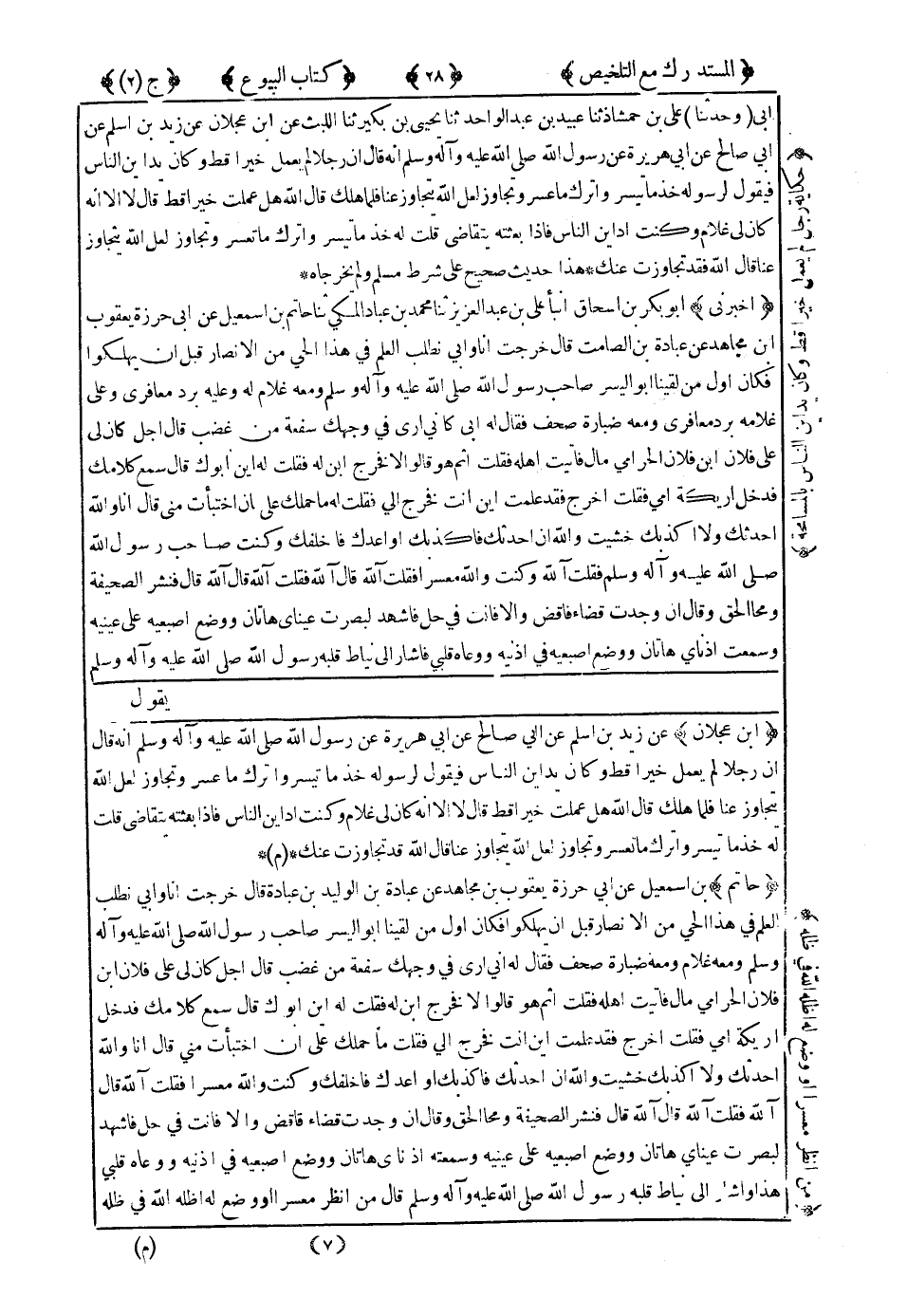 2224- أَخْبَرَنِي أَبُو بَكْرِ بْنُ إِسْحَاقَ ، أَنْبَأَ عَلِيُّ بْنُ عَبْدِ الْعَزِيزِ ، حَدَّثَنَا مُحَمَّدُ بْنُ عَبَّادٍ الْمَكِّيُّ ، حَدَّثَنَا حَاتِمُ بْنُ إِسْمَاعِيلَ ، عَنْ أَبِي حِرْزِةَ يَعْقُوبَ بْنِ مُجَاهِدٍ ، عَنْ عُبَادَةَ بْنِ الصَّامِتِ ، قَالَ : خَرَجْتُ أَنَا وَأَبِي نَطْلُبُ الْعِلْمَ فِي هَذَا الْحَيِّ مِنَ الأَنْصَارِ ، قَبْلَ أَنْ يَهْلِكُوا ، فَكَانَ أَوَّلَ مَنْ لَقِينَا أَبُو الْيَسَرِ صَاحِبُ رَسُولِ اللهِ صَلَّى اللَّهُ عَلَيْهِ وَسَلَّمَ وَمَعَهُ غُلاَمٌ لَهُ ، وَعَلَيْهِ بُرْدٌ مَعَافِرِيٌّ وَعَلَى غُلاَمِهِ بُرْدٌ مَعَافِرِيٌّ وَمَعَهُ ضُبَارَةُ صُحُفٍ ، فَقَالَ لَهُ أَبِي : كَأَنِّي أَرَى فِي وَجْهِكَ سَفْعَةً مِنْ غَضِبٍ . قَالَ : أَجَلْ كَانَ لِي عَلَى فُلاَنِ بْنِ فُلاَنٍ الْحَرَامِيِّ مَالٌ ، فَأَتَيْتُ أَهْلَهُ ، فَقُلْتُ أَثَمَّ هُوَ ؟ قَالُوا : لاَ ، فَخَرَجَ ابْنٌ لَهُ فَقُلْتُ لَهُ : أَيْنَ أَبُوكَ ؟ قَالَ : سَمِعَ كَلاَمَكَ فَدَخَلَ أَرِيكَةَ أُمِّي . فَقُلْتُ : اخْرُجْ فَقَدْ عَلِمْتُ أَيْنَ أَنْتَ ، فَخَرَجَ إِلَيَّ فَقُلْتُ لَهُ مَا حَمَلَكَ عَلَى أَنِ اخْتَبَأْتَ مِنِّي . قَالَ : أَنَا وَاللَّهِ أُحَدِّثُكَ وَلاَ أَكْذِبُكَ ، خَشِيتُ وَاللَّهِ أَنْ أُحَدِّثَكَ فَأَكْذِبَكَ ، أَوْ أَعِدَكَ فَأُخْلِفَكَ ، وَكُنْتَ صَاحِبَ رَسُولِ اللهِ صَلَّى اللَّهُ عَلَيْهِ وَسَلَّمَ فَقُلْتُ : آللَّهِ ، وَكُنْتَ وَاللَّهِ مُعْسِرًا ؟ فَقُلْتُ : آللَّهِ . قَالَ : آللَّهِ . فَقُلْتُ : آللَّهِ . قَالَ : آللَّهِ . قَالَ : فَنَشَرَ الصَّحِيفَةَ وَمَحَا الْحَقَّ ، وَقَالَ إِنْ وَجَدْتَ قَضَاءً فَاقْضِ ، وَإِلاَّ فَأَنْتَ فِي حِلٍّ ، فَأَشْهَدُ لَبَصُرَتْ عَيْنَايَ هَاتَانِ ، وَوَضَعَ إِصْبَعَيْهِ عَلَى عَيْنَيْهِ ، وَسَمِعَتْ أُذُنَايَ هَاتَانِ وَوَضَعَ إِصْبَعَيْهِ فِي أُذُنَيْهِ ، وَوَعَاهُ قَلْبِي ، فَأَشَارَ إِلَى نِيَاطِ قَلْبِهِ رَسُولَ اللهِ صَلَّى اللَّهُ عَلَيْهِ وَسَلَّمَ يَقُولُ : مَنْ أَنْظَرَ مُعْسِرًا وَوَضَعَ لَهُ ، أَظَلَّهُ اللَّهُ فِي ظِلِّهِ.