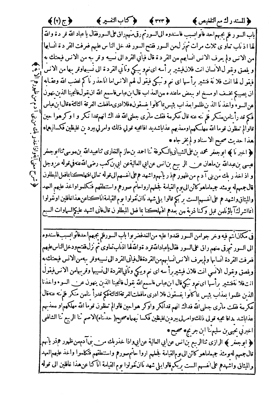 فَأَتَوْا بِسُلَّمٍ فَأَسْنَدُوهُ إِلَى السُّورِ ، ثُمَّ رَقِيَ مِنْهُمْ رَاقٍ عَلَى السُّورِ ، فَقَالَ : يَا عِبَادَ اللهِ قِرَدَةٌ ، وَاللَّهِ لَهَا أَذْنَابٌ تَعَاوَى ثَلاَثَ مَرَّاتٍ ، ثُمَّ نَزَلَ مِنَ السُّورِ فَفَتَحَ السُّورَ ، فَدَخَلَ النَّاسُ عَلَيْهِمْ ، فَعَرَفَتِ الْقِرَدَةُ أَنْسَابَهَا مِنَ الإِنْسِ ، وَلَمْ تَعْرِفِ الإِنْسُ أَنْسَابَهَا مِنَ الْقِرَدَةِ ، قَالَ : فَيَأْتِي الْقَرَدُ إِلَى نَسِيبِهِ وَقَرِيبِهِ مِنَ الإِنْسِ ، فَيَحْتَكُّ بِهِ ، وَيَلْصَقُ ، وَيَقُولُ الإِنْسَانُ : أَنْتَ فُلاَنٌ ؟ فَيُشِيرُ بِرَأْسِهِ أَيْ نَعَمْ ، وَيَبْكِي ، وَتَأْتِي الْقِرَدَةُ إِلَى نَسِيبِهَا وَقَرِيبِهَا مِنَ الإِنْسِ ، فَيَقُولُ لَهَا : أَنْتِ فُلاَنَةٌ ؟ فَتُشِيرُ بِرَأْسِهَا أَيْ نَعَمْ ، وَتَبْكِي ، فَيَقُولُ لَهُمُ الإِنْسُ : أَمَا إِنَّا حَذَّرْنَاكُمْ غَضَبَ اللهِ وَعِقَابَهُ أَنْ يُصِيبَكُمْ بِخَسْفٍ أَوْ مَسْخٍ أَوْ بِبَعْضِ مَا عِنْدَهُ مِنَ الْعَذَابِ قَالَ ابْنُ عَبَّاسٍ : فَاسْمَعِ اللَّهَ يَقُولُ فَأَنْجَيْنَا الَّذِينَ يَنْهَوْنَ عَنِ السُّوءِ وَأَخَذْنَا الَّذِينَ ظَلَمُوا بِعَذَابٍ بَئِيسٍ بِمَا كَانُوا يَفْسُقُونَ فَلاَ أَدْرِي مَا فَعَلَتِ الْفُرْقَةُ الثَّالِثَةُ .