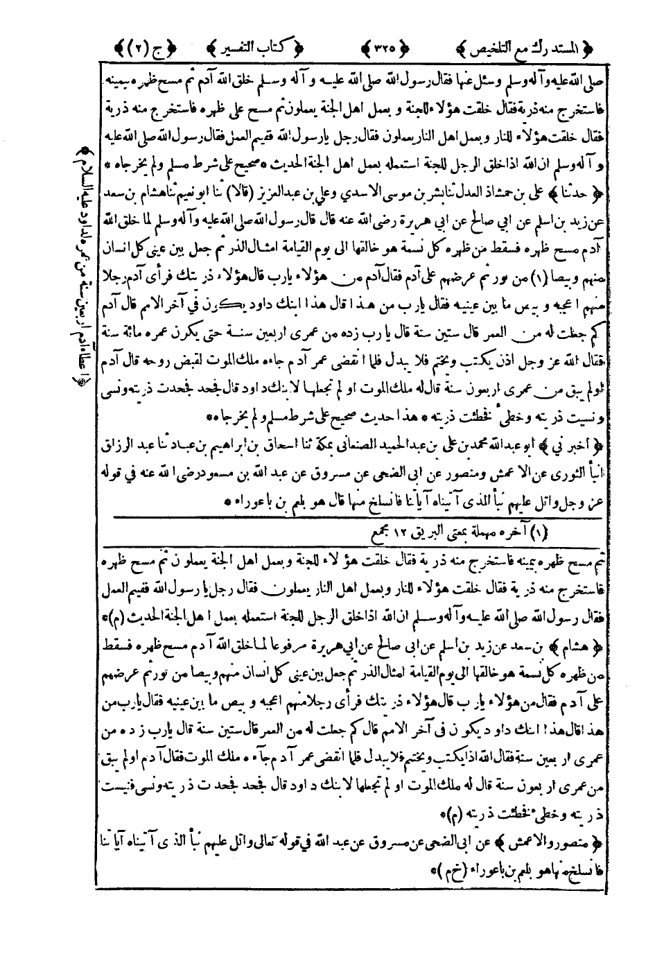 3257- حَدَّثَنَا عَلِيُّ بْنُ حَمْشَاذَ الْعَدْلُ ، حَدَّثَنَا بِشْرُ بْنُ مُوسَى الأَسَدِيُّ ، وَعَلِيُّ بْنُ عَبْدِ الْعَزِيزِ ، قَالاَ : حَدَّثَنَا أَبُو نُعَيْمٍ ، حَدَّثَنَا هِشَامُ بْنُ سَعْدٍ ، عَنْ زَيْدِ بْنِ أَسْلَمَ ، عَنْ أَبِي صَالِحٍ ، عَنْ أَبِي هُرَيْرَةَ رَضِيَ اللَّهُ عَنْهُ ، قَالَ : قَالَ رَسُولُ اللهِ صَلَّى اللَّهُ عَلَيْهِ وَسَلَّمَ : لَمَّا خَلَقَ اللَّهُ آدَمَ مَسَحَ ظَهْرَهُ ، فَسَقَطَ مِنْ ظَهْرِهِ كُلُّ نَسَمَةٍ هُوَ خَالِقُهَا إِلَى يَوْمِ الْقِيَامَةِ ، أَمْثَالَ الذَّرِّ ، ثُمَّ جَعَلَ بَيْنَ عَيْنَيْ كُلِّ إِنْسَانٍ مِنْهُمْ وَبِيصًا مِنْ نُورٍ ، ثُمَّ عَرَضَهُمْ عَلَى آدَمَ ، فَقَالَ آدَمُ : مَنْ هَؤُلاَءِ يَا رَبِّ ؟ قَالَ : هَؤُلاَءِ ذُرِّيَّتِكَ ، فَرَأَى آدَمُ رَجُلاً مِنْهُمْ أَعْجَبَهُ وَبِيصُ مَا بَيْنَ عَيْنَيْهِ فَقَالَ : يَا رَبِّ مَنْ هَذَا ؟ قَالَ : هَذَا ابْنُكَ دَاوُدُ يَكُونُ فِي آخِرِ الآُمَمِ قَالَ آدَمُ : كَمْ جَعَلْتَ لَهُ مِنَ الْعُمُرِ ؟ قَالَ : سِتِّينَ سَنَةً . قَالَ : يَا رَبِّ زِدْهُ مِنْ عُمْرِي أَرْبَعِينَ سَنَةً ، حَتَّى يَكُونَ عُمْرُهُ مِائَةَ سَنَةٍ . فَقَالَ اللَّهُ عَزَّ وَجَلَّ : إِذَنْ يُكْتَبُ وَيُخْتَمُ فَلاَ يُبَدَّلْ . فَلَمَّا انْقَضَى عُمْرُ آدَمَ جَاءَهُ مَلَكُ الْمَوْتِ لَقَبْضِ رُوحِهِ ، قَالَ آدَمُ أَوَ لَمْ يَبْقَ مِنْ عُمْرِي أَرْبَعُونَ سَنَةً ؟ قَالَ لَهُ مَلَكُ الْمَوْتِ أَوَ لَمْ تَجْعَلْهَا لِابْنِكَ دَاوُدَ ؟ قَالَ : فَجَحَدَ فَجَحَدَتْ ذُرِّيَّتُهُ وَنَسِيَ وَنَسِيَتْ ذُرِّيَّتُهُ وَخَطِئَ فَخَطِئَتْ ذُرِّيَّتُهُ.