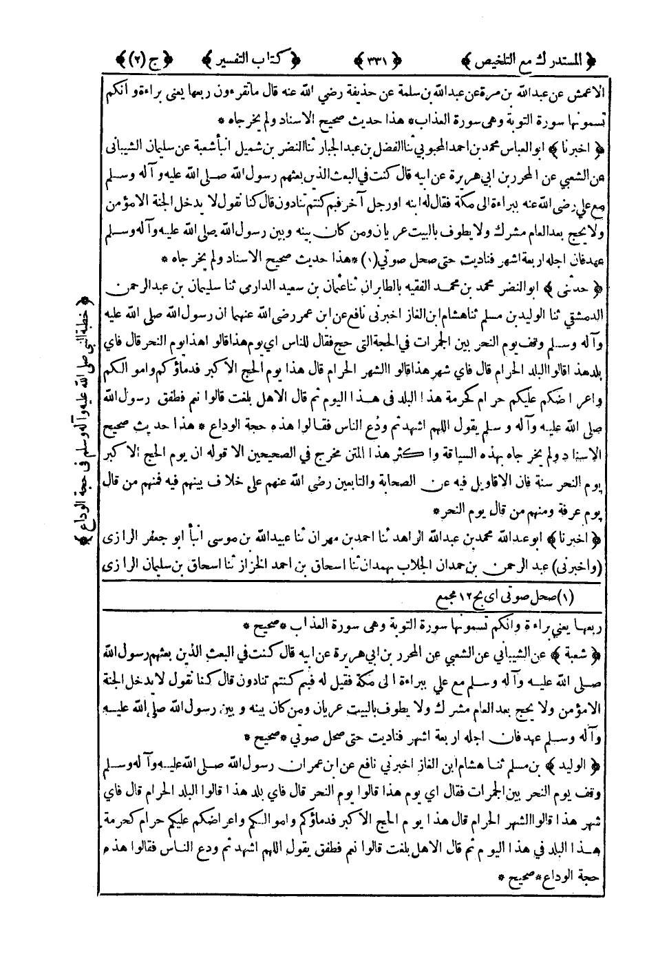هَذَا حَدِيثٌ صَحِيحُ الإِسْنَادِ وَلَمْ يُخْرِجَاهُ بِهَذِهِ السِّيَاقَةِ وَأَكْثَرُ هَذَا الْمَتْنِ مُخَرَّجٌ فِي الصَّحِيحَيْنِ إِلاَّ قَوْلُهُ : إِنَّ يَوْمَ الْحَجِّ الأَكْبَرِ يَوْمَ النَّحْرِ سُنَّةٌ ، فَإِنَّ الأَقَاوِيلَ فِيهِ عَنِ الصَّحَابَةِ وَالتَّابِعِينَ رَضِيَ اللَّهُ عَنْهُمْ عَلَى خِلاَفٍ بَيْنَهُمْ فِيهِ فَمِنْهُمْ مَنْ قَالَ : يَوْمُ عَرَفَةَ ، وَمِنْهُمْ مَنْ قَالَ : يَوْمُ النَّحْرِ.