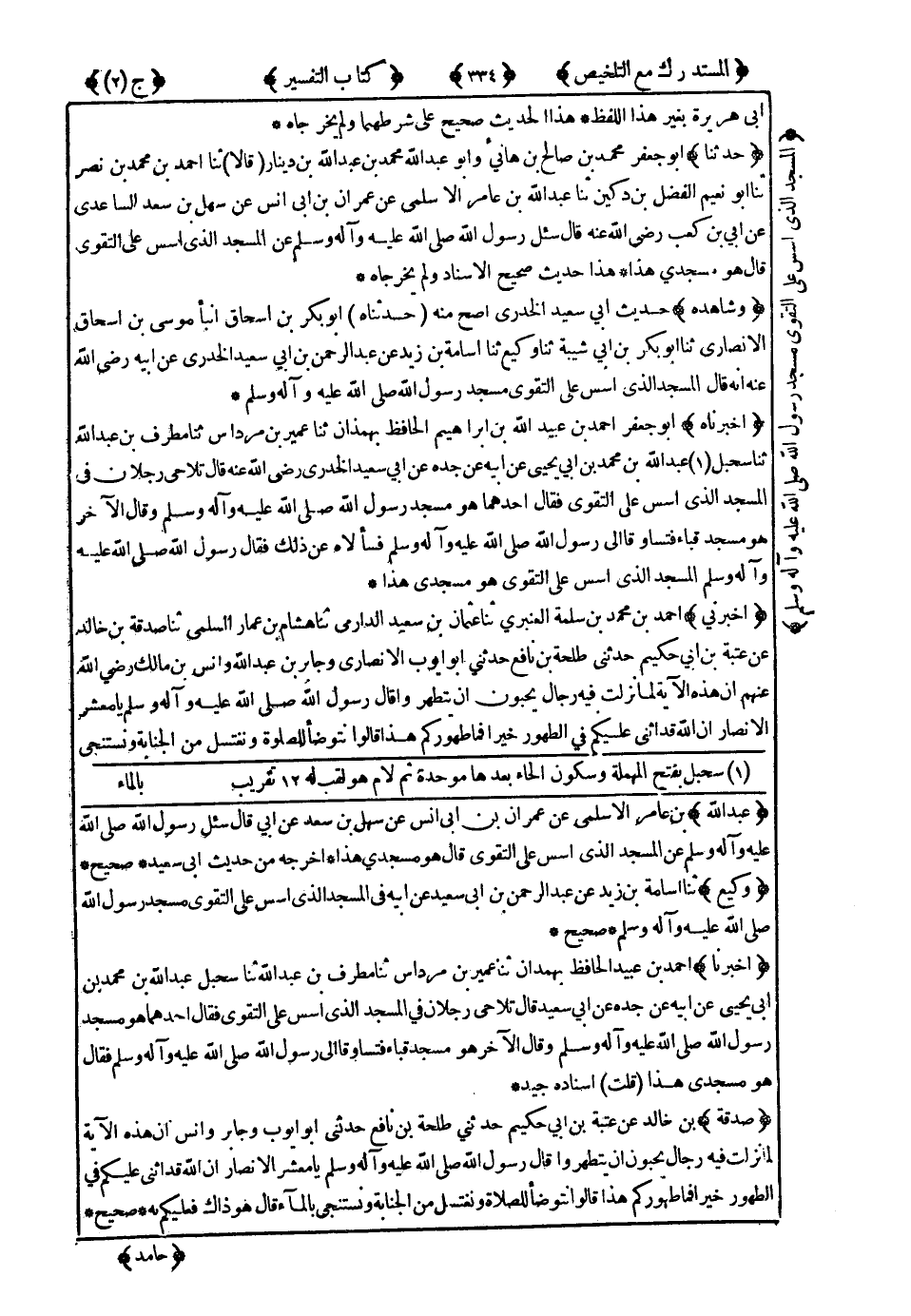 3286- أَخْبَرَنَاهُ أَبُو جَعْفَرٍ أَحْمَدُ بْنُ عُبَيْدِ بْنِ إِبْرَاهِيمَ الْحَافِظُ بِهَمْدَانَ ، حَدَّثَنَا عُمَيْرُ بْنُ مِرْدَاسٍ ، حَدَّثَنَا مُطَرِّفُ بْنُ عَبْدِ اللهِ ، حَدَّثَنَا سَحْبَلٌ عَبْدُ اللهِ بْنُ مُحَمَّدِ بْنِ أَبِي يَحْيَى ، عَنْ أَبِيهِ ، عَنْ جَدِّهِ ، عَنْ أَبِي سَعِيدٍ الْخُدْرِيِّ رَضِيَ اللَّهُ عَنْهُ ، قَالَ : تَلاَحَى رَجُلاَنِ فِي الْمَسْجِدِ الَّذِي أُسِّسَ عَلَى التَّقْوَى ، فَقَالَ أَحَدُهُمَا : هُوَ مَسْجِدُ رَسُولِ اللهِ صَلَّى اللَّهُ عَلَيْهِ وَسَلَّمَ وَقَالَ الآخَرُ : هُوَ مَسْجِدُ قُبَاءَ فَتَسَاوَقَا إِلَى رَسُولِ اللهِ صَلَّى اللَّهُ عَلَيْهِ وَسَلَّمَ فَسَأَلاَهُ عَنْ ذَلِكَ فَقَالَ رَسُولُ اللهِ صَلَّى اللَّهُ عَلَيْهِ وَسَلَّمَ : الْمَسْجِدُ الَّذِي أُسِّسَ عَلَى التَّقْوَى هُوَ مَسْجِدِي هَذَا.
