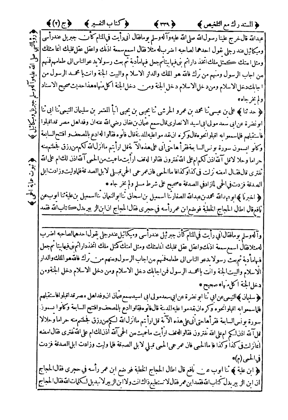3300- حَدَّثَنَا عَلِيُّ بْنُ عِيسَى ، حَدَّثَنَا مُحَمَّدُ بْنُ عَمْرٍو الْحَرَشِيُّ ، حَدَّثَنَا يَحْيَى بْنُ يَحْيَى ، أَنْبَأَ الْمُعْتَمِرُ بْنُ سُلَيْمَانَ التَّيْمِيُّ ، حَدَّثَنَا أَبِي ، حَدَّثَنَا أَبُو نَضْرَةَ ، عَنْ أَبِي سَعْدٍ ، مَوْلَى أَبِي أُسَيْدٍ الأَنْصَارِيِّ قَالَ : سَمِعَ عُثْمَانُ بْنُ عَفَّانَ رَضِيَ اللَّهُ عَنْهُ ، أَنَّ وَفْدَ أَهْلِ مِصْرَ قَدْ أَقْبَلُوا ، فَاسْتَقْبَلَهُمْ ، فَلَمَّا سَمِعُوا بِهِ ، أَقْبَلُوا نَحْوَهُ قَالَ : وَكَرِهَ أَنْ يَقْدَمُوا عَلَيْهِ الْمَدِينَةَ ، قَالَ : فَأَتَوْهُ فَقَالُوا لَهُ : ادْعُ بِالْمُصْحَفِ ، وَافْتَتَحِ السَّابِعَةَ ، وَكَانُوا يُسَمُّونَ سُورَةَ يُونُسَ السَّابِعَةَ ، فَقَرَأَهَا حَتَّى أَتَى عَلَى هَذِهِ الآيَةِ {قُلْ أَرَأَيْتُمْ مَا أَنْزَلَ اللَّهُ لَكُمْ مِنْ رِزْقٍ فَجَعَلْتُمْ مِنْهُ حَرَامًا وَحَلاَلاً قُلْ آللَّهُ أَذِنَ لَكُمْ أَمْ عَلَى اللهِ تَفْتَرُونَ} فَقَالُوا لَهُ : قِفْ ، أَرَأَيْتَ مَا حَمَيْتَ مِنَ الْحِمَى آللَّهُ أَذِنَ لَكَ أَمْ عَلَى اللهِ تَفْتَرِي ؟ قَالَ : فَقَالَ : امْضِهْ ، نَزَلَتْ فِي كَذَا وَكَذَا فَأَمَّا الْحِمَى فَإِنَّ عُمَرَ حَمَى الْحِمَى قَبْلِي لِإِبِلِ الصَّدَقَةِ ، فَلَمَّا وُلِّيتُ ، وَزَادَتْ إِبِلُ الصَّدَقَةِ ، فَزِدْتُ فِي الْحِمَى ، لَمَا زَادَ فِي الصَّدَقَةِ.