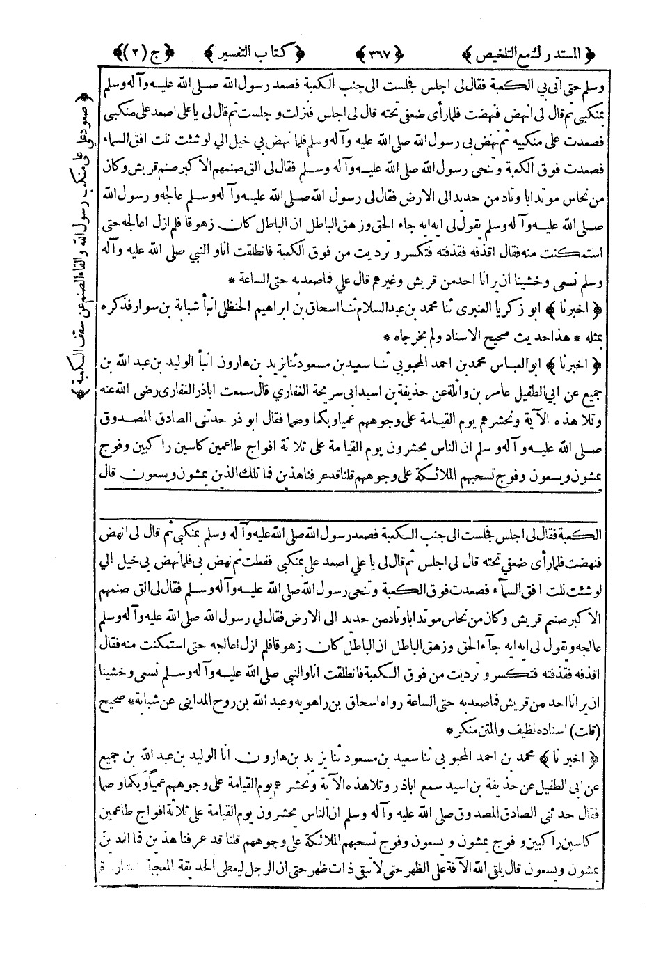 3389- أَخْبَرَنَا أَبُو الْعَبَّاسِ مُحَمَّدُ بْنُ أَحْمَدَ الْمَحْبُوبِيُّ ، حَدَّثَنَا سَعِيدُ بْنُ مَسْعُودٍ ، حَدَّثَنَا يَزِيدُ بْنُ هَارُونَ ، أَنْبَأَ الْوَلِيدُ بْنُ عَبْدِ اللهِ بْنِ جَمِيعٍ ، عَنْ أَبِي الطُّفَيْلِ عَامِرِ بْنِ وَاثِلَةَ ، عَنْ حُذَيْفَةَ بْنِ أَسِيدٍ أَبِي سَرِيحَةَ الْغِفَارِيِّ ، قَالَ : سَمِعْتُ أَبَا ذَرٍّ الْغِفَارِيَّ رَضِيَ اللَّهُ عَنْهُ ، وَتَلاَ هَذِهِ الآيَةَ {وَنَحْشُرُهُمْ يَوْمَ الْقِيَامَةِ عَلَى وُجُوهِهِمْ عُمْيًا وَبُكْمًا وَصُمًّا} فَقَالَ أَبُو ذَرٍّ : حَدَّثَنِي الصَّادِقُ الْمَصْدُوقُ صَلَّى اللَّهُ عَلَيْهِ وَسَلَّمَ : إِنَّ النَّاسَ يُحْشَرُونَ يَوْمَ الْقِيَامَةِ عَلَى ثَلاَثَةِ أَفْوَاجٍ طَاعِمِينَ كَاسِينَ رَاكِبِينَ ، وَفَوْجٌ يَمْشُونَ وَيَسْعَوْنَ ، وَفَوْجٌ تَسْحَبُهُمُ الْمَلاَئِكَةُ عَلَى وُجُوهِهِمْ قُلْنَا : قَدْ عَرَفْنَا هَذَيْنِ فَمَا تِلْكَ الَّذِينَ يَمْشُونَ وَيَسْعَوْنَ ؟ قَالَ : يُلْقِي اللَّهُ الآفَةَ عَلَى الظَّهْرِ حَتَّى لاَ تَبْقَى ذَاتُ ظَهْرٍ حَتَّى إِنَّ الرَّجُلَ لَيُعْطِي الْحَدِيقَةَ الْمُعْجِبَةَ بِالشَّارِدَةِ ذَاتِ الْقَتَبِ.