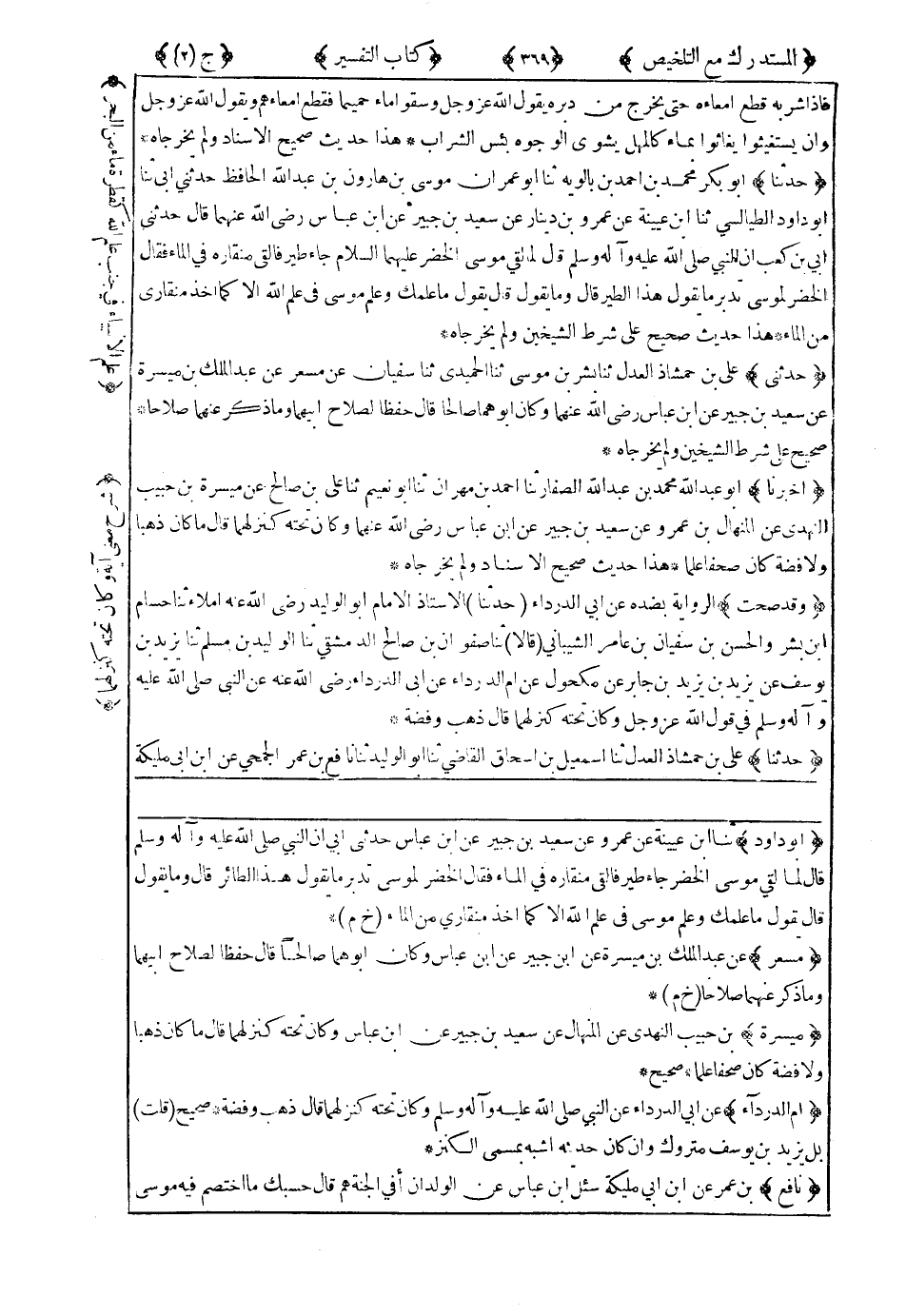 3394- حَدَّثَنَا أَبُو بَكْرٍ مُحَمَّدُ بْنُ أَحْمَدَ بْنِ بَالَوَيْهِ ، حَدَّثَنَا أَبُو عِمْرَانَ مُوسَى بْنُ هَارُونَ بْنِ عَبْدِ اللهِ الْحَافِظُ ، حَدَّثَنِي أَبِي ، حَدَّثَنَا أَبُو دَاوُدَ الطَّيَالِسِيُّ ، حَدَّثَنَا ابْنُ عُيَيْنَةَ ، عَنْ عَمْرِو بْنِ دِينَارٍ ، عَنْ سَعِيدِ بْنِ جُبَيْرٍ ، عَنِ ابْنِ عَبَّاسٍ رَضِيَ اللَّهُ عَنْهُمَا ، قَالَ : حَدَّثَنِي أُبَيُّ بْنُ كَعْبٍ ، أَنَّ النَّبِيَّ صَلَّى اللَّهُ عَلَيْهِ وَسَلَّمَ قَالَ : لَمَّا لَقِيَ مُوسَى الْخَضِرَ عَلَيْهِمَا السَّلاَمُ جَاءَ طَيْرٌ فَأَلْقَى مِنْقَارَهُ فِي الْمَاءِ ، فَقَالَ الْخَضِرُ لِمُوسَى تَدَبَّرْ مَا يَقُولُ هَذَا الطَّيْرُ ، قَالَ : وَمَا يَقُولُ ؟ قَالَ : يَقُولُ : مَا عِلْمُكَ وَعِلْمُ مُوسَى فِي عِلْمِ اللهِ إِلاَّ كَمَا أَخَذَ مِنْقَارِي مِنَ الْمَاءِ.