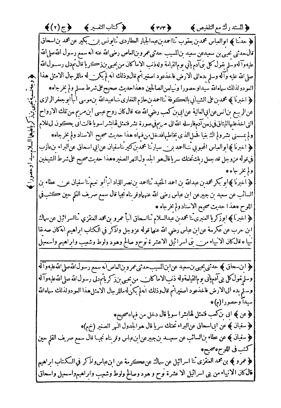 3411- حَدَّثَنَا أَبُو الْعَبَّاسِ مُحَمَّدُ بْنُ يَعْقُوبَ ، حَدَّثَنَا أَحْمَدُ بْنُ عَبْدٍ الْجَبَّارِ الْعُطَارِدِيُّ ، حَدَّثَنَا يُونُسُ بْنُ بُكَيْرٍ ، عَنْ مُحَمَّدِ بْنِ إِسْحَاقَ ، قَالَ : حَدَّثَنِي يَحْيَى بْنُ سَعِيدٍ ، عَنْ سَعِيدِ بْنِ الْمُسَيَّبِ ، حَدَّثَنِي عَمْرُو بْنُ الْعَاصِ رَضِيَ اللَّهُ عَنْهُ ، أَنَّهُ سَمِعَ رَسُولَ اللهِ صَلَّى اللَّهُ عَلَيْهِ وَسَلَّمَ ، يَقُولُ : كُلُّ بَنِي آدَمَ يَأْتِي يَوْمَ الْقِيَامَةِ وَلَهُ ذَنْبٌ إِلاَّ مَا كَانَ مِنْ يَحْيَى بْنِ زَكَرِيَّا قَالَ : ثُمَّ دَلَّى رَسُولُ اللهِ صَلَّى اللَّهُ عَلَيْهِ وَسَلَّمَ يَدَهُ إِلَى الأَرْضِ فَأَخَذَ عُودًا صَغِيرًا ثُمَّ قَالَ : وَذَلِكَ أَنَّهُ لَمْ يَكُنْ لَهُ مَا لِلرِّجَالِ إِلاَّ مِثْلُ هَذَا الْعُودِ لِذَلِكَ سَمَّاهُ اللَّهُ سَيِّدًا وَحَصُورًا وَنَبِيًّا مِنَ الصَّالِحِينَ.