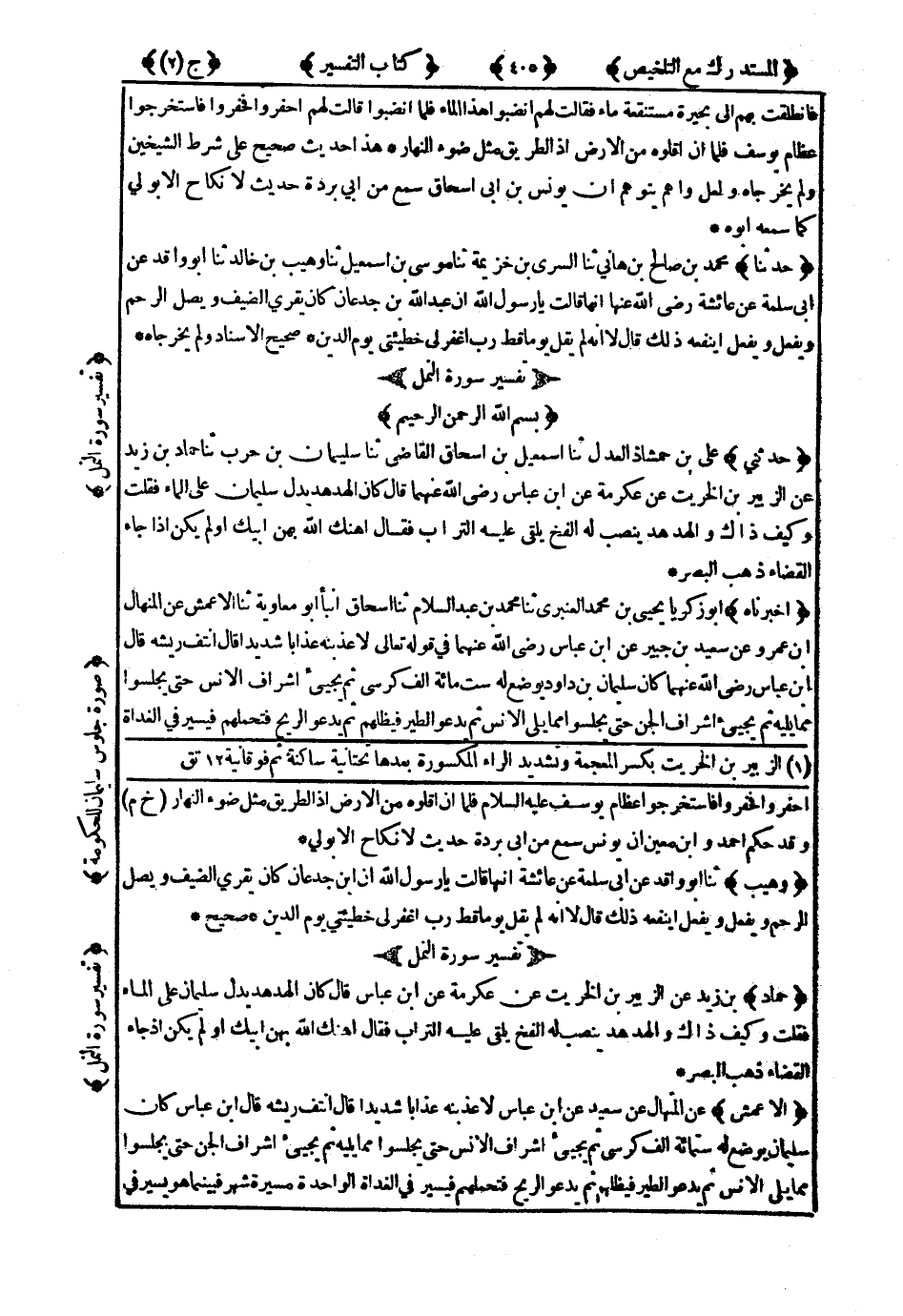 3526- أَخْبَرَنَاهُ أَبُو زَكَرِيَّا يَحْيَى بْنُ مُحَمَّدٍ الْعَنْبَرِيُّ ، حَدَّثَنَا مُحَمَّدُ بْنُ عَبْدِ السَّلاَمِ ، حَدَّثَنَا إِسْحَاقُ ، أَنْبَأَ أَبُو مُعَاوِيَةَ ، حَدَّثَنَا الأَعْمَشُ ، عَنِ الْمِنْهَالِ بْنِ عَمْرٍو ، عَنْ سَعِيدِ بْنِ جُبَيْرٍ ، عَنِ ابْنِ عَبَّاسٍ رَضِيَ اللَّهُ عَنْهُمَا ، فِي قَوْلِهِ تَعَالَى : {لاَُعَذِّبَنَّهُ عَذَابًا شَدِيدًا} قَالَ : أَنْتُفُ رِيشَهُ . قَالَ ابْنُ عَبَّاسٍ رَضِيَ اللَّهُ عَنْهُمَا : كَانَ سُلَيْمَانُ بْنُ دَاوُدَ يُوضَعُ لَهُ سِتُّ مِائَةِ أَلْفِ كُرْسِيٍّ ، ثُمَّ يَجِيءُ أَشْرَافُ الإِنْسِ حَتَّى يَجْلِسُوا مِمَّا يَلِيهِ ، ثُمَّ يَجِيءُ أَشْرَافُ الْجِنِّ حَتَّى يَجْلِسُوا مِمَّا يَلِي الإِنْسَ ، ثُمَّ يَدْعُو الطَّيْرَ فَيُظِلُّهُمْ ، ثُمَّ يَدْعُو الرِّيحَ فَتَحْمِلُهُمْ ، فَيَسِيرُ فِي الْغَدَاةِ الْوَاحِدَةِ مَسِيرَةَ شَهْرٍ فَبَيْنَمَا هُوَ يَسِيرُ فِي فَلاَةٍ إِذِ احْتَاجَ إِلَى الْمَاءِ فَجَاءَ الْهُدْهُدُ فَجَعَلَ يَنْقُرُ الأَرْضَ فَأَصَابَ مَوْضِعَ الْمَاءَ ، فَجَاءَتِ الشَّيَاطِينُ فَسَلَخَتْ ذَلِكَ الْمَوْضِعَ كَمَا تَسْلُخُ الإِهَابَ فَأَصَابُوا الْمَاءَ فَقَالَ نَافِعُ بْنُ الأَزْرَقِ : يَا وَقَّافُ ، أَرَأَيْتَ الْهُدْهُدَ كَيْفَ يَجِيءُ فَيَنْقُرُ الأَرْضَ فَيُصِيبُ مَوْضِعَ الْمَاءَ وَهُوَ يَجِيءُ إِلَى الْفَخِّ وَهُوَ يُبْصِرُهُ حَتَّى يَقَعَ فِي عُنُقِهِ ؟ فَقَالَ ابْنُ عَبَّاسٍ رَضِيَ اللَّهُ عَنْهُمَا : إِنَّ الْقَدْرَ إِذَا جَاءَ حَالَ دُونَ الْبَصَرِ.