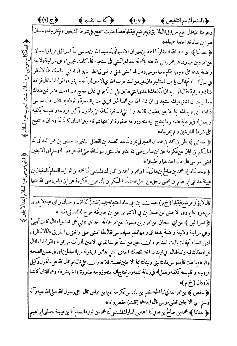 3530- حَدّثَنَا أَبُو عَبْدِ اللهِ الصَّفَّارُ ، حَدَّثَنَا أَحْمَدُ بْنُ مِهْرَانَ الأَصْبَهَانِيُّ ، حَدَّثَنَا عُبَيْدُ اللهِ بْنُ مُوسَى ، أَنْبَأَ إِسْرَائِيلُ ، عَنْ أَبِي إِسْحَاقَ ، عَنْ عَمْرِو بْنِ مَيْمُونٍ ، عَنْ عُمَرَ رَضِيَ اللَّهُ عَنْهُ : {فَجَاءَتْهُ إِحْدَاهُمَا تَمْشِي عَلَى اسْتِحْيَاءٍ} قَالَ : كَانَتْ تَجِيءُ وَهِيَ خَرَّاجَةٌ وَلاَّجَةٌ وَاضِعَةٌ يَدَهَا عَلَى وَجْهِهَا ، فَقَامَ مَعَهَا مُوسَى وَقَالَ لَهَا : امْشِي خَلْفِي وَانْعَتِي لِيَ الطَّرِيقَ وَأَنَا أَمْشِي أَمَامَكَ ، فَإِنَّا لاَ نَنْظُرُ فِي أَدْبَارِ النِّسَاءِ ، ثُمَّ قَالَتْ : {يَا أَبَتِ اسْتَأْجِرْهُ إِنَّ خَيْرَ مَنِ اسْتَأْجَرْتَ الْقَوِيُّ الأَمِينُ} لِمَا رَأَتْهُ مِنْ قُوَّتِهِ وَلِقَوْلِهِ لَهَا مَا قَالَ فَزَادَهُ ذَلِكَ فِيهِ رَغْبَةً فَقَالَ : {إِنِّي أُرِيدُ أَنْ أُنْكِحَكَ إِحْدَى ابْنَتَيَّ هَاتَيْنِ عَلَى أَنْ تَأْجُرَنِي ثَمَانِيَ حِجَجٍ ، فَإِنْ أَتْمَمْتَ عَشْرًا فَمِنْ عِنْدَكَ وَمَا أُرِيدُ أَنْ أَشُقَّ عَلَيْكَ سَتَجِدُنِي إِنْ شَاءَ اللَّهُ مِنَ الصَّالِحِينَ} أَيْ فِي حُسْنِ الصُّحْبَةِ وَالْوَفَاءِ بِمَا قُلْتُ . قَالَ مُوسَى : {ذَلِكَ بَيْنِي وَبَيْنَكَ أَيُّمَا الأَجَلَيْنِ قَضَيْتُ فَلاَ عُدْوَانَ عَلَيَّ} قَالَ : نَعَمْ . قَالَ اللَّهُ عَلَى مَا نَقُولُ وَكِيلٌ . فَزَوَّجَهُ وَأَقَامَ مَعَهُ يَكْفِيهِ وَيَعْمَلُ لَهُ فِي رِعَايَةِ غَنَمِهِ وَمَا يَحْتَاجُ إِلَيْهِ مِنْهُ وَزَوَّجَهُ صَفُورَةَ أَوْ أُخْتَهَا شَرْقَاءَ وَهُمَا اللَّتَانِ كَانَتَا تَذُودَانِ.