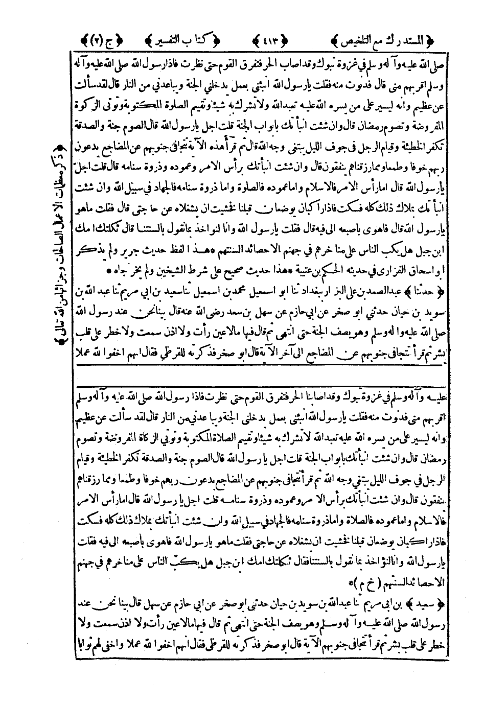 3549- حَدَّثَنَا عَبْدُ الصَّمَدِ بْنُ عَلِيٍّ الْبَزَّارِ ، بِبَغْدَادَ ، حَدَّثَنَا أَبُو إِسْمَاعِيلَ مُحَمَّدُ بْنُ إِسْمَاعِيلَ ، حَدَّثَنَا سَعِيدُ بْنُ أَبِي مَرْيَمَ ، حَدَّثَنَا عَبْدُ اللهِ بْنُ سُوَيْدِ بْنِ حَيَّانَ ، حَدَّثَنِي أَبُو صَخْرٍ ، عَنْ أَبِي حَازِمٍ ، عَنْ سَهْلِ بْنِ سَعْدٍ رَضِيَ اللَّهُ عَنْهُ ، قَالَ : بَيْنَا نَحْنُ عِنْدَ رَسُولِ اللهِ صَلَّى اللَّهُ عَلَيْهِ وَسَلَّمَ وَهُوَ يَصِفُ الْجَنَّةَ حَتَّى انْتَهَى ، ثُمَّ قَالَ : فِيهَا مَا لاَ عَيْنٌ رَأَتْ وَلاَ أُذُنٌ سَمِعَتْ وَلاَ خَطَرَ عَلَى قَلْبِ بَشَرٍ ، ثُمَّ قَرَأَ {تَتَجَافَى جُنُوبُهُمْ عَنِ الْمَضَاجِعِ} إِلَى آخِرِ الآيَةِ قَالَ أَبُو صَخْرٍ : فَذَكَرْتُهُ لِلْقُرَظِيِّ فَقَالَ : إِنَّهُمْ أَخْفَوْا لِلَّهِ عَمَلاً وَأَخْفَى لَهُمْ ثَوَابًا فَقَدِمُوا عَلَى اللهِ فَقَرَّتْ تِلْكَ الأَعْيُنُ.