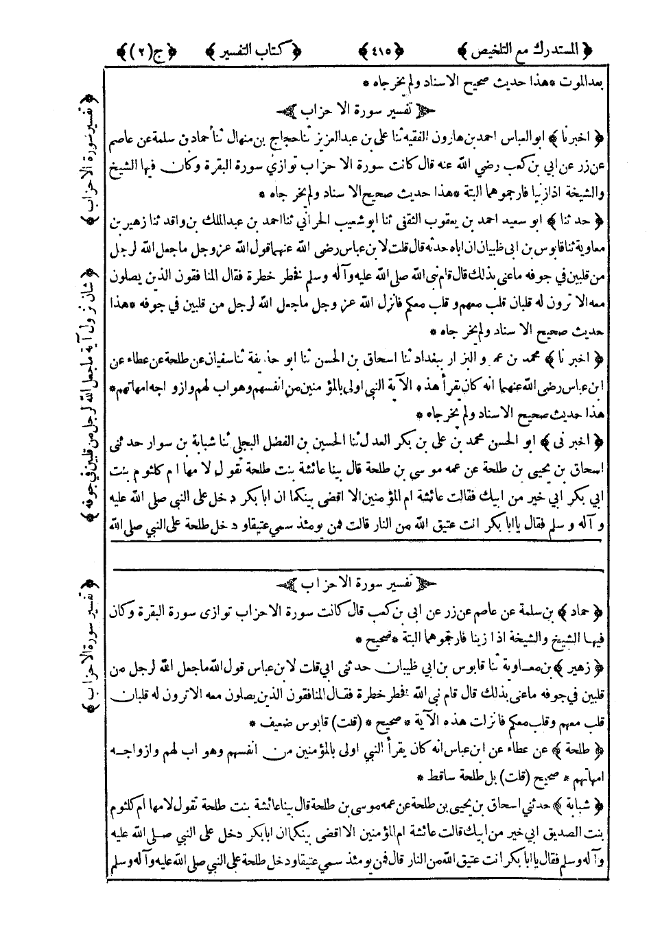 3554- أَخْبَرَنَا أَبُو الْعَبَّاسِ أَحْمَدُ بْنُ هَارُونَ الْفَقِيهُ ، حَدَّثَنَا عَلِيُّ بْنُ عَبْدِ الْعَزِيزِ ، حَدَّثَنَا حَجَّاجُ بْنُ مِنْهَالٍ ، حَدَّثَنَا حَمَّادُ بْنُ سَلَمَةَ ، عَنْ عَاصِمٍ ، عَنْ زِرٍّ ، عَنْ أُبَيِّ بْنِ كَعْبٍ رَضِيَ اللَّهُ عَنْهُ ، قَالَ : كَانَتْ سُورَةُ الأَحْزَابِ تُوَازِي سُورَةَ الْبَقَرَةِ وَكَانَ فِيهَا : الشَّيْخُ وَالشَّيْخَةُ إِذَا زَنَيَا فَارْجُمُوهُمَا الْبَتَّةَ.