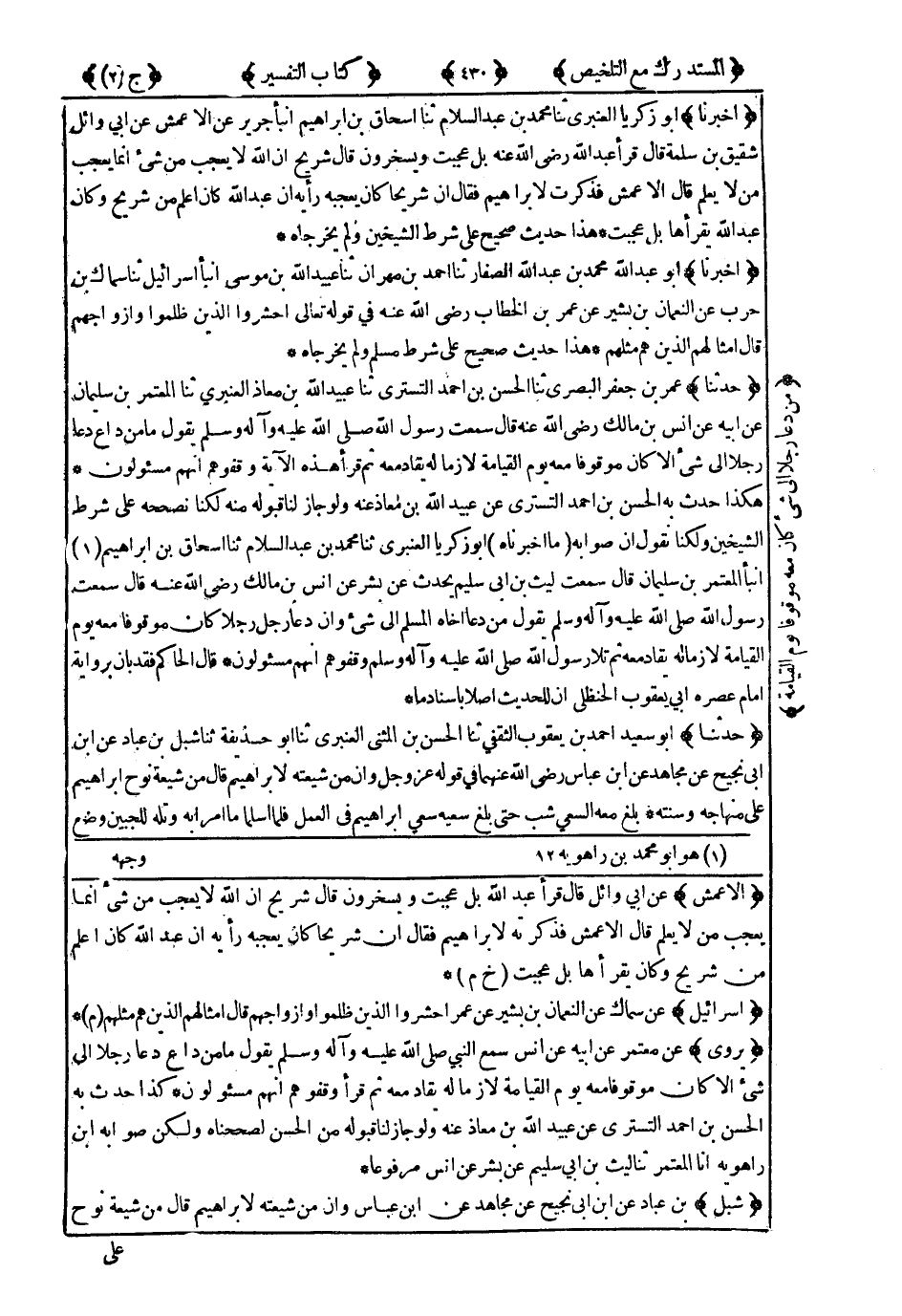 3612- حَدَّثَنَا أَبُو سَعِيدٍ أَحْمَدُ بْنُ يَعْقُوبَ الثَّقَفِيُّ ، حَدَّثَنَا الْحَسَنُ بْنُ الْمُثَنَّى الْعَنْبَرِيُّ ، حَدَّثَنَا أَبُو حُذَيْفَةَ ، حَدَّثَنَا شِبْلُ بْنُ عَبَّادٍ ، عَنِ ابْنِ أَبِي نَجِيحٍ ، عَنْ مُجَاهِدٍ ، عَنِ ابْنِ عَبَّاسٍ رَضِيَ اللَّهُ عَنْهُمَا ، فِي قَوْلِهِ عَزَّ وَجَلَّ {وَإِنَّ مِنْ شِيعَتِهِ لِإِبْرَاهِيمَ} قَالَ : مِنْ شِيعَةِ نُوحٍ إِبْرَاهِيمُ عَلَى مِنْهَاجِهِ وَسُنَّتِهِ بَلَغَ مَعَهُ السَّعْيَ شَبَّ حَتَّى بَلَغَ سَعْيُهُ سَعْيَ إِبْرَاهِيمَ فِي الْعَمَلِ ، فَلَمَّا أَسْلَمَا مَا أُمِرَا بِهِ وَتَلَّهُ لِلْجَبِينِ وَضَعَ وَجْهَهُ إِلَى الأَرْضِ فَقَالَ : لاَ تَذْبَحْنِي وَأَنْتَ تَنْظُرُ عَسَى أَنْ تَرْحَمَنِي فَلاَ تُجْهِزْ عَلَيَّ ارْبُطْ يَدَيَّ إِلَى رَقَبَتِي ، ثُمَّ ضَعْ وَجْهِي عَلَى الأَرْضِ فَلَمَّا أَدْخَلَ يَدَهُ لِيَذْبَحَهُ فَلَمْ يَحُكَّ الْمُدْيَةَ حَتَّى نُودِيَ {أَنْ يَا إِبْرَاهِيمُ قَدْ صَدَّقْتَ الرُّؤْيَا} فَأَمْسَكَ يَدَهُ وَرَفَعَ قَوْلُهُ {وَفَدَيْنَاهُ بِذِبْحٍ عَظِيمٍ} بِكَبْشٍ عَظِيمٍ مُتَقَبَّلٍ وَزَعَمَ ابْنُ عَبَّاسٍ أَنَّ الذَّبِيحَ إِسْمَاعِيلُ.