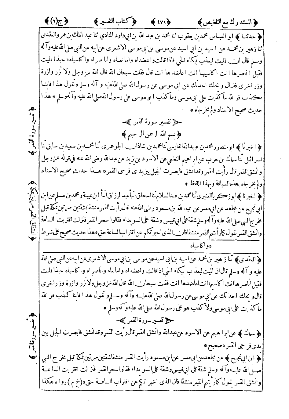 هَذَا حَدِيثٌ صَحِيحٌ عَلَى شَرْطِ الشَّيْخَيْنِ وَلَمْ يُخَرِّجَاهُ بِهَذِهِ السِّيَاقَةِ إِنَّمَا اتَّفَقَا عَلَى حَدِيثِ أَبِي مَعْمَرٍ عَنْ عَبْدِ اللهِ مُخْتَصَرًا وَهَذَا حَدِيثٌ لاَ نَسْتَغْنِي فِيهِ عَنْ مُتَابَعَةِ الصَّحَابَةِ بَعْضٍ لِبَعْضٍ لِمُغَايَظَةِ أَهْلِ الإِلْحَادِ ، فَإِنَّهُ أَوَّلُ آيَاتِ الشَّرِيعَةِ فَنَظَرْتُ فَإِذَا فِي الْبَابِ مِمَّا لَمْ يُخَرِّجَاهُ عَنْ عَبْدِ اللهِ بْنِ عَبَّاسٍ وَعَبْدِ اللهِ بْنِ عَمْرٍو وَجُبَيْرِ بْنِ مُطْعِمٍ رَضِيَ اللَّهُ عَنْهُمْ وَلَمْ يُخَرِّجَاهُ مِنْهَا إِلاَّ حَدِيثُ أَنَسٍ.
