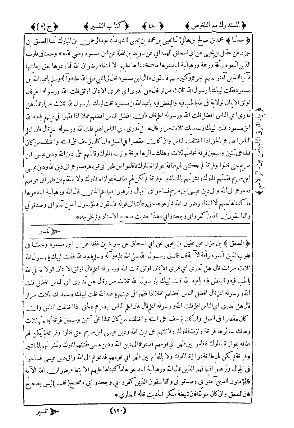 3790- حَدَّثَنَا مُحَمَّدُ بْنُ صَالِحِ بْنِ هَانِئٍ ، حَدَّثَنَا يَحْيَى بْنُ مُحَمَّدِ بْنِ يَحْيَى الشَّهِيدُ ، حَدَّثَنَا عَبْدُ الرَّحْمَنِ بْنُ الْمُبَارَكِ ، حَدَّثَنَا الصَّعْقُ بْنُ حَزْنٍ ، عَنْ عَقِيلِ بْنِ يَحْيَى ، عَنْ أَبِي إِسْحَاقَ الْهَمْدَانِيِّ ، عَنْ سُوَيْدِ بْنِ غَفَلَةَ ، عَنِ ابْنِ مَسْعُودٍ رَضِيَ اللَّهُ عَنْهُ ، {وَجَعَلْنَا فِي قُلُوبِ الَّذِينَ اتَّبَعُوهُ رَأْفَةً وَرَحْمَةً وَرَهْبَانِيَّةً ابْتَدَعُوهَا مَا كَتَبْنَاهَا عَلَيْهِمْ إِلاَّ ابْتِغَاءَ رِضْوَانِ اللهِ فَمَا رَعَوْهَا حَقَّ رِعَايَتِهَا ، فَآتَيْنَا الَّذِينَ آمَنُوا مِنْهُمْ أَجْرَهُمْ وَكَثِيرٌ مِنْهُمْ فَاسِقُونَ} قَالَ ابْنُ مَسْعُودٍ : قَالَ لِيَ النَّبِيُّ صَلَّى اللَّهُ عَلَيْهِ وَسَلَّمَ : يَا عَبْدَ اللهِ بْنَ مَسْعُودٍ فَقُلْتُ : لَبَّيْكَ يَا رَسُولَ اللهِ ، ثَلاَثَ مِرَارٍ ، قَالَ : هَلْ تَدْرِي أَيُّ عُرَى الإِيمَانِ أَوْثَقُ ؟ قُلْتُ : اللَّهُ وَرَسُولُهُ أَعْلَمُ . قَالَ : أَوْثَقُ الإِيمَانِ الْوَلاَيَةُ فِي اللهِ بِالْحَبِّ فِيهِ وَالْبُغْضِ فِيهِ ، يَا عَبْدَ اللهِ بْنَ مَسْعُودٍ قُلْتُ : لَبَّيْكَ يَا رَسُولَ اللهِ ، ثَلاَثَ مِرَارٍ ، قَالَ : هَلْ تَدْرِي أَيُّ النَّاسِ أَفْضَلُ ؟ قُلْتُ : اللَّهُ وَرَسُولُهُ أَعْلَمُ . قَالَ : فَإِنَّ أَفْضَلَ النَّاسِ أَفْضَلُهُمْ عَمَلاً إِذَا فَقِهُوا فِي دِينِهِمْ ، يَا عَبْدَ اللهِ بْنَ مَسْعُودٍ قُلْتُ : لَبَّيْكَ وَسَعْدَيْكَ ، ثَلاَثَ مِرَارٍ ، قَالَ : هَلْ تَدْرِي أَيُّ النَّاسِ أَعْلَمُ ؟ قُلْتُ : اللَّهُ وَرَسُولُهُ أَعْلَمُ . قَالَ : فَإِنَّ أَعْلَمَ النَّاسِ أَبْصَرُهُمْ بِالْحَقِّ إِذَا اخْتَلَفَتِ النَّاسُ ، وَإِنْ كَانَ مُقَصِّرًا فِي الْعَمَلِ وَإِنْ كَانَ يَزْحَفُ عَلَى اسْتِهِ ، وَاخْتَلَفَ مَنْ كَانَ قَبْلَنَا عَلَى اثْنَتَيْنِ وَسَبْعِينَ فِرْقَةً نَجَا مِنْهَا ثَلاَثٌ ، وَهَلَكَ سَائِرُهَا ، فِرْقَةٌ وَازَتِ الْمُلُوكَ وَقَاتَلَتْهُمْ عَلَى دِينِ اللهِ وَدِينِ عِيسَى ابْنِ مَرْيَمَ حَتَّى قُتِلُوا ، وَفِرْقَةٌ لَمْ يَكُنْ لَهُمْ طَاقَةٌ بِمُوَازَاةِ الْمُلُوكِ فَأَقَامُوا بَيْنَ ظَهْرَانَيْ قَوْمِهِمْ فَدَعَوْهُمْ إِلَى دِينِ اللهِ وَدِينِ عِيسَى ابْنِ مَرْيَمَ فَقَتَلَتْهُمُ الْمُلُوكُ ، وَنَشَرَتْهُمْ بِالْمَنَاشِيرِ ، وَفِرْقَةٌ لَمْ يَكُنْ لَهُمْ طَاقَةٌ بِمُوَازَاةِ الْمُلُوكِ وَلاَ بِالْمُقَامِ بَيْنَ ظَهْرَانَيْ قَوْمِهِمْ فَدَعَوْهُمْ إِلَى اللهِ وَإِلَى دِينِ عِيسَى ابْنِ مَرْيَمَ فَسَاحُوا فِي الْجِبَالِ وَتَرَهَّبُوا فِيهَا فَهُمُ الَّذِينَ قَالَ اللَّهُ {وَرَهْبَانِيَّةً ابْتَدَعُوهَا مَا كَتَبْنَاهَا عَلَيْهِمْ إِلاَّ ابْتِغَاءَ رِضْوَانِ اللهِ فَمَا رَعَوْهَا حَقَّ رِعَايَتِهَا} إِلَى قَوْلِهِ {فَاسِقُونَ} فَالْمُؤْمِنُونَ الَّذِينَ آمَنُوا بِي وَصَدَّقُونِي وَالْفَاسِقُونَ الَّذِينَ كَفَرُوا بِي وَجَحَدُوا بِي.
