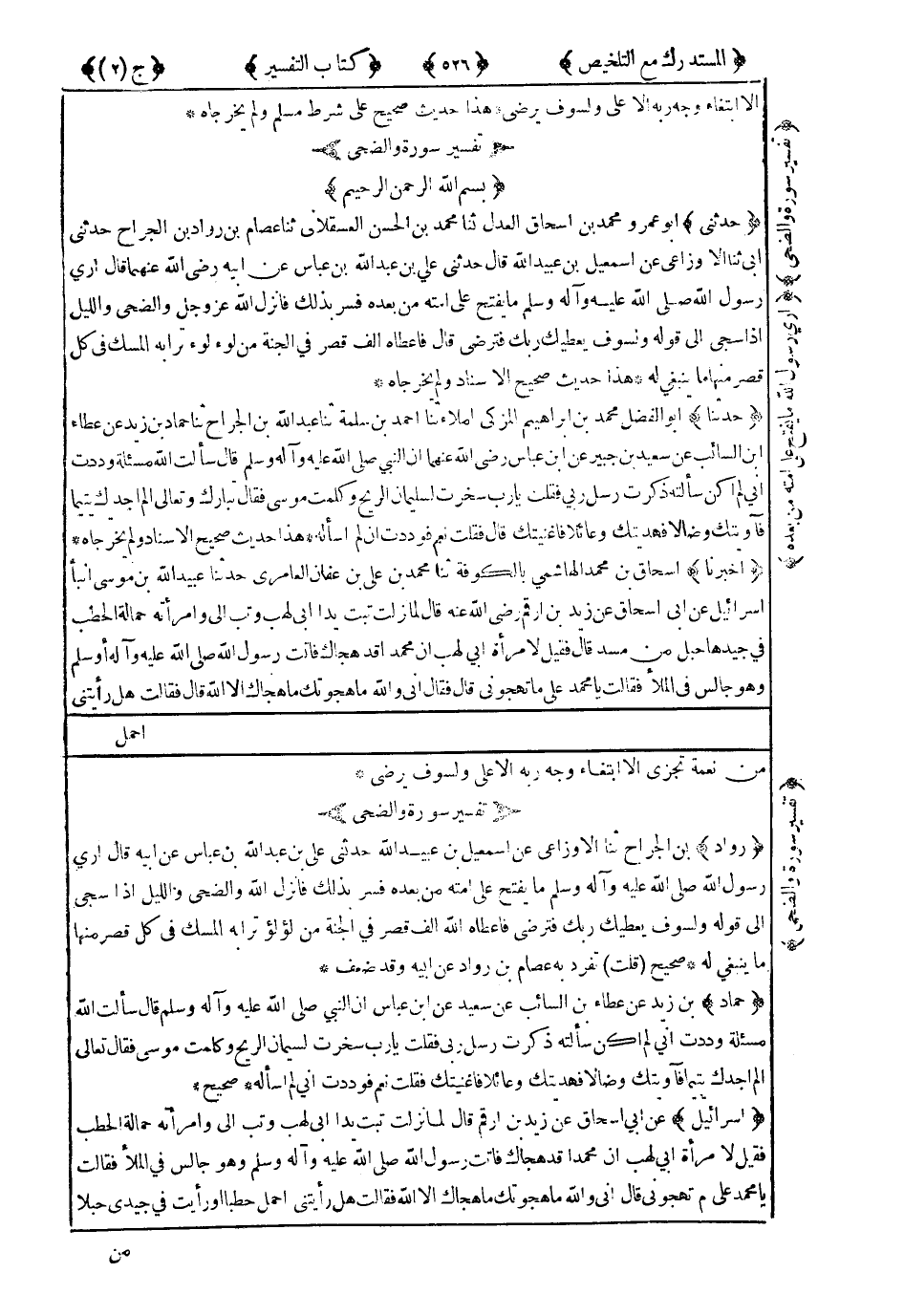 3943- حَدَّثَنِي أَبُو عَمْرٍو مُحَمَّدُ بْنُ إِسْحَاقَ الْعَدْلُ ، حَدَّثَنَا مُحَمَّدُ بْنُ الْحَسَنِ الْعَسْقَلاَنِيُّ ، حَدَّثَنَا عِصَامُ بْنُ رَوَّادِ بْنِ الْجَرَّاحِ ، حَدَّثَنِي أَبِي ، حَدَّثَنَا الأَوْزَاعِيُّ ، عَنْ إِسْمَاعِيلَ بْنِ عُبَيْدِ اللهِ ، قَالَ : حَدَّثَنِي عَلِيُّ بْنُ عَبْدِ اللهِ بْنِ عَبَّاسٍ ، عَنْ أَبِيهِ رَضِيَ اللَّهُ عَنْهُمَا ، قَالَ : أُرِيَ رَسُولُ اللهِ صَلَّى اللَّهُ عَلَيْهِ وَسَلَّمَ مَا يُفْتَحُ عَلَى أُمَّتِهِ مِنْ بَعْدِهِ ، فَسُرَّ بِذَلِكَ فَأَنْزَلَ اللَّهُ عَزَّ وَجَلَّ وَالضُّحَى وَاللَّيْلِ إِذَا سَجَى إِلَى قَوْلِهِ {وَلَسَوْفَ يُعْطِيكَ رَبُّكَ فَتَرْضَى} قَالَ : فَأَعْطَاهُ أَلْفَ قَصْرٍ فِي الْجَنَّةِ مِنْ لُؤْلُؤٍ تُرَابُهُ الْمِسْكُ فِي كُلِّ قَصْرٍ مِنْهَا مَا يَنْبَغِي لَهُ.