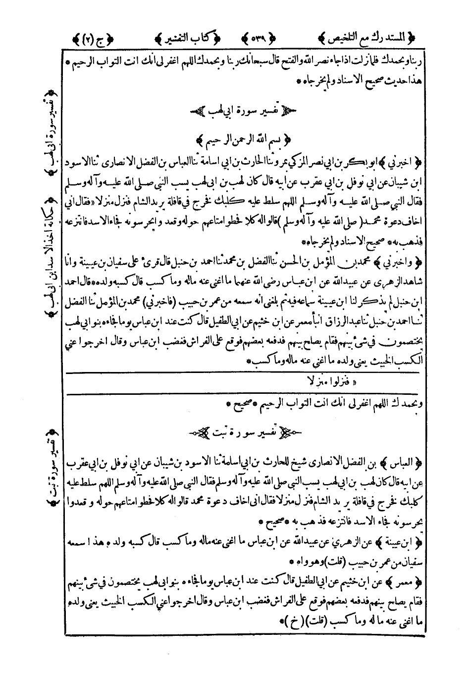 3985- وَأَخْبَرَنِي مُحَمَّدُ بْنُ الْمُؤَمَّلِ بْنِ الْحَسَنِ ، حَدَّثَنَا الْفَضْلُ بْنُ مُحَمَّدٍ ، حَدَّثَنَا أَحْمَدُ بْنُ حَنْبَلٍ ، قَالَ : قُرِئَ عَلَى سُفْيَانَ بْنِ عُيَيْنَةَ وَأَنَا شَاهِدٌ الزُّهْرِيُّ ، عَنْ عُبَيْدِ اللهِ ، عَنِ ابْنِ عَبَّاسٍ رَضِيَ اللَّهُ عَنْهُمَا ، {مَا أَغْنَى عَنْهُ مَالُهُ وَمَا كَسَبَ} قَالَ : كَسْبُهُ وَلَدُهُ.