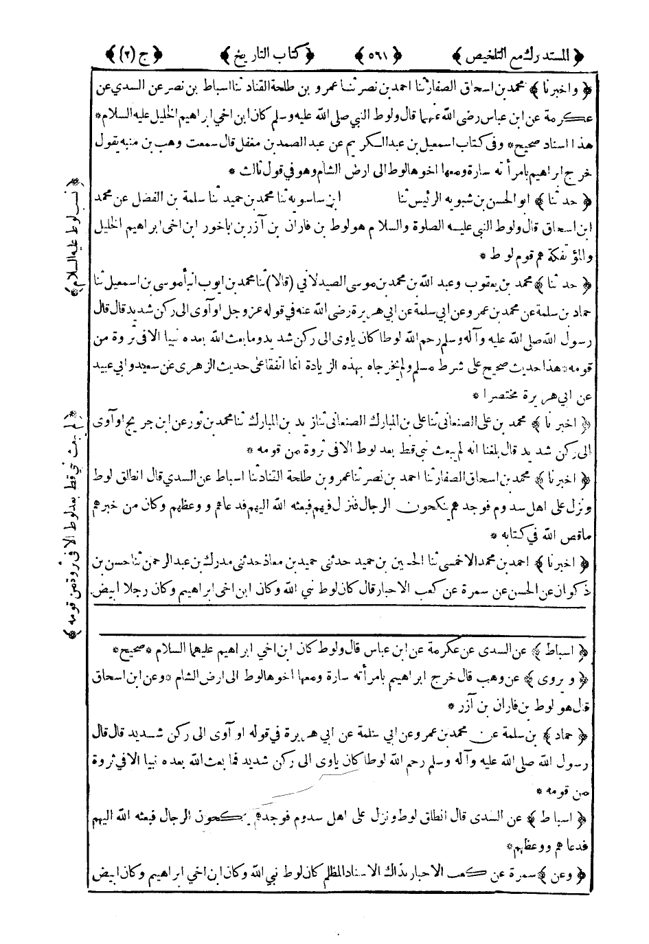 4052- وَأَخْبَرَنَا مُحَمَّدُ بْنُ إِسْحَاقَ الصَّفَّارُ ، حَدَّثَنَا أَحْمَدُ بْنُ نَصْرٍ ، حَدَّثَنَا عَمْرُو بْنُ طَلْحَةَ الْقَنَّادُ ، حَدَّثَنَا أَسْبَاطُ بْنُ نَصْرٍ ، عَنِ السُّدِّيِّ ، عَنْ عِكْرِمَةَ ، عَنِ ابْنِ عَبَّاسٍ رَضِيَ اللَّهُ عَنْهُمَا ، قَالَ : وَلُوطٌ النَّبِيُّ صَلَّى اللَّهُ عَلَيْهِ وَسَلَّمَ كَانَ ابْنَ أَخِي إِبْرَاهِيمَ الْخَلِيلِ عَلَيْهِ السَّلاَمُ.