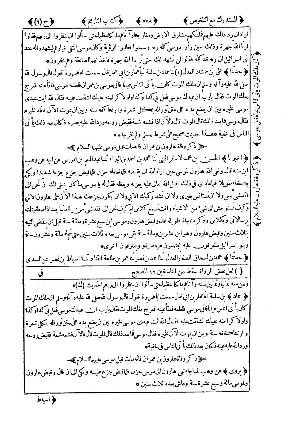 4108- أَخْبَرَنَا الْحَسَنُ بْنُ مُحَمَّدٍ الإِسْفَرَايِينِيُّ ، حَدَّثَنَا مُحَمَّدُ بْنُ أَحْمَدَ بْنِ الْبَرَاءِ ، حَدَّثَنَا عَبْدُ الْمُنْعِمِ بْنُ إِدْرِيسَ ، عَنْ أَبِيهِ ، عَنْ وَهْبِ بْنِ مُنَبِّهِ ، قَالَ : وَنَعَى اللَّهُ هَارُونَ لِمُوسَى حِينَ أَرَادَ اللَّهُ أَنْ يَقْبِضَهُ ، فَلَمَّا نَعَاهُ لَهُ حَزِنَ ، فَلَمَّا قُبِضَ جَزَعَ جَزَعًا شَدِيدًا وَبَكَى بُكَاءً طَوِيلاً ، فَلَمَّا عَادَ فِي ذَلِكَ أَقْبَلَ اللَّهُ تَعَالَى عَلَيْهِ يُعَزِّيهِ وَيَعِظُهً فَقَالَ لَهُ : يَا مُوسَى مَا كَانَ يَنْبَغِي لَكَ أَنْ تَحِنَّ إِلَى فَقْدِ شَيْءٍ مَعِي وَلاَ أَنْ تَسْتَأْنِسَ بِغَيْرِي ، وَلاَ أَنْ تُشَدَّ رُكَبَكَ إِلاَّ بِي ، وَلاَ أَنْ يَكُونَ جَزَعُكَ هَذَا الآنَ عَلَى هَارُونَ إِلاَّ لِي ، وَكَيْفَ تَسْتَوْحِشُ إِلَى شَيْءٍ مِنَ الأَشْيَاءِ ، وَأَنْتَ تَسْمَعُ كَلاَمِي أَمْ كَيْفَ تَحِنُّ إِلَى فَقْدِ شَيْءٍ مِنَ الدُّنْيَا بَعْدَ إِذِ اصْطَفَيْتُكَ بِرِسَالاَتِي وَبِكَلاَمِي وَذَكَرَ مُنَاجَاةً طَوِيلَةً قَالَ وَقُبِضَ هَارُونُ وَمُوسَى ابْنُ سَبْعَ عَشْرَةَ وَمِائَةِ سَنَةٍ قَبْلَ أَنْ يَنْقَضِيَ التِّيهُ بِثَلاَثِ سِنِينَ ، وَقُبِضَ هَارُونُ وَهُوَ ابْنُ عِشْرِينَ وَمِائَةِ سَنَةٍ بَقِيَ مُوسَى بَعْدَهُ ثَلاَثَ سِنِينَ حَتَّى ، تَمَّ لَهُ مِائَةٌ وَعِشْرُونَ سَنَةً وَبَنُو إِسْرَائِيلَ مُتَفَرِّقُونَ عَلَيْهِ يَجْتَمِعُونَ عَلَيْهِ مَرَّةً وَيَفْتَرِقُونَ أُخْرَى.