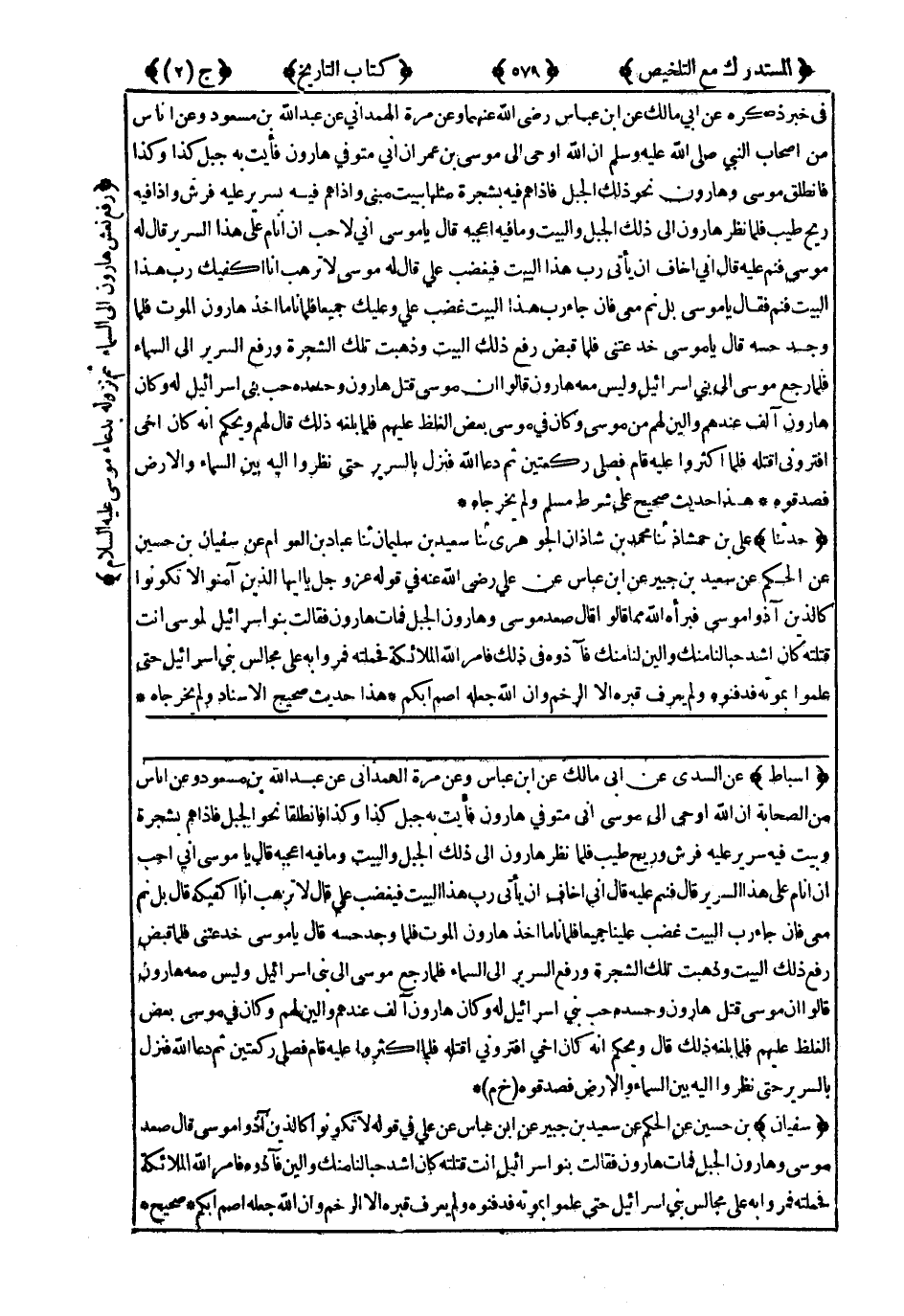 إِنَّ اللَّهَ أَوْحَى إِلَى مُوسَى بْنِ عِمْرَانَ إِنِّي مُتَوَفِّي هَارُونَ ، فَأْتِ بِهِ جَبَلَ كَذَا وَكَذَا فَانْطَلَقَ مُوسَى وَهَارُونُ نَحْوَ ذَلِكَ الْجَبَلِ ، فَإِذَا هُمْ بِشَجَرَةٍ مَثَّلَهَا بِبَيْتٍ مَبْنِيٍّ ، وَإِذَا هُمْ فِيهِ بِسَرِيرٍ عَلَيْهِ فُرُشٌ ، وَإِذَا فِيهِ رِيحٌ طَيِّبٌ ، فَلَمَّا نَظَرَ هَارُونُ إِلَى ذَلِكَ الْجَبَلِ وَالْبَيْتِ وَمَا فِيهِ أَعْجَبَهُ ، وَقَالَ : يَا مُوسَى إِنِّي لاَُحِبُّ أَنْ أَنَامَ عَلَى هَذَا السَّرِيرِ ، قَالَ لَهُ مُوسَى : فَنَمْ عَلَيْهِ ، قَالَ : إِنِّي أَخَافُ أَنْ يَأْتِيَ رَبُّ هَذَا الْبَيْتِ فَيَغْضَبَ عَلَيَّ . قَالَ لَهُ مُوسَى : لاَ تَرْهَبْ أَنَا أَكْفِيكَ رَبَّ هَذَا الْبَيْتِ فَنَمْ ، فَقَالَ : يَا مُوسَى بَلْ نَمْ مَعِي ، فَإِنْ جَاءَ رَبُّ هَذَا الْبَيْتِ غَضِبَ عَلَيَّ وَعَلَيْكَ جَمِيعًا ، فَلَمَّا نَامَا أَخَذَ هَارُونَ الْمَوْتُ ، فَلَمَّا وَجَدَ حِسَّهُ ، قَالَ : يَا مُوسَى خَدَعَتْنِي ، فَلَمَّا قُبِضَ رُفِعَ ذَلِكَ الْبَيْتُ وَذَهَبَتْ تِلْكَ الشَّجَرَةُ وَرُفِعَ السَّرِيرُ إِلَى السَّمَاءِ ، فَلَمَّا رَجَعَ مُوسَى إِلَى بَنِي إِسْرَائِيلَ وَلَيْسَ مَعَهُ هَارُونُ قَالُوا : إِنَّ مُوسَى قَتَلَ هَارُونَ وَحَسَدَهُ حُبَّ بَنِي إِسْرَائِيلَ لَهُ ، وَكَانَ هَارُونُ آلَفَ عِنْدَهُمْ وَأَلْيَنَ لَهُمْ مِنْ مُوسَى ، وَكَانَ فِي مُوسَى بَعْضُ الْغِلَظِ عَلَيْهِمْ فَلَمَّا بَلَغَهُ ذَلِكَ ، قَالَ لَهُمْ : وَيْحَكُمْ إِنَّهُ كَانَ أَخِي أَفَتَرُونِي أَقْتُلُهُ ؟ فَلَمَّا أَكْثَرُوا عَلَيْهِ قَامَ فَصَلَّى رَكْعَتَيْنِ ، ثُمَّ دَعَا اللَّهَ فَنَزَلَ بِالسَّرِيرِ حَتَّى نَظَرُوا إِلَيْهِ بَيْنَ السَّمَاءِ وَالأَرْضِ فَصَدَّقُوهُ.